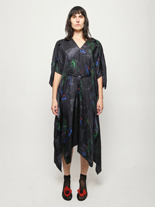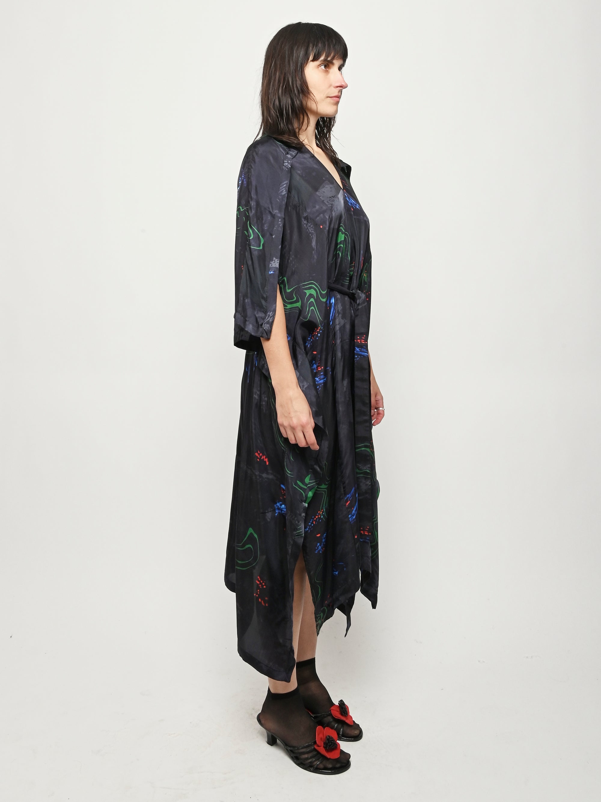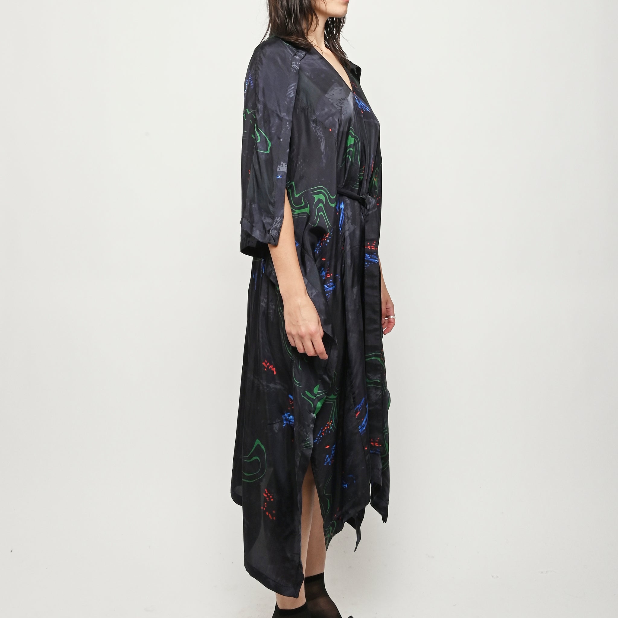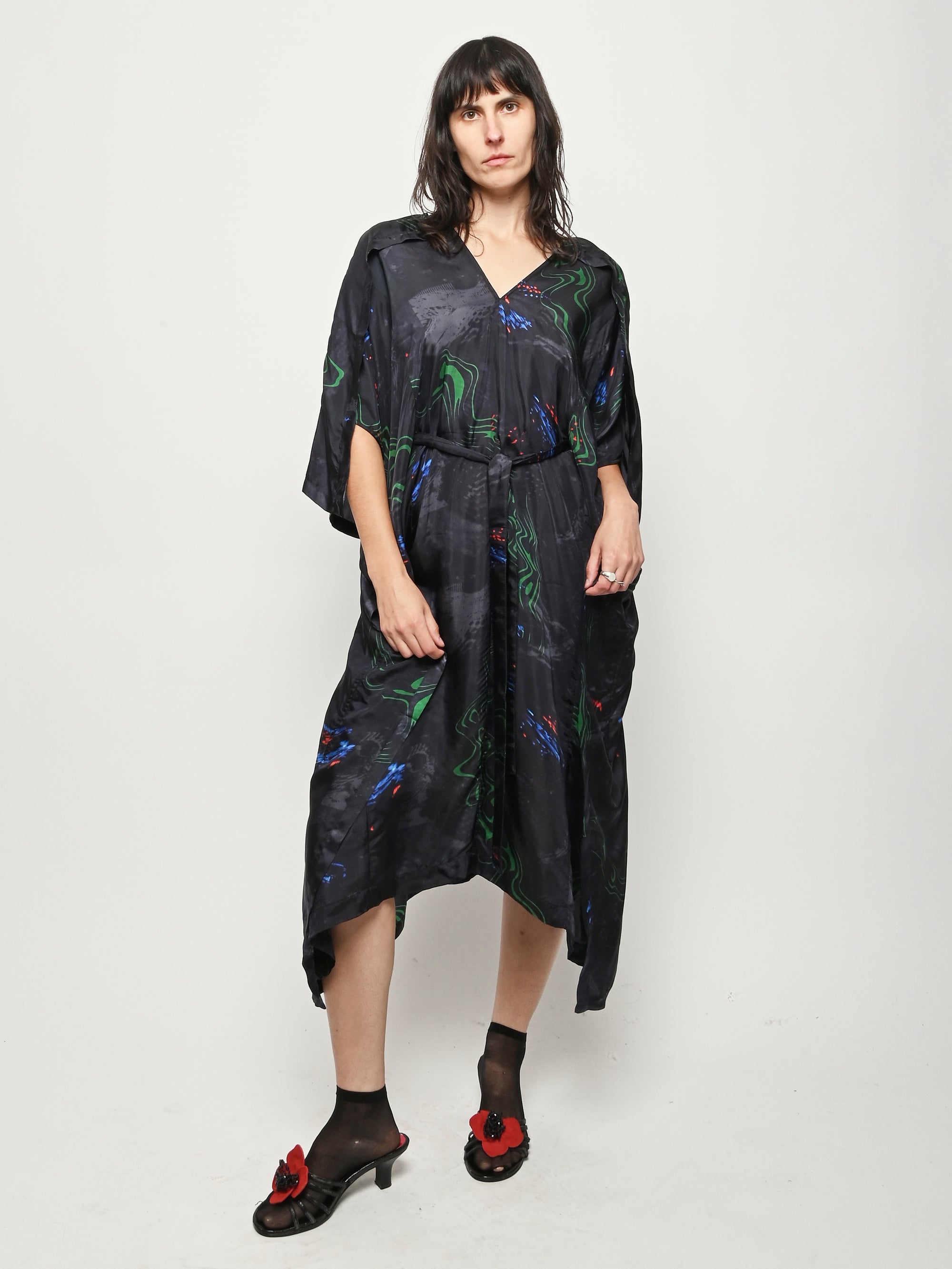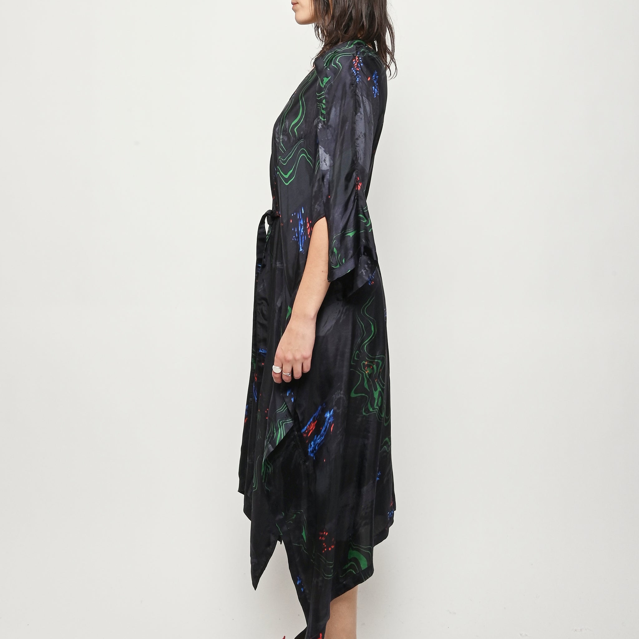 Henrik Vibskov's Uncut Kaftan is a loose v-neck style featuring short sleeves, a multicolor firework pattern, and an adjustable tie around waist.