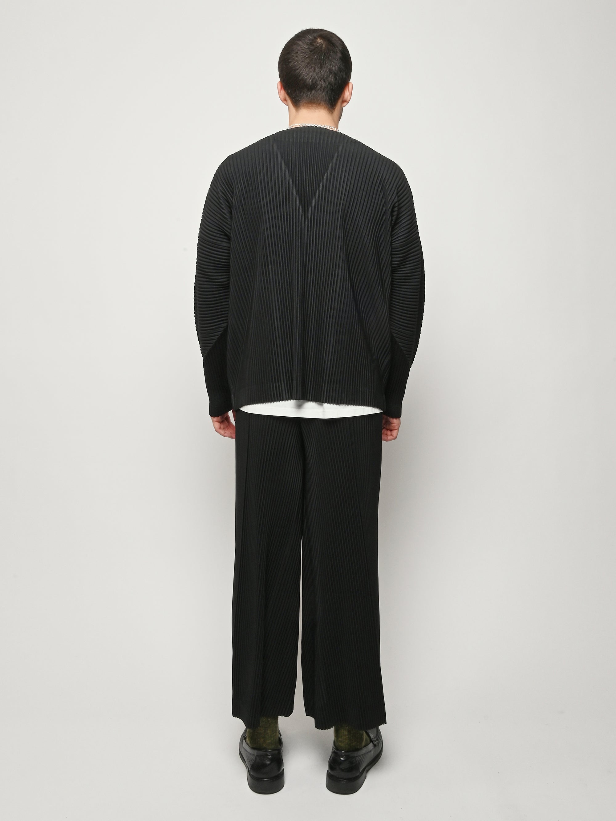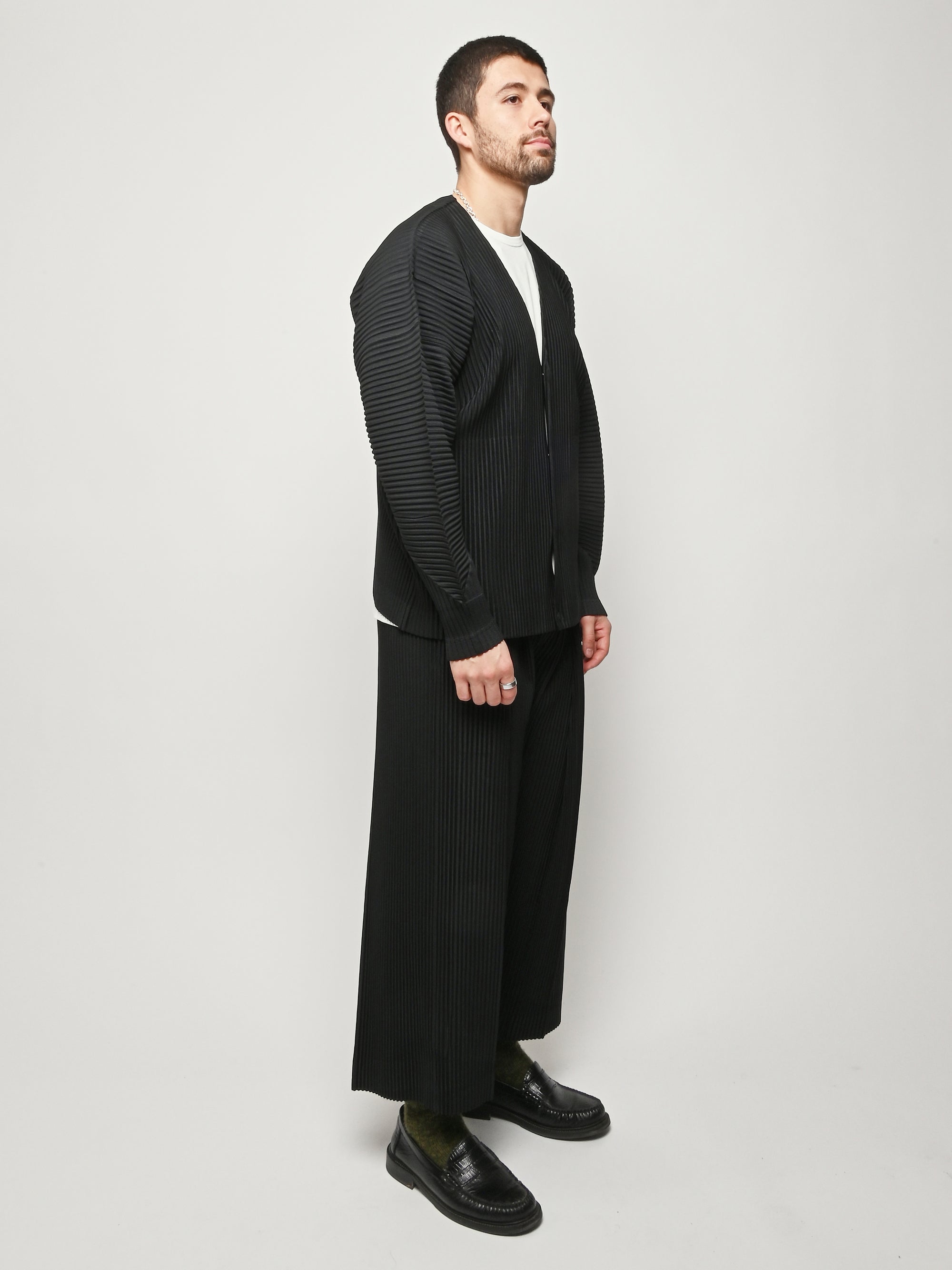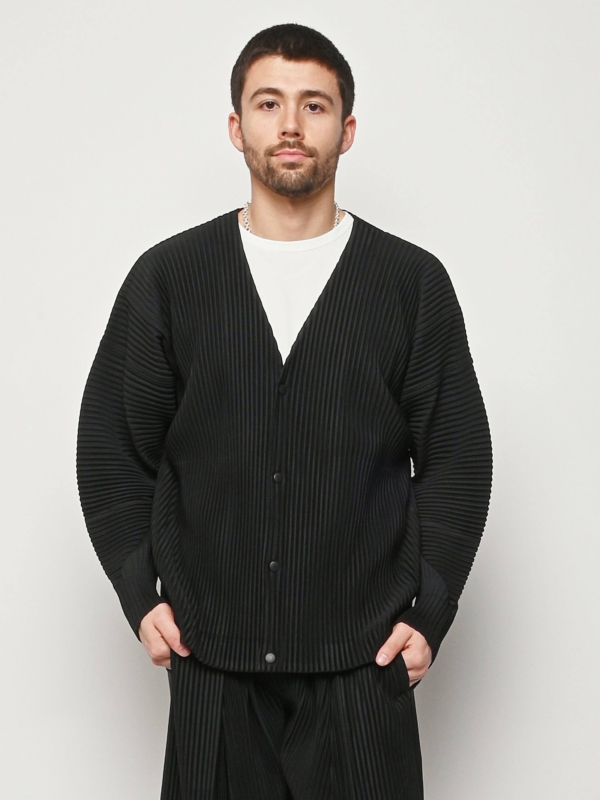 This long-sleeved cardigan is made from HOMME PLISSÉ ISSEY MIYAKE’s signature pleated jersey material. It offers portability and lightweight comfort, with the quick-drying property unique to polyester. It has a relaxed silhouette that complements a wide range of styles. It has pockets on both sides.
