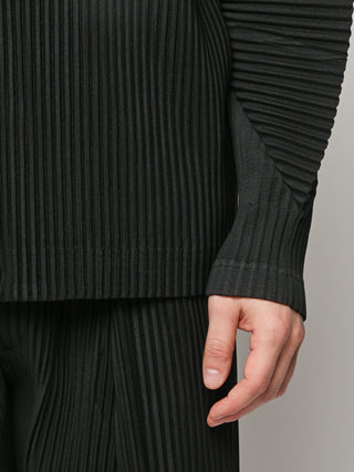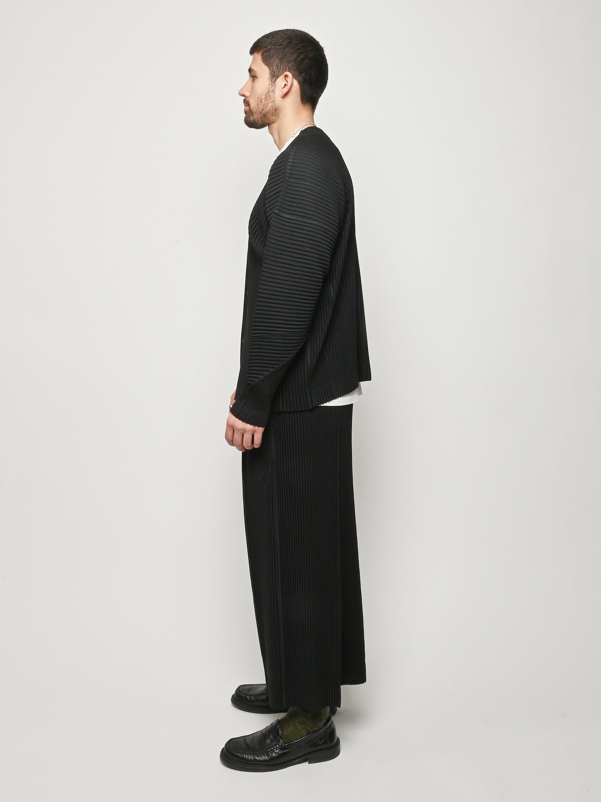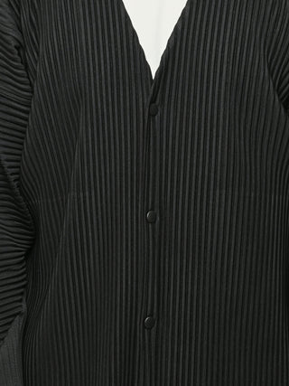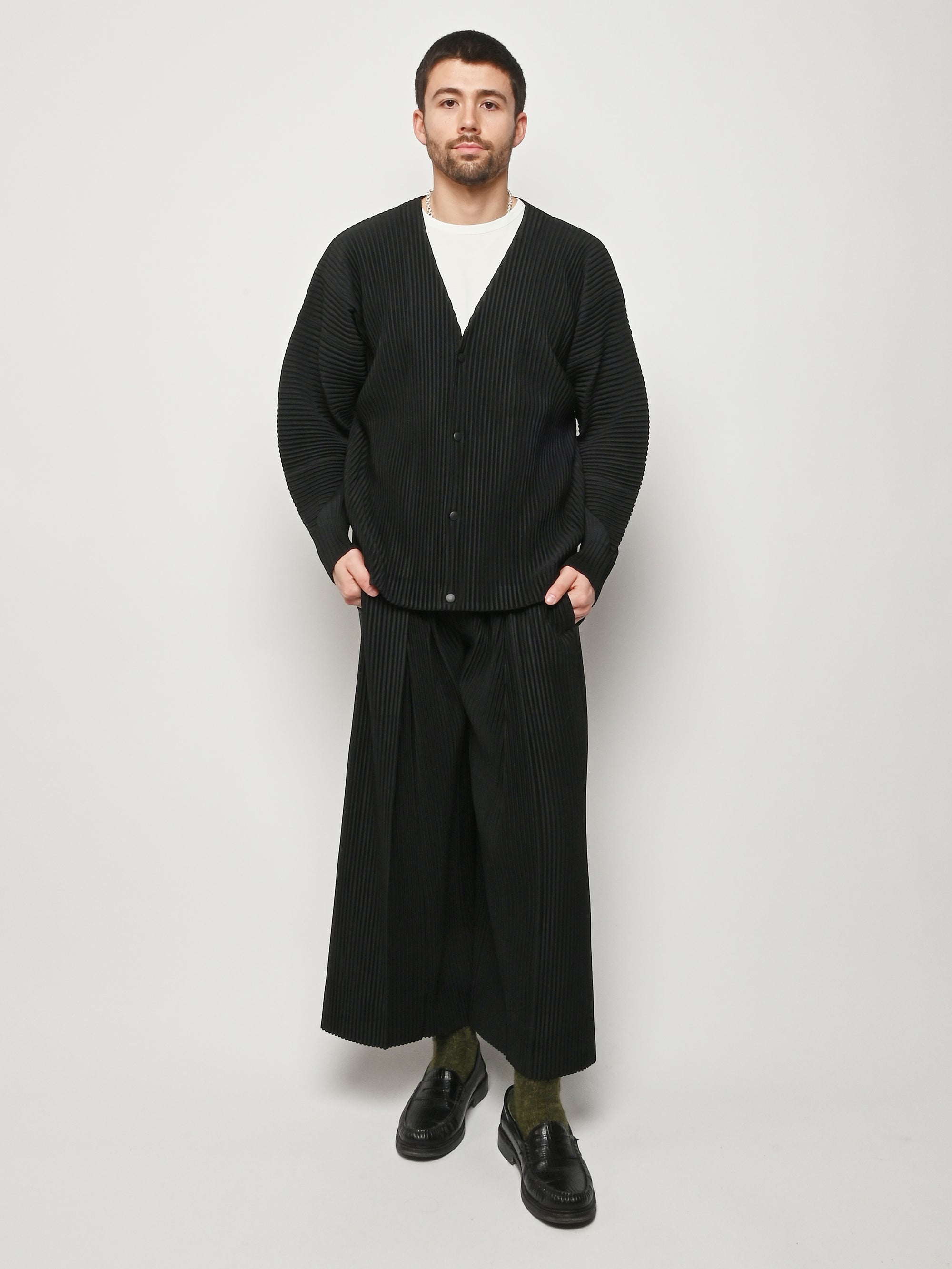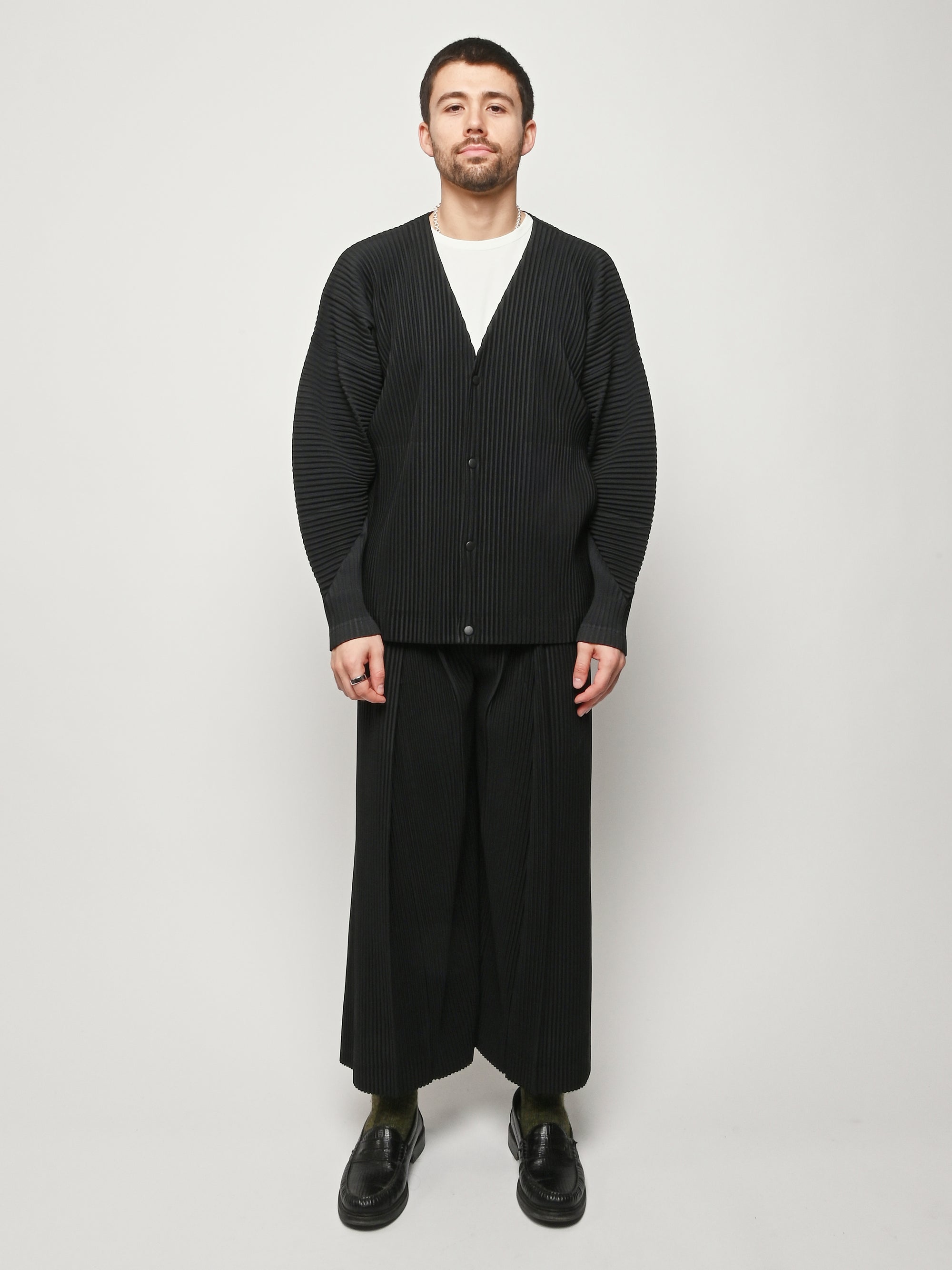 This long-sleeved cardigan is made from HOMME PLISSÉ ISSEY MIYAKE’s signature pleated jersey material. It offers portability and lightweight comfort, with the quick-drying property unique to polyester. It has a relaxed silhouette that complements a wide range of styles. It has pockets on both sides.