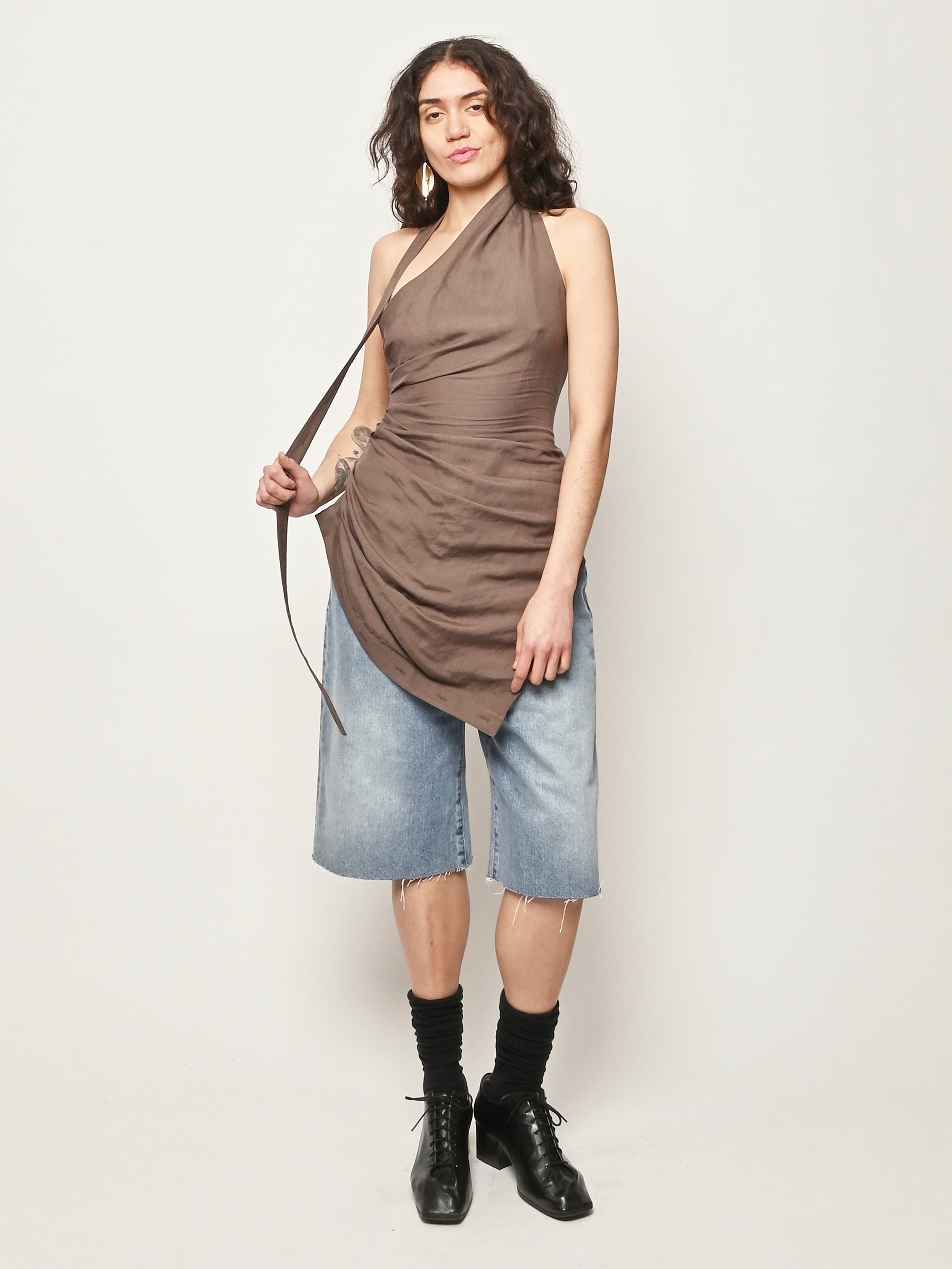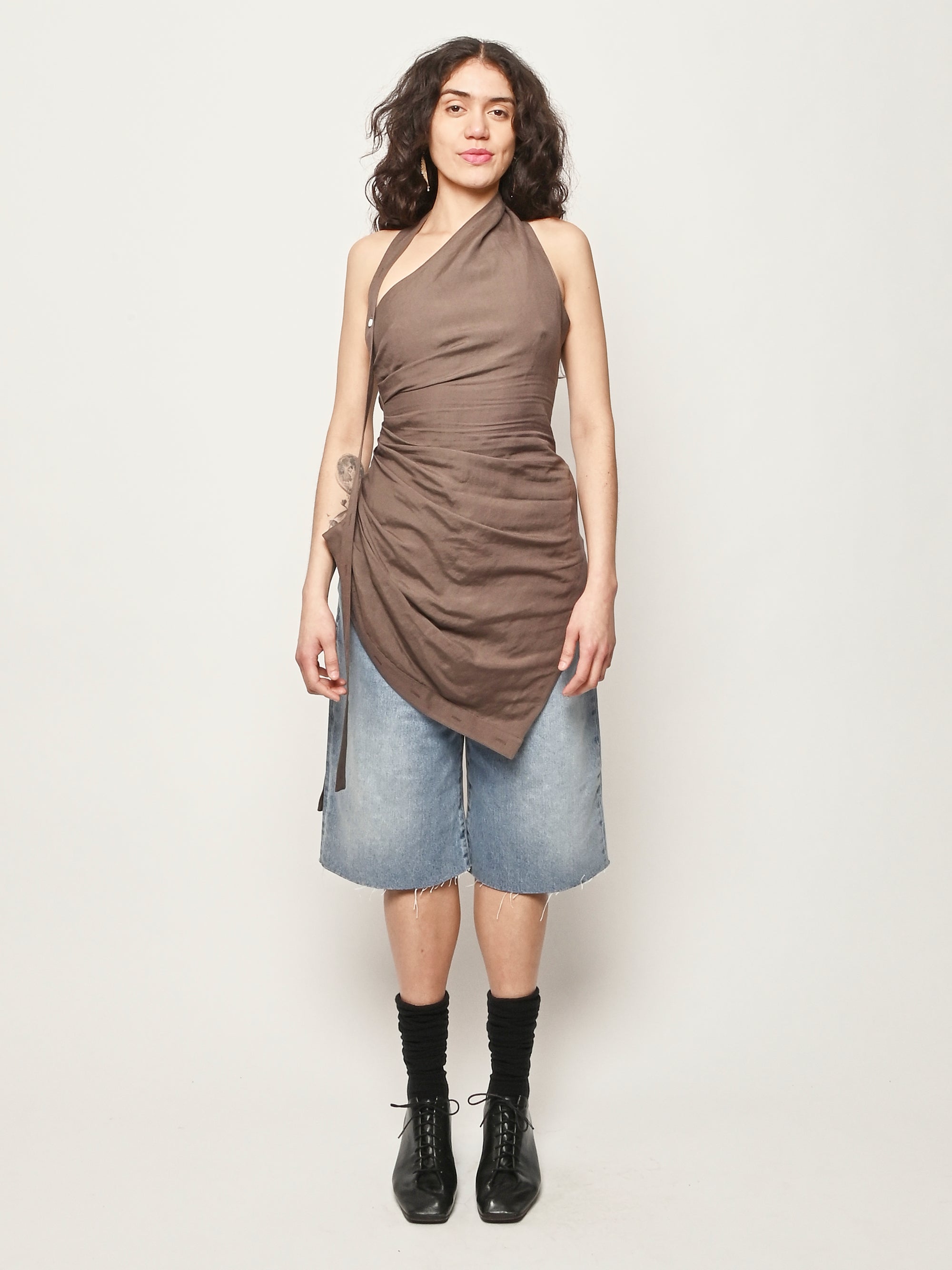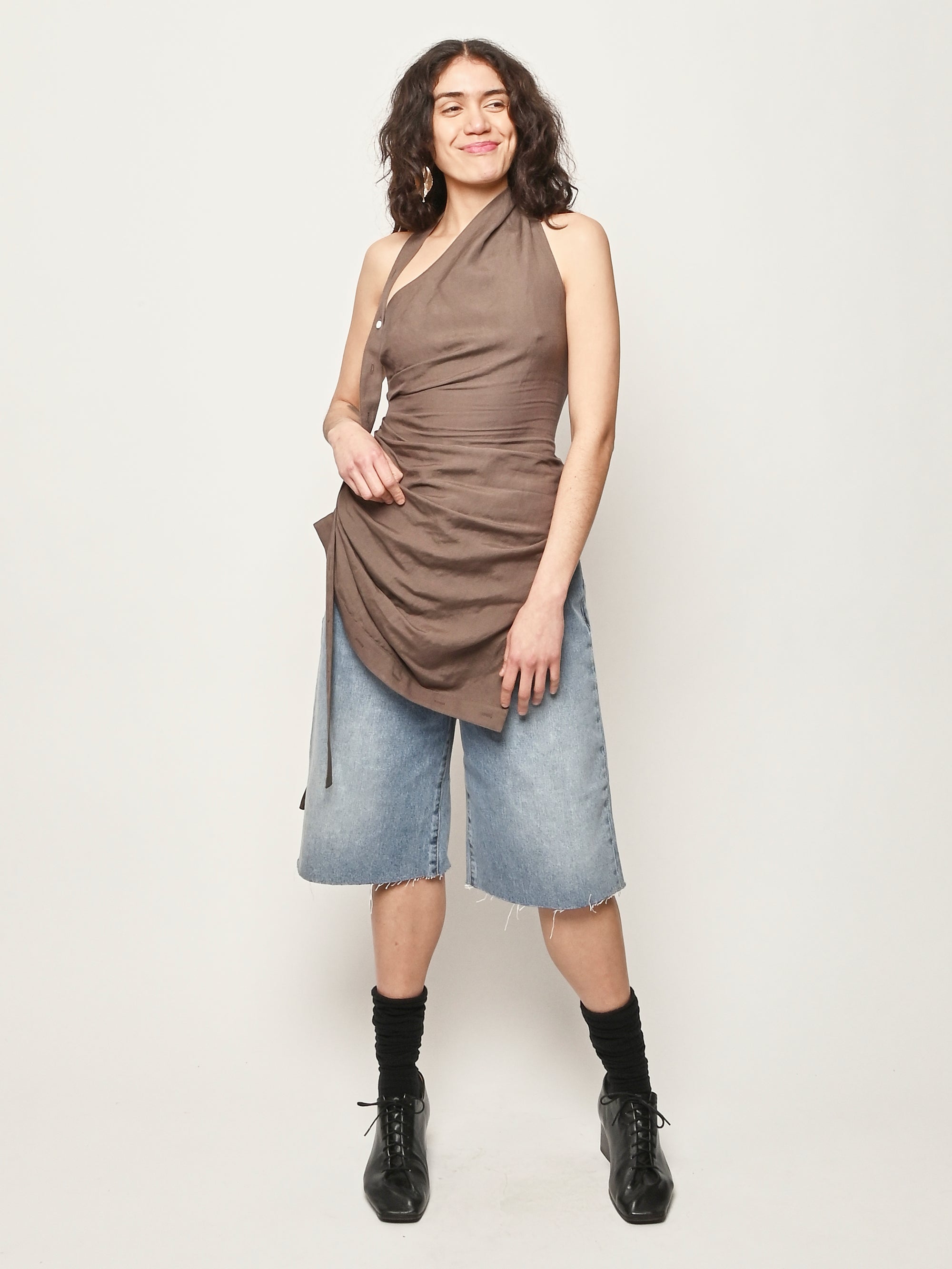Linen blend halter blouse from Jane Wade featuring layered pleated front and back drape with hike pleat placket side pick-up. It has a halter drape front neck panel with wrap over extended adjustable button placket neckline.