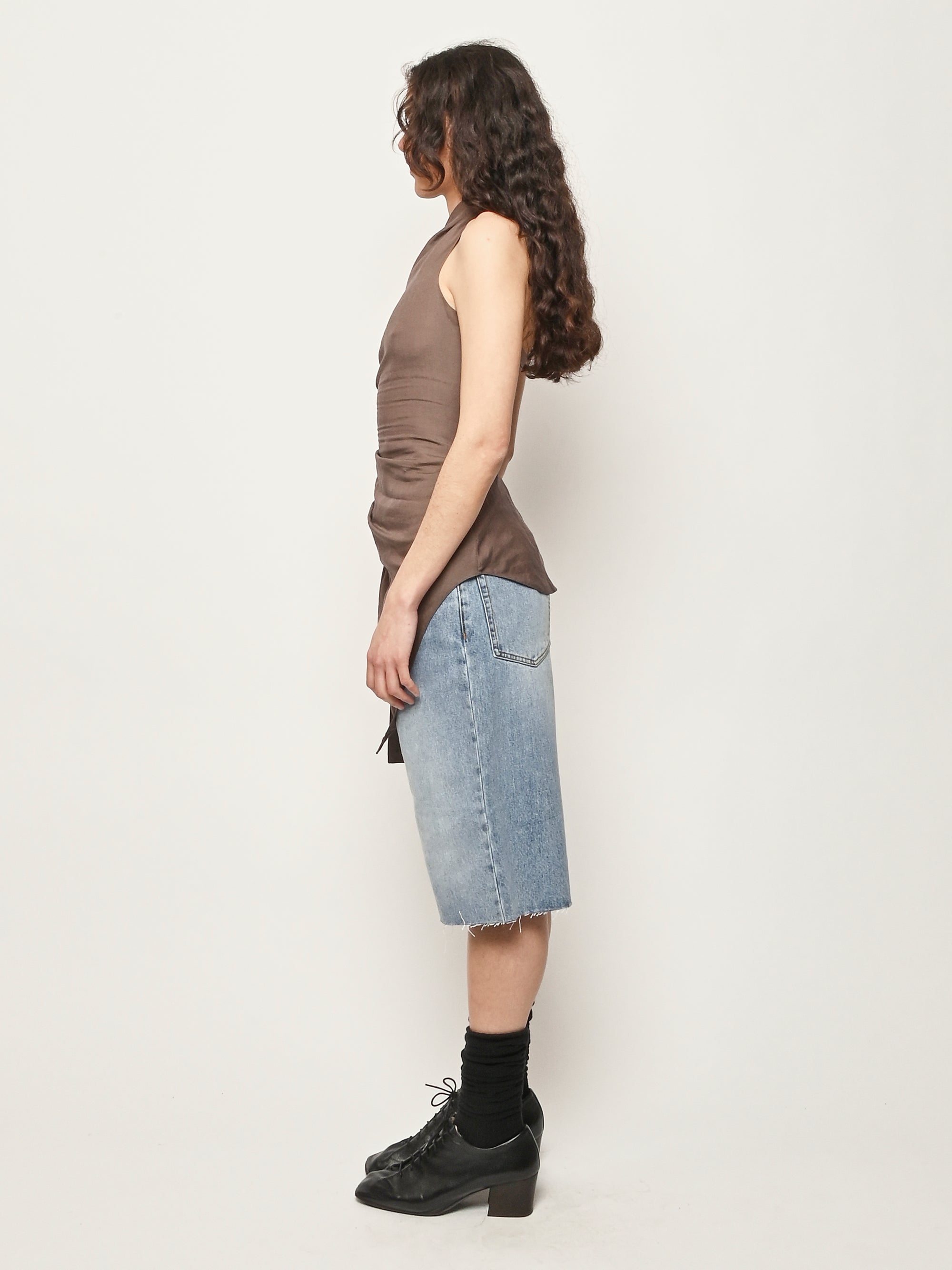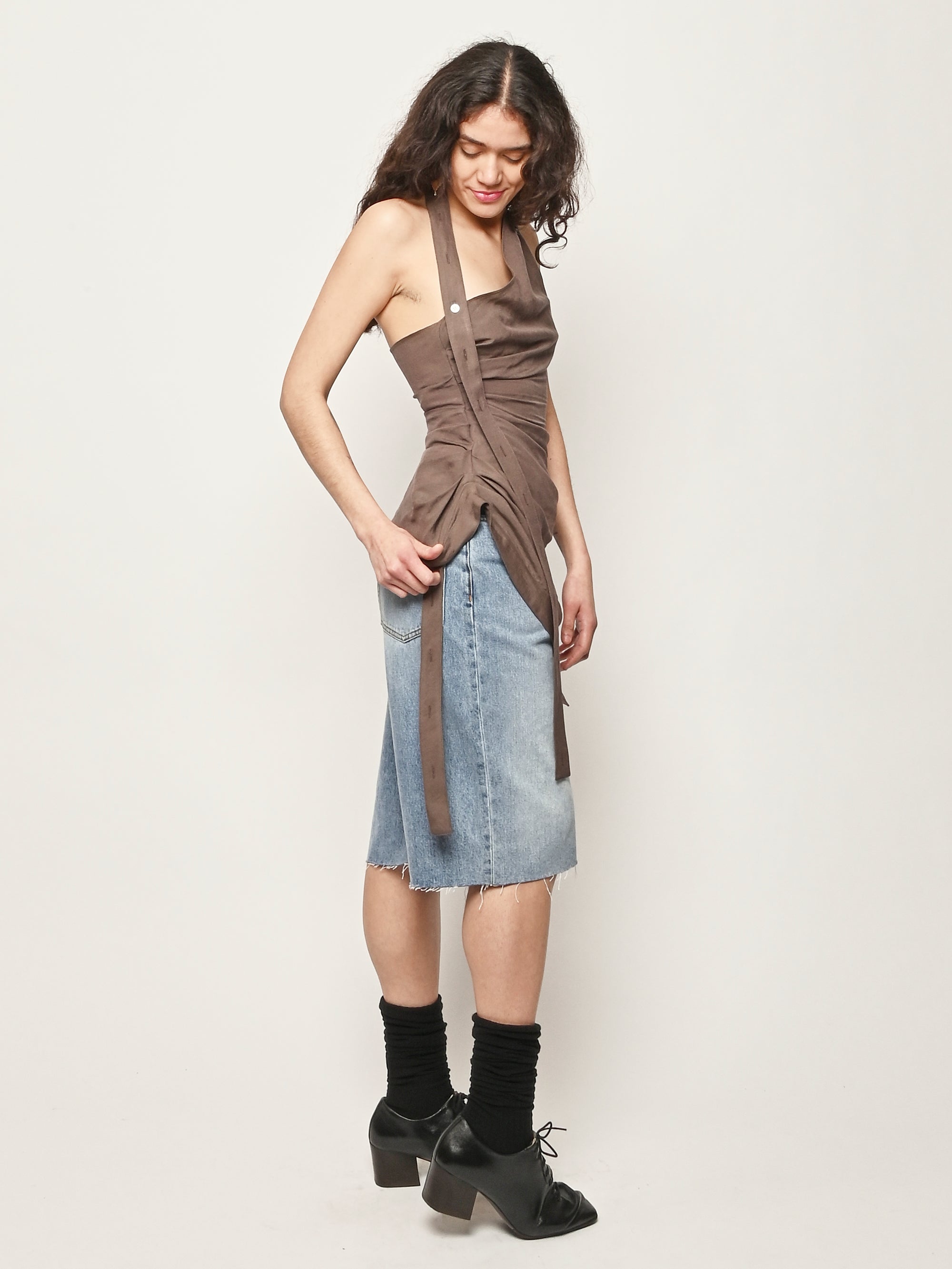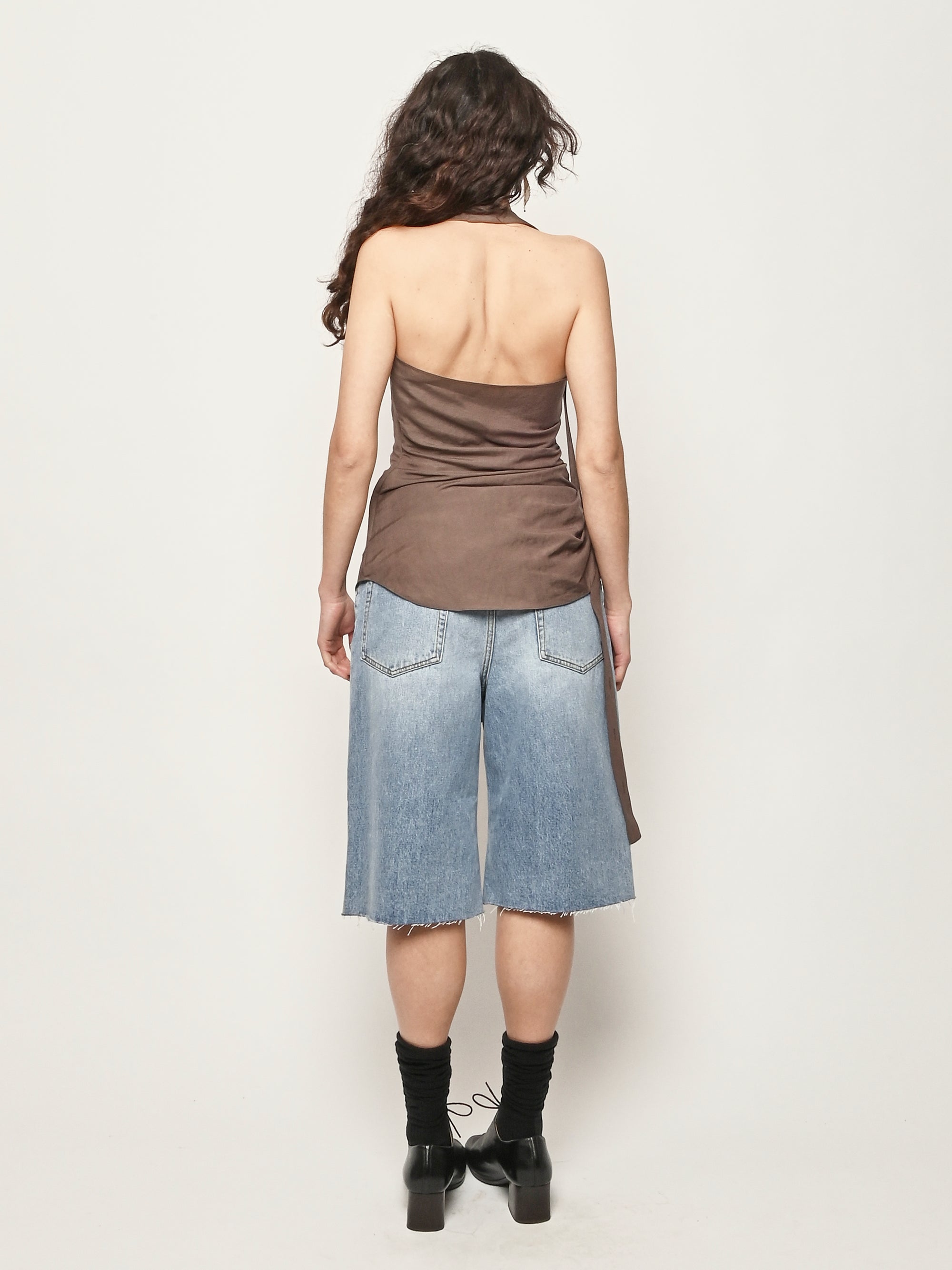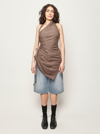 Linen blend halter blouse from Jane Wade featuring layered pleated front and back drape with hike pleat placket side pick-up. It has a halter drape front neck panel with wrap over extended adjustable button placket neckline.