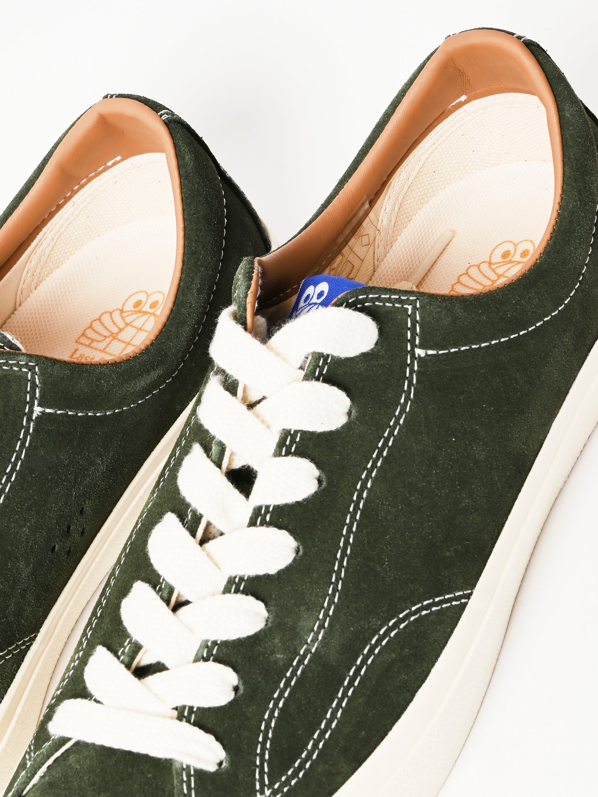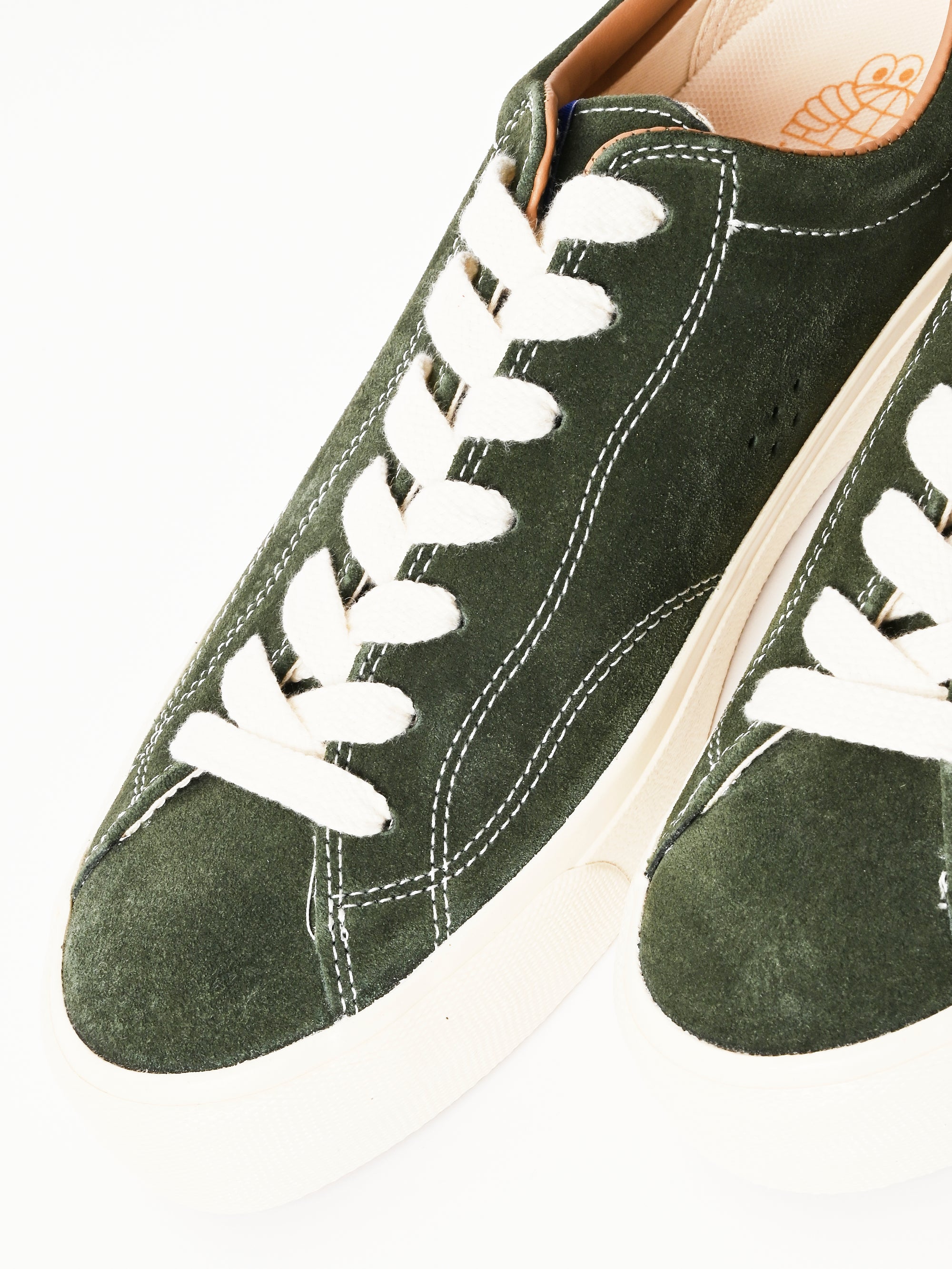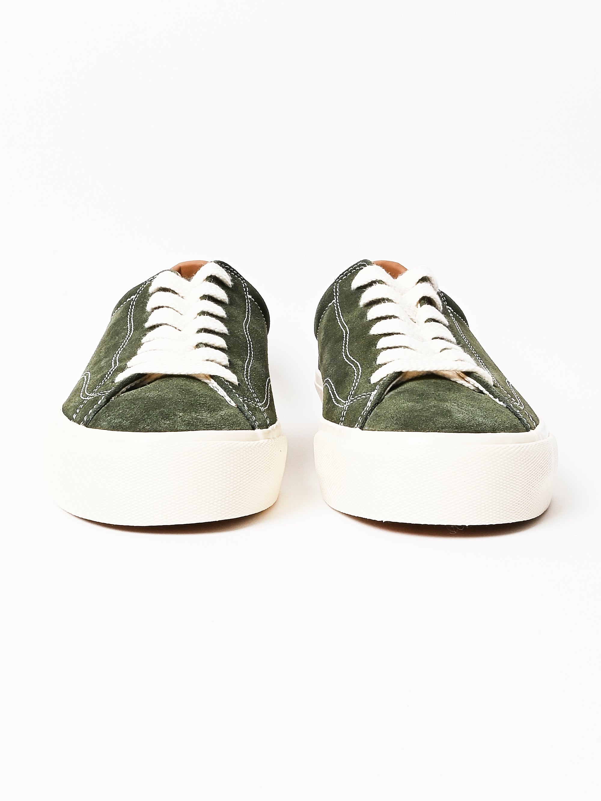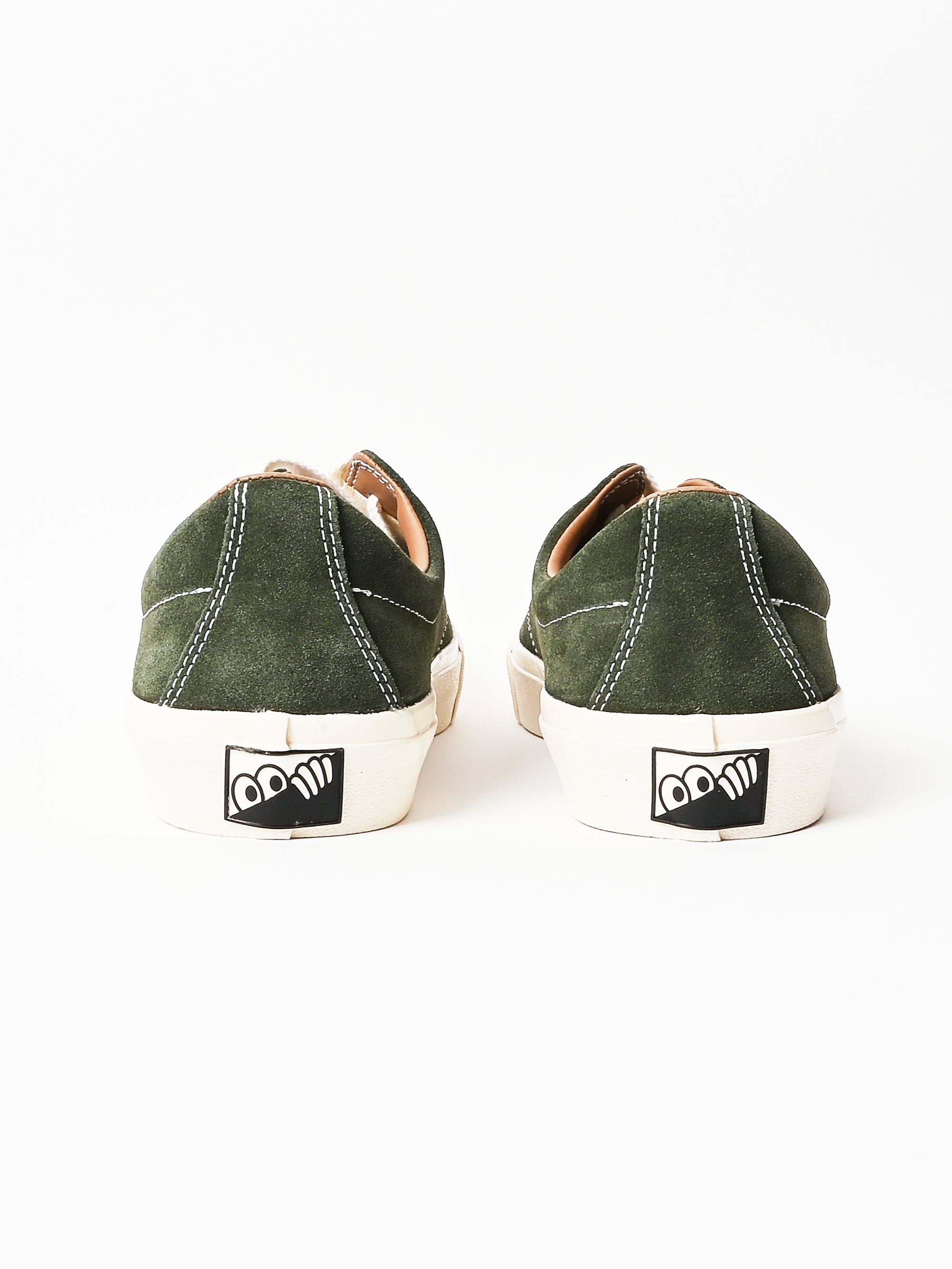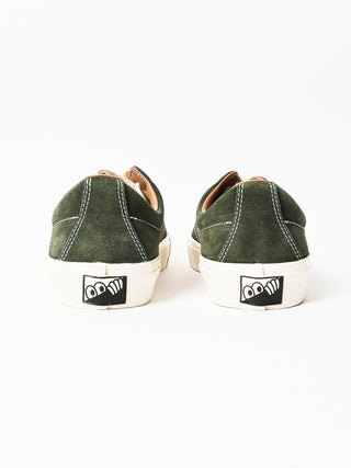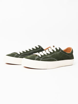 A low top skate shoe with a suede upper in Olive. Built with an unpadded construction and hidden rubber reinforcements between the upper and lining.