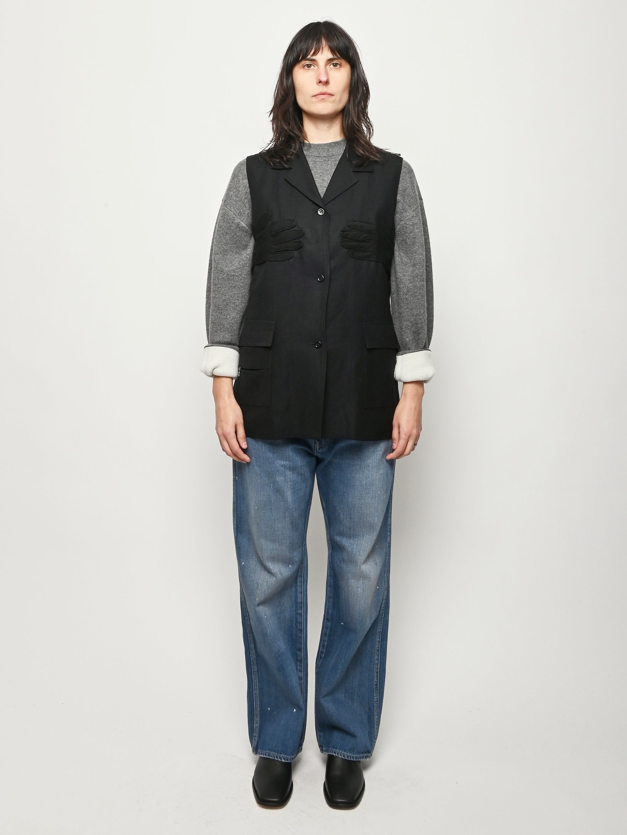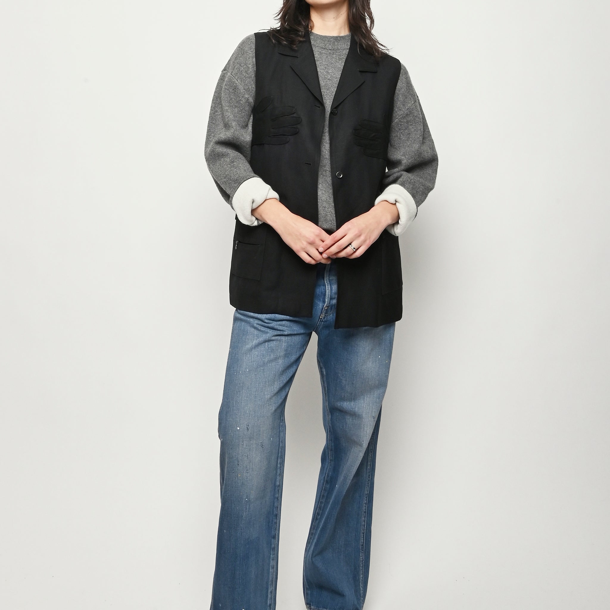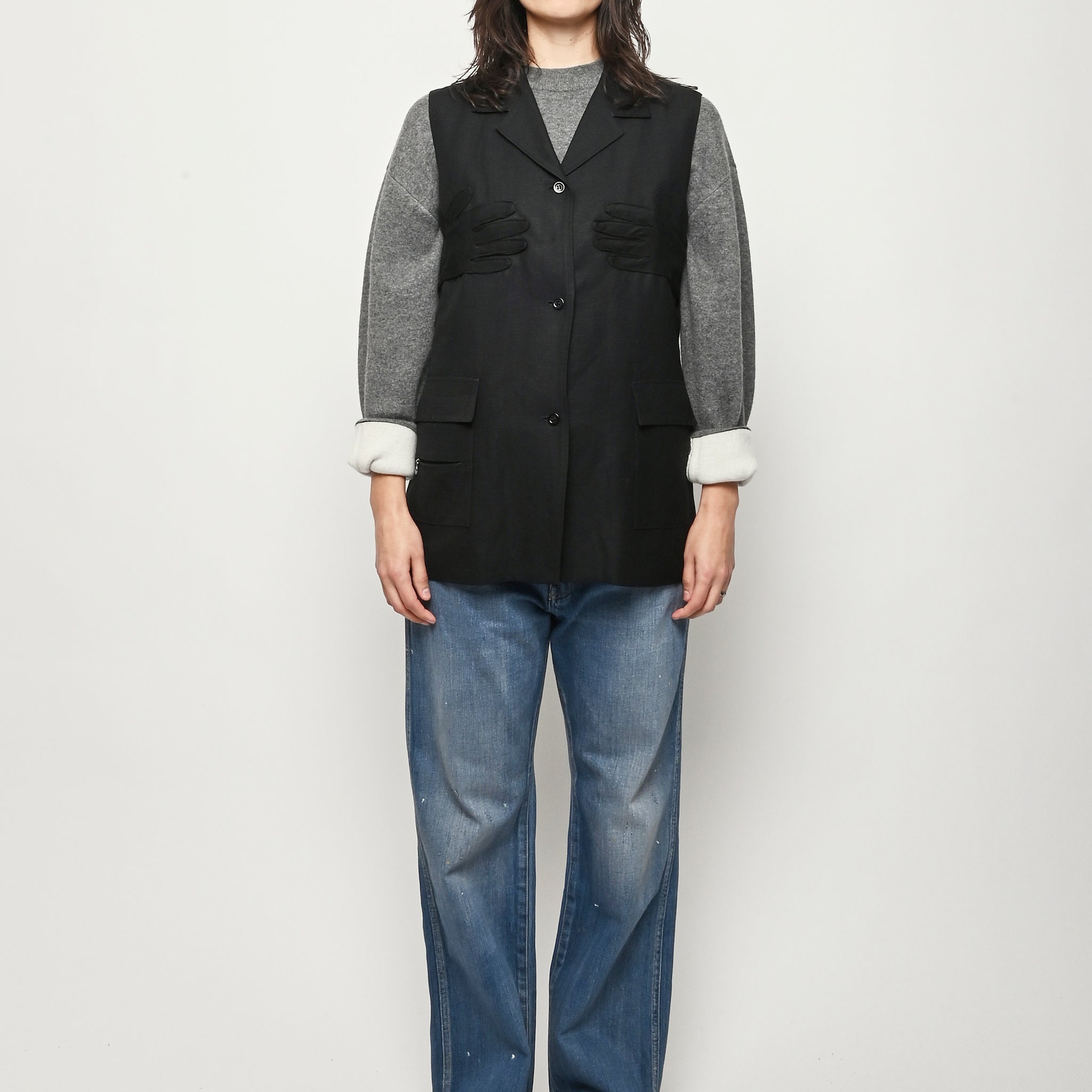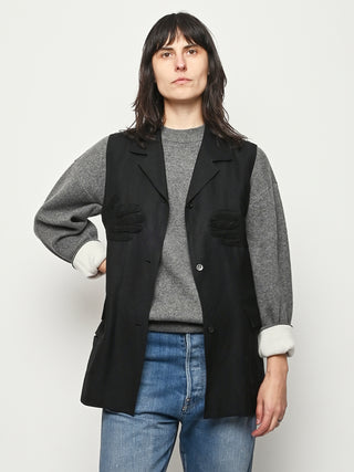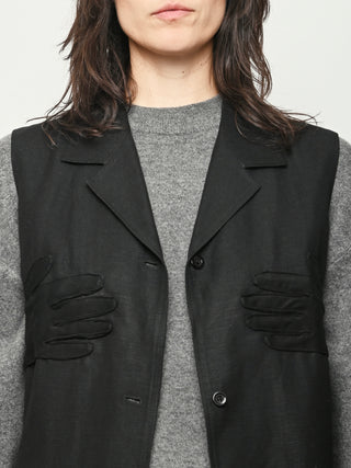Black re-worked vest with tonal black gloves detail at the bust. By local artist/designer, Laurs Kemp.