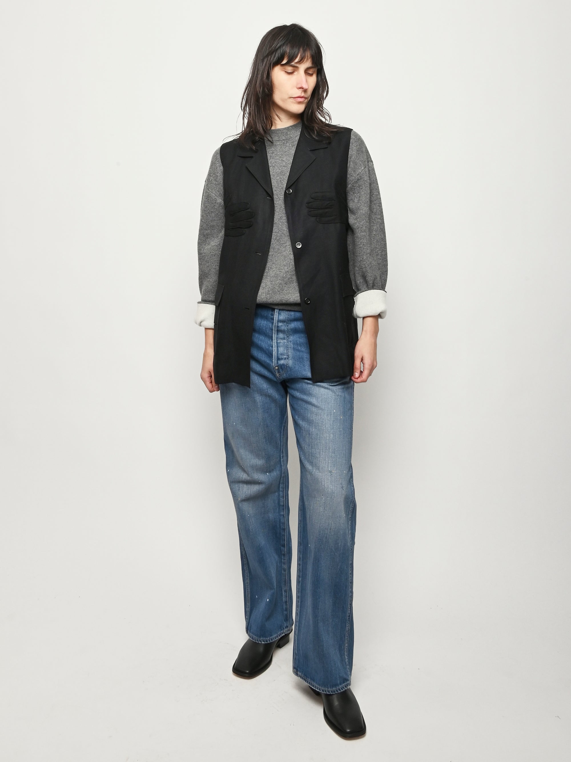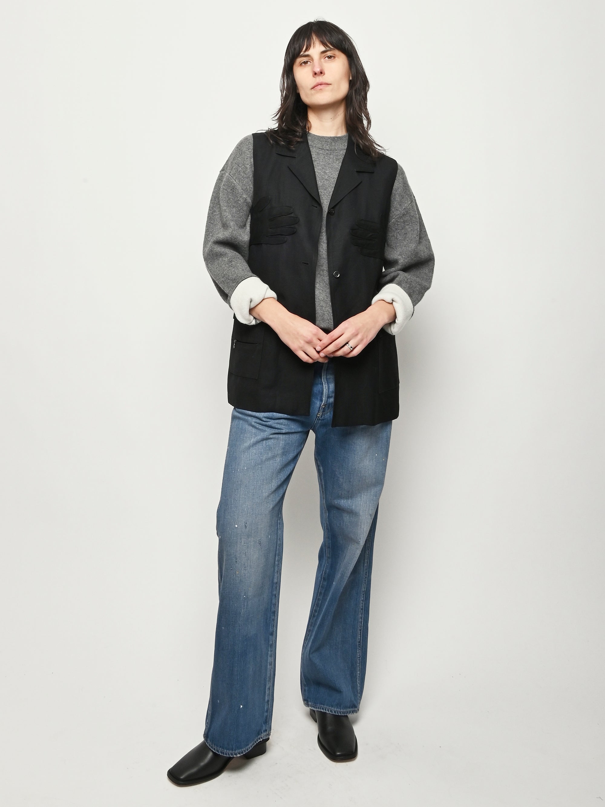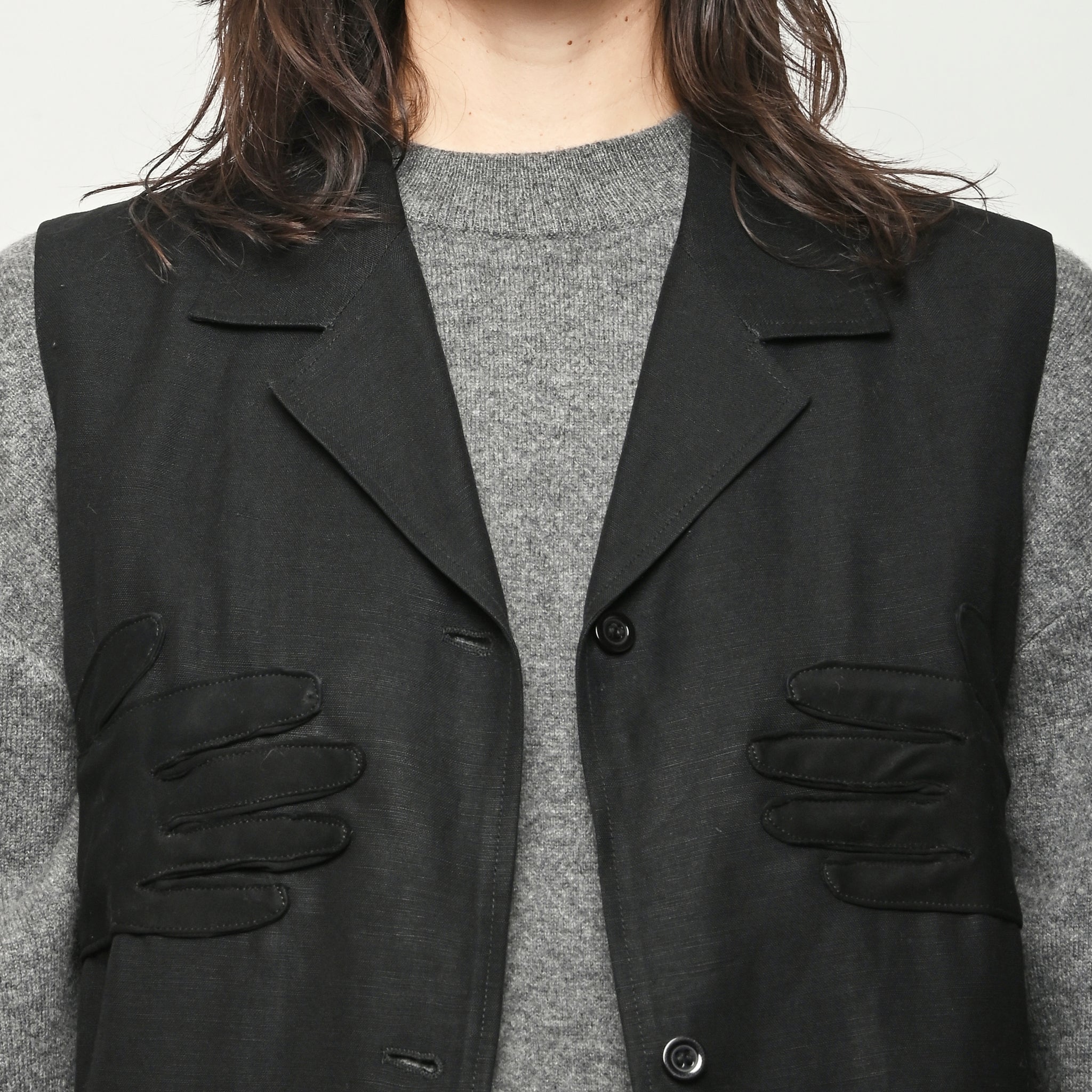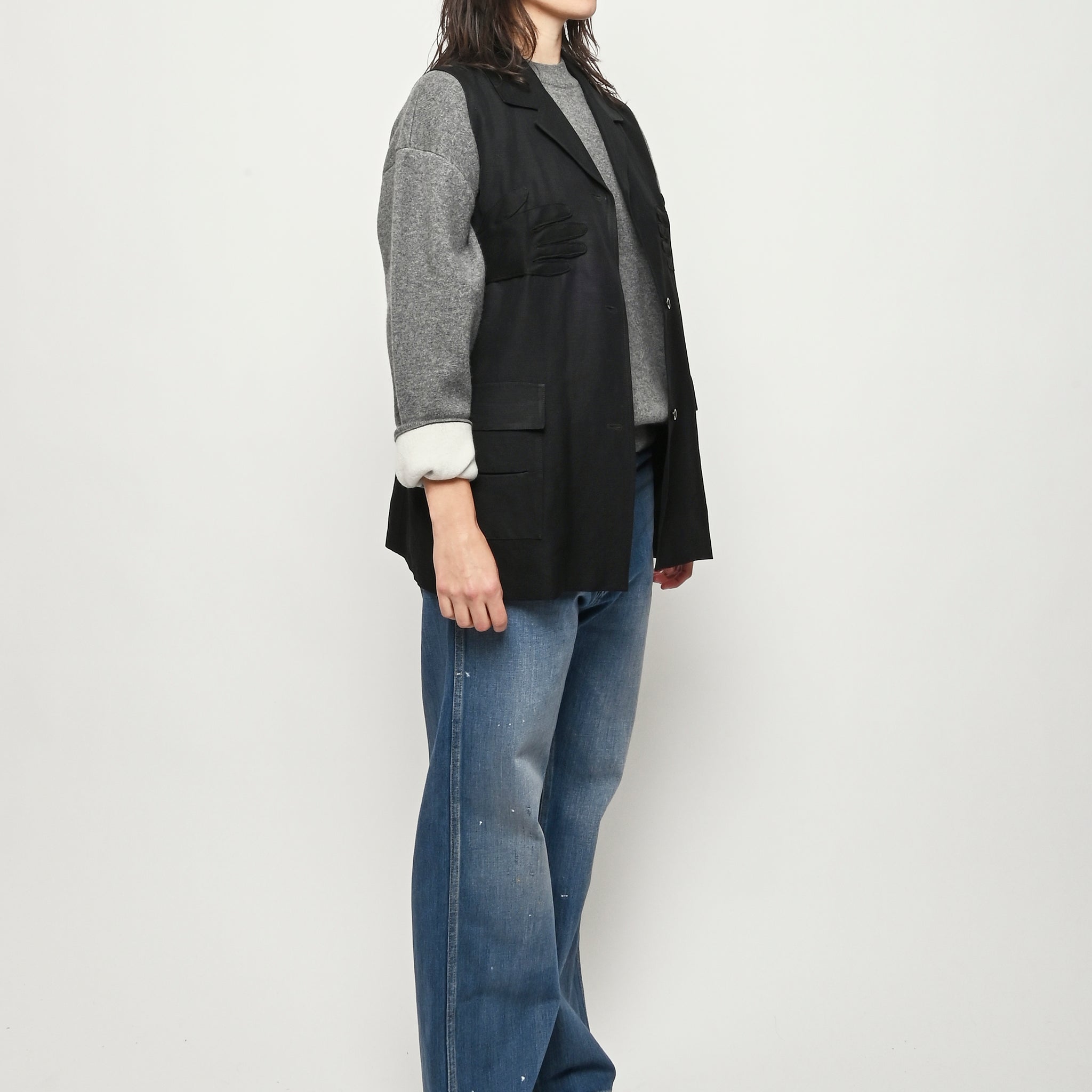 Black re-worked vest with tonal black gloves detail at the bust. By local artist/designer, Laurs Kemp.