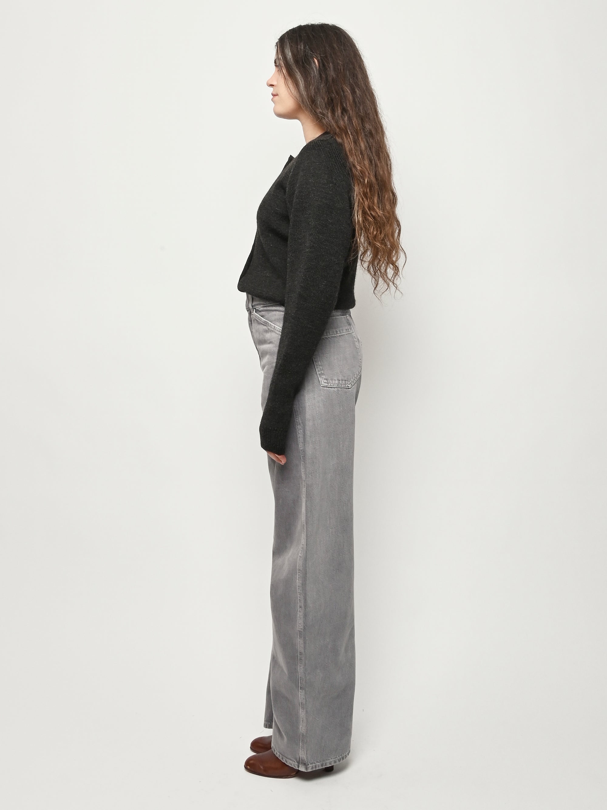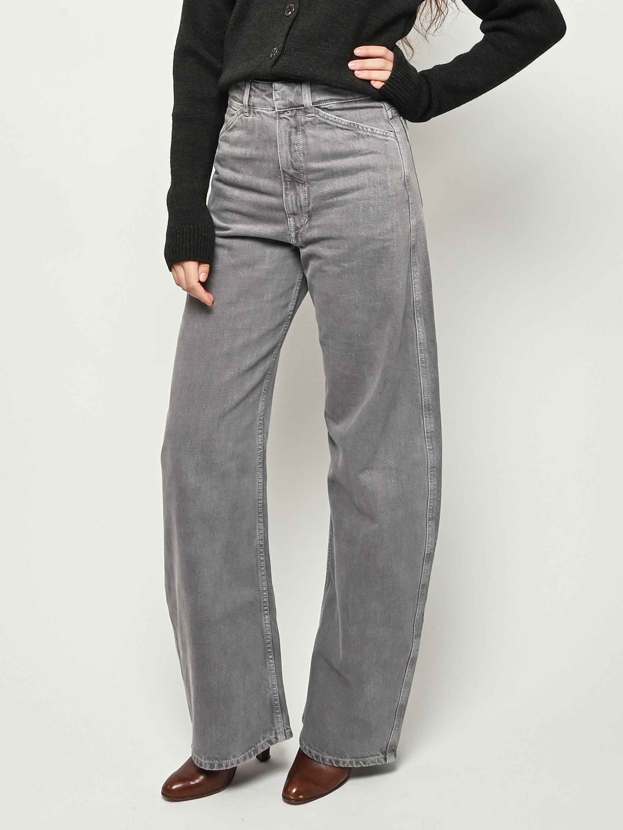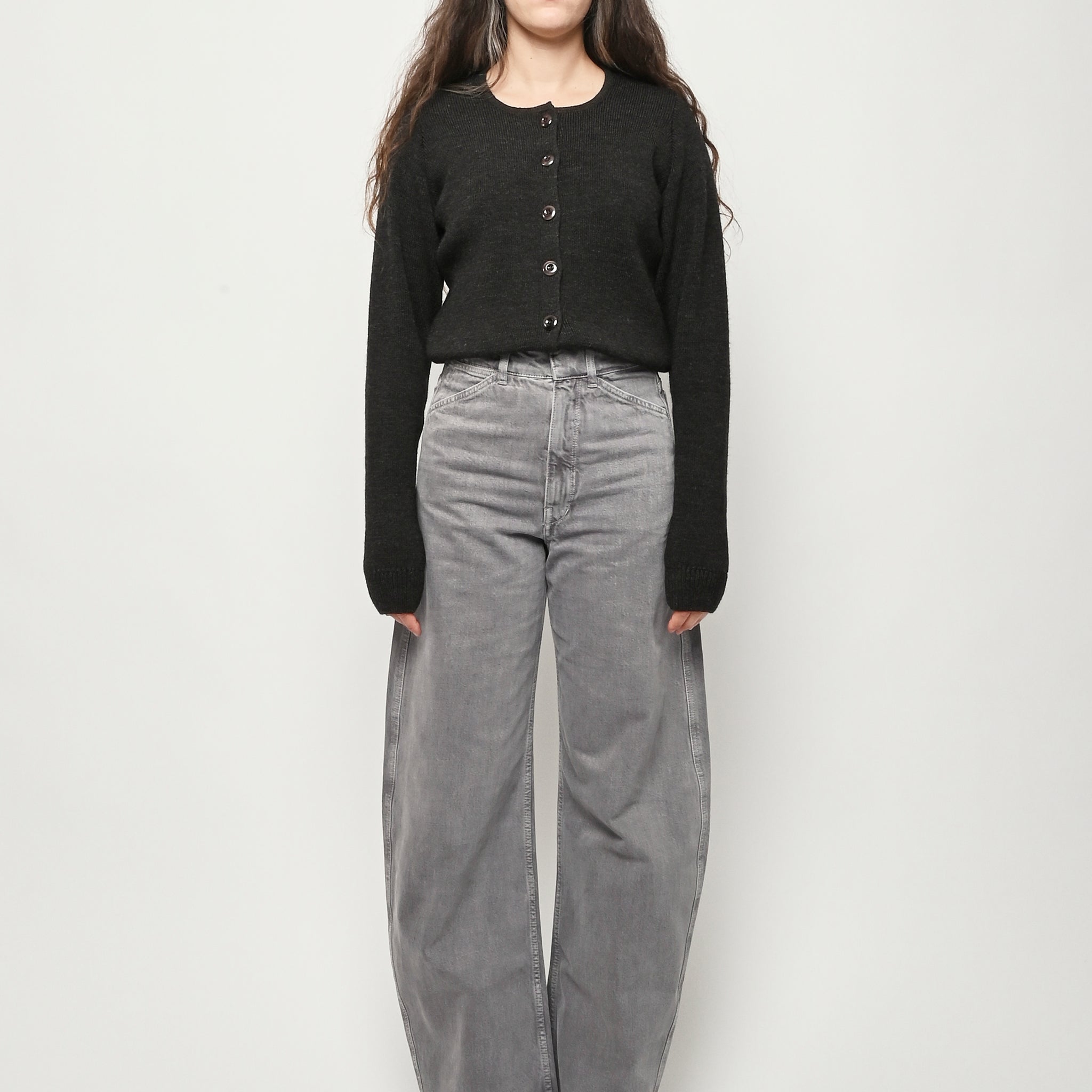 These perfect Lemaire pants are made of a heavy garment-dyed denim, with a thick, round hand. They are high-waisted with a concealed closure, and have long, straight legs with slightly twisted side-seams. They feature classic denim details such as four pockets including a ticket pocket, and contrast stitching.