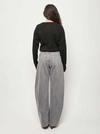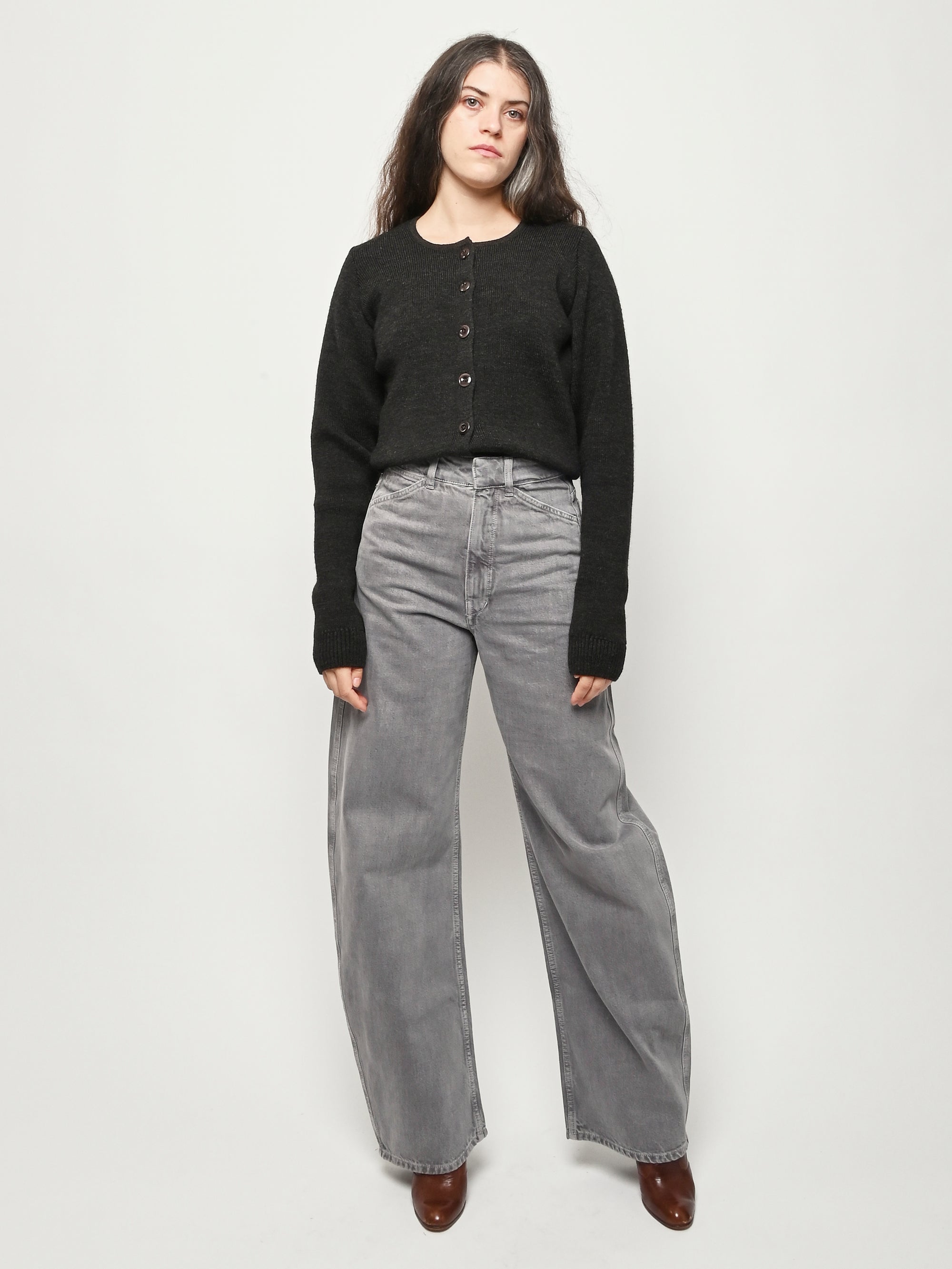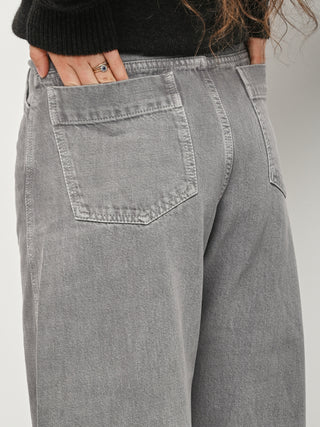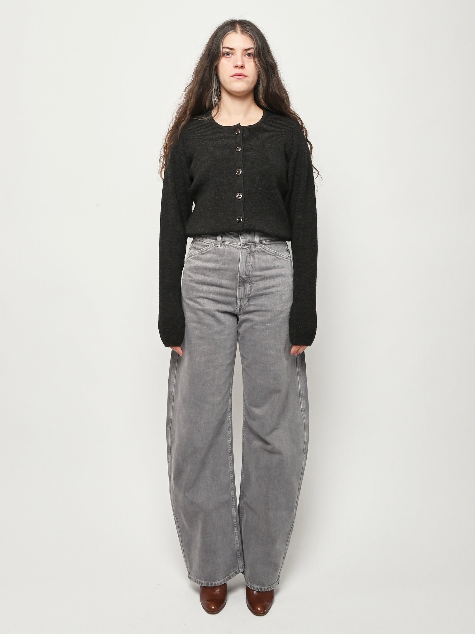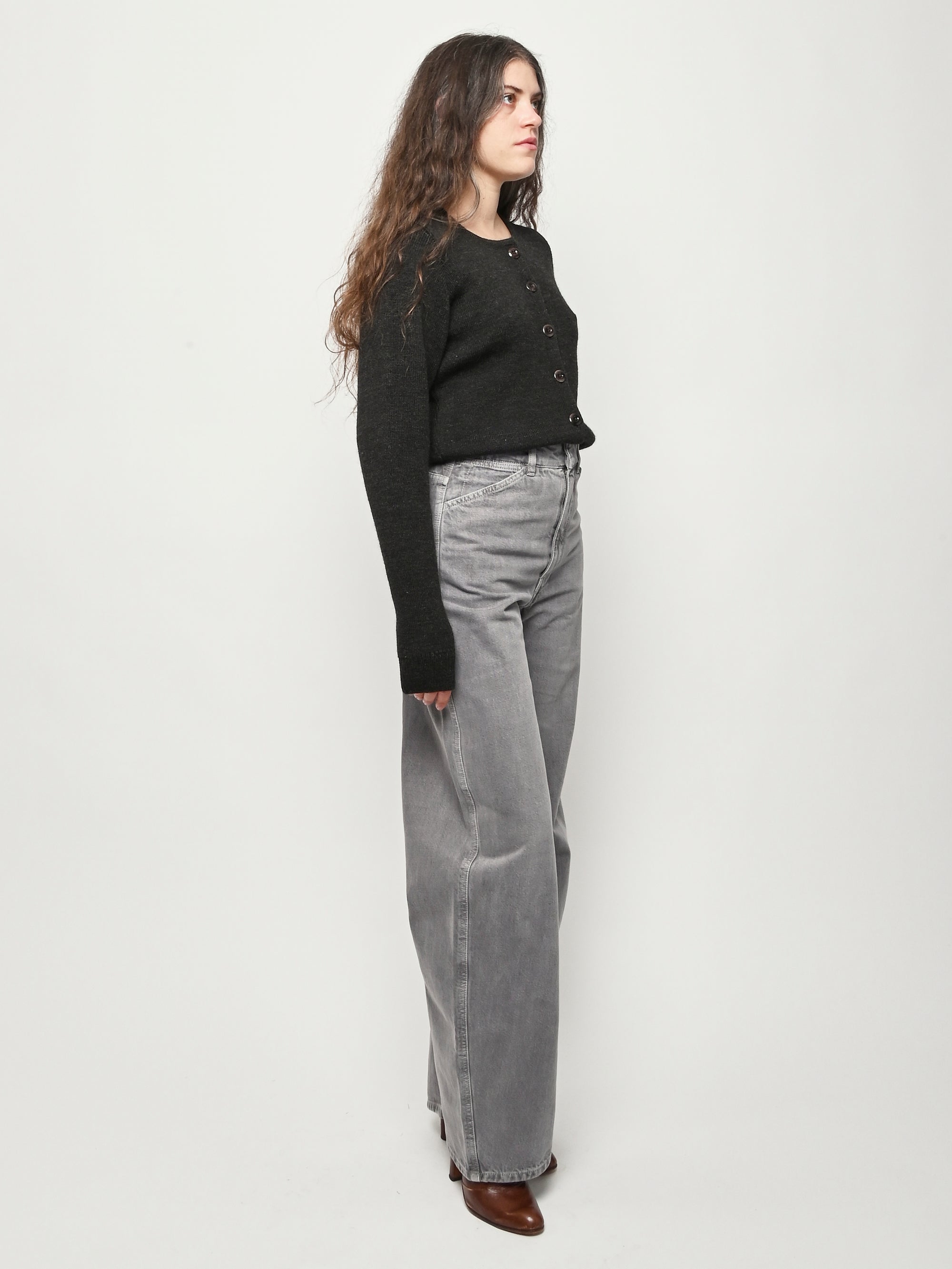 These perfect Lemaire pants are made of a heavy garment-dyed denim, with a thick, round hand. They are high-waisted with a concealed closure, and have long, straight legs with slightly twisted side-seams. They feature classic denim details such as four pockets including a ticket pocket, and contrast stitching.