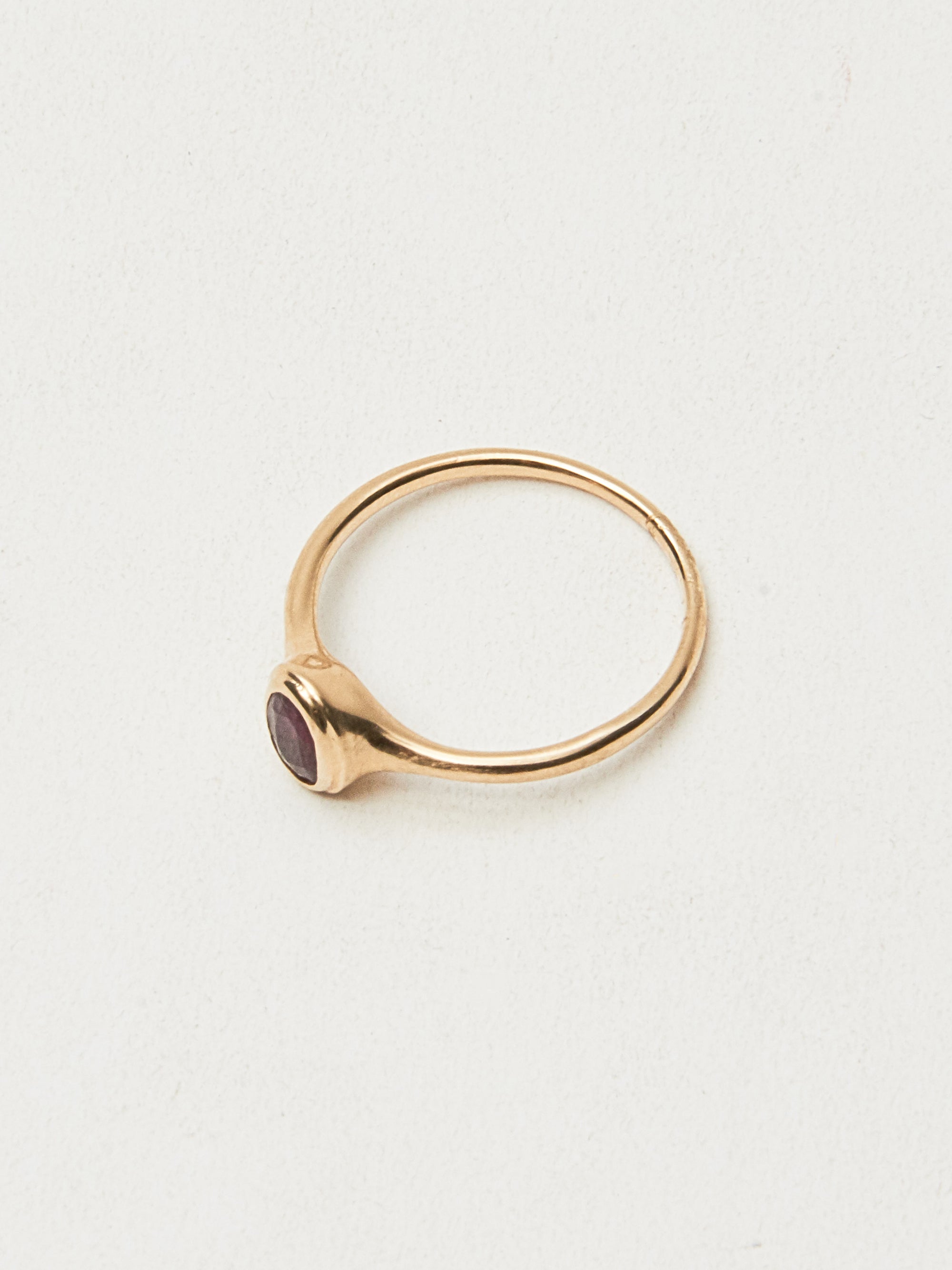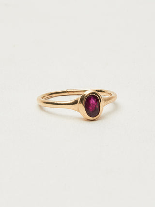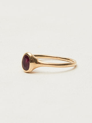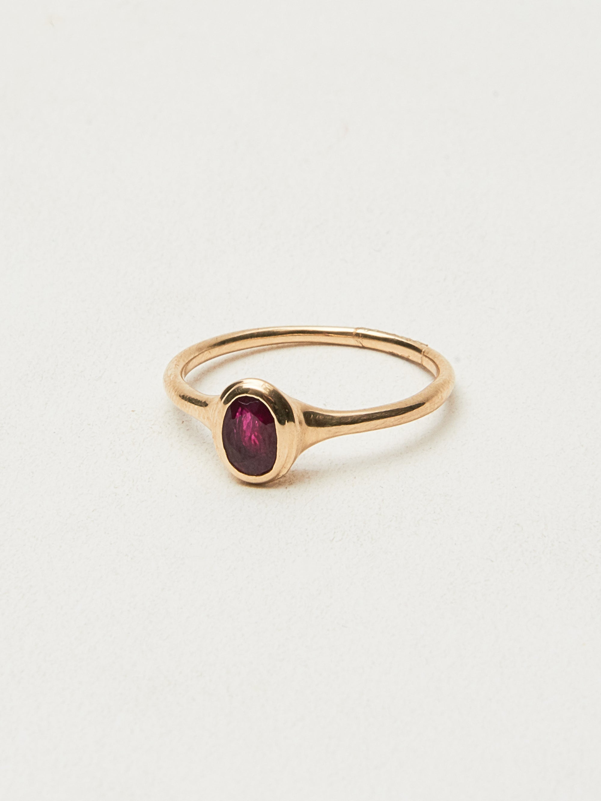 14k yellow gold ring set with a 4x6mm oval faceted ruby.