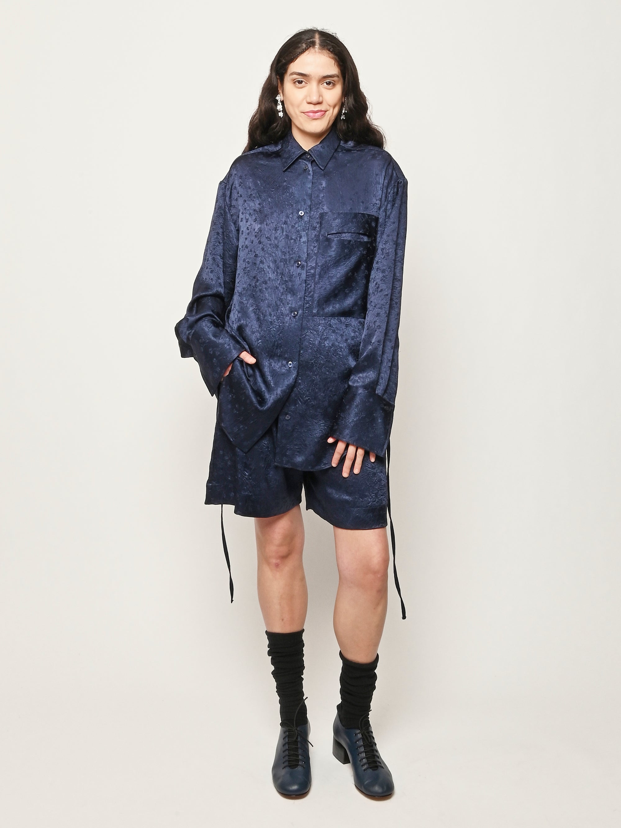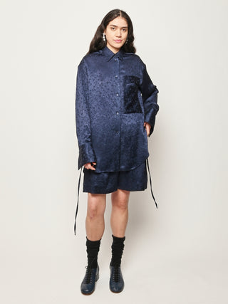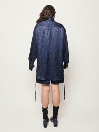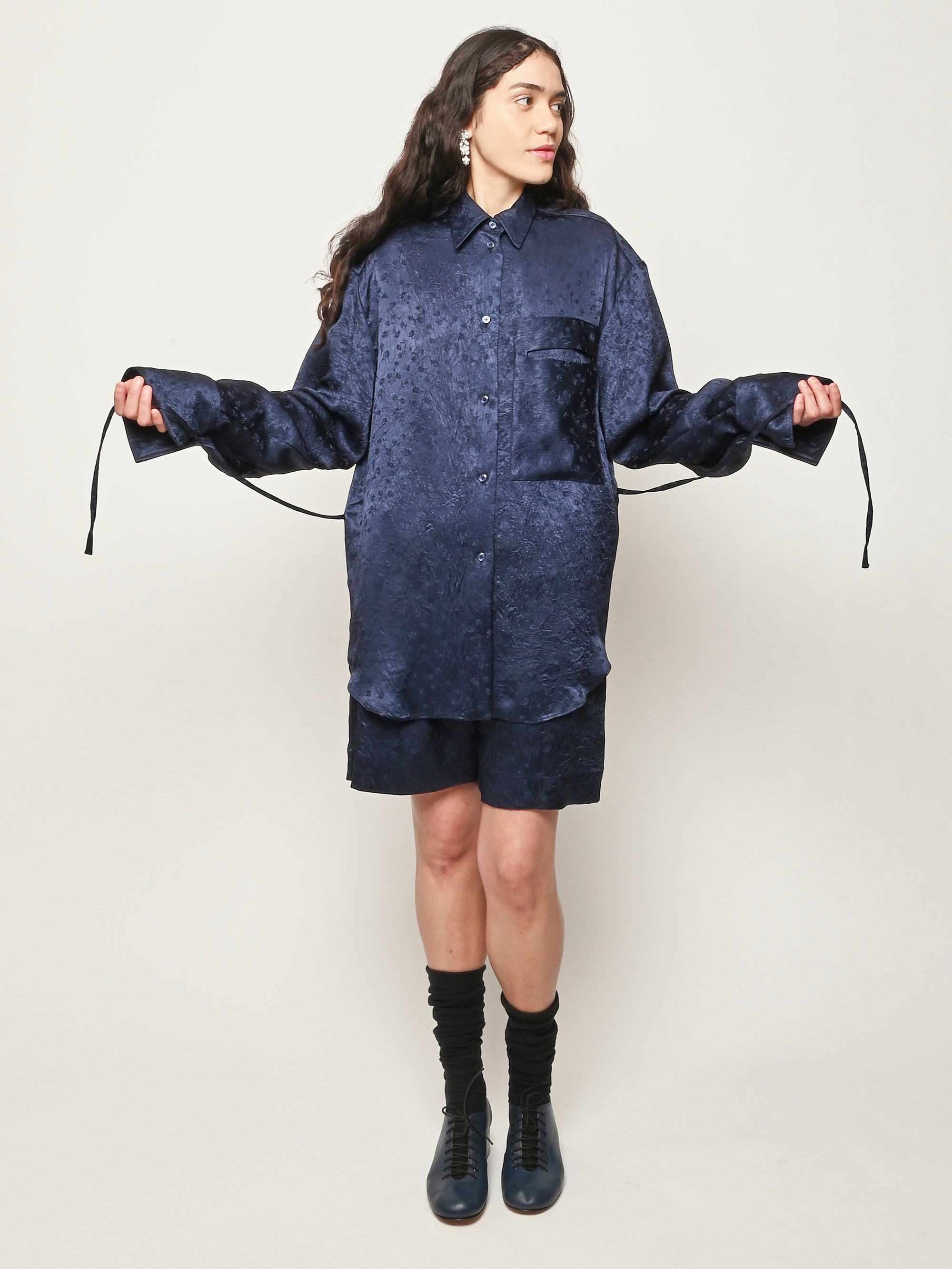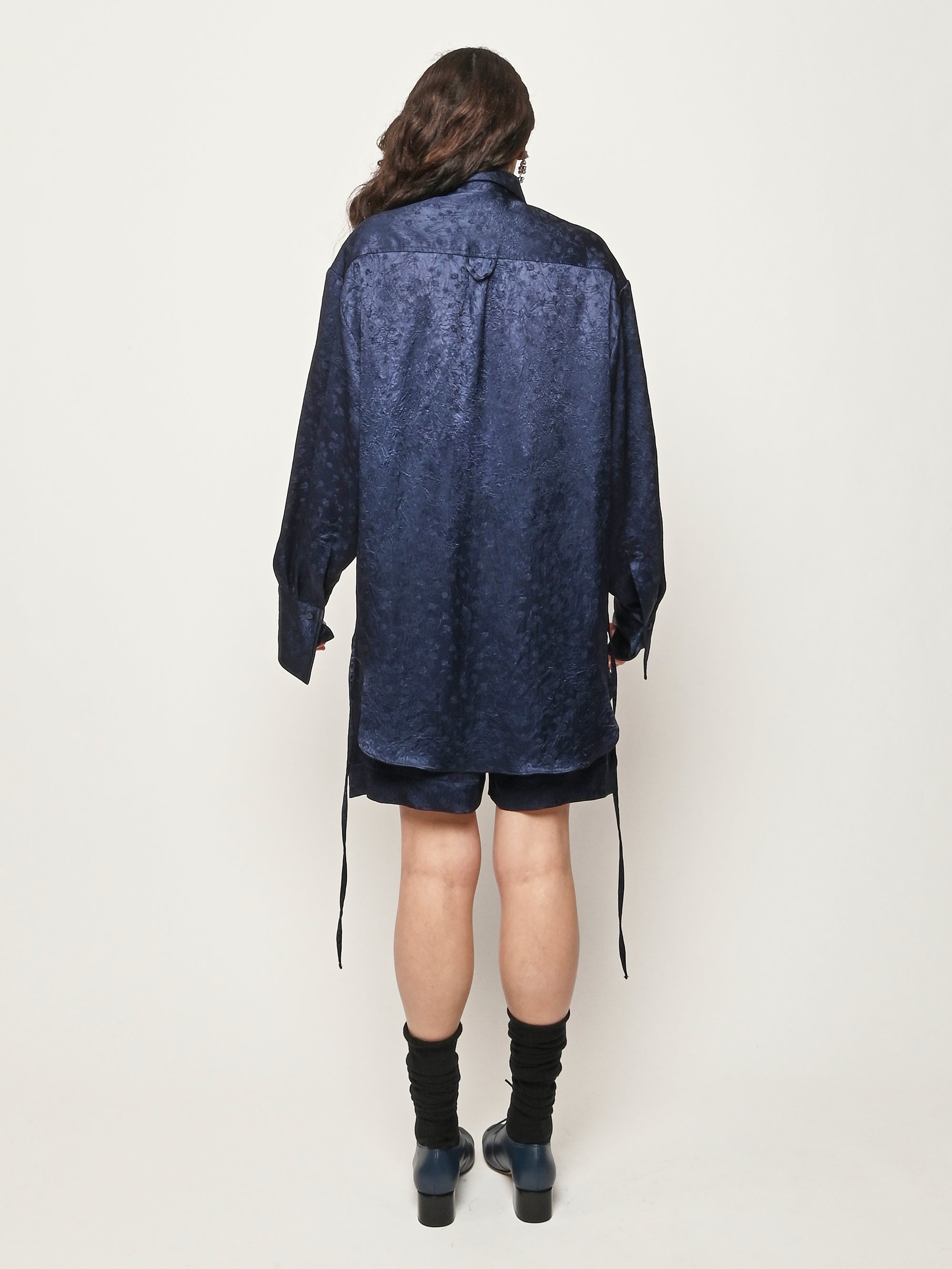 Oversized Button Down shirt by Nomia with slightly dropped shoulders, and pointed collar. Self Ties at waist allow for cinched silhouette.