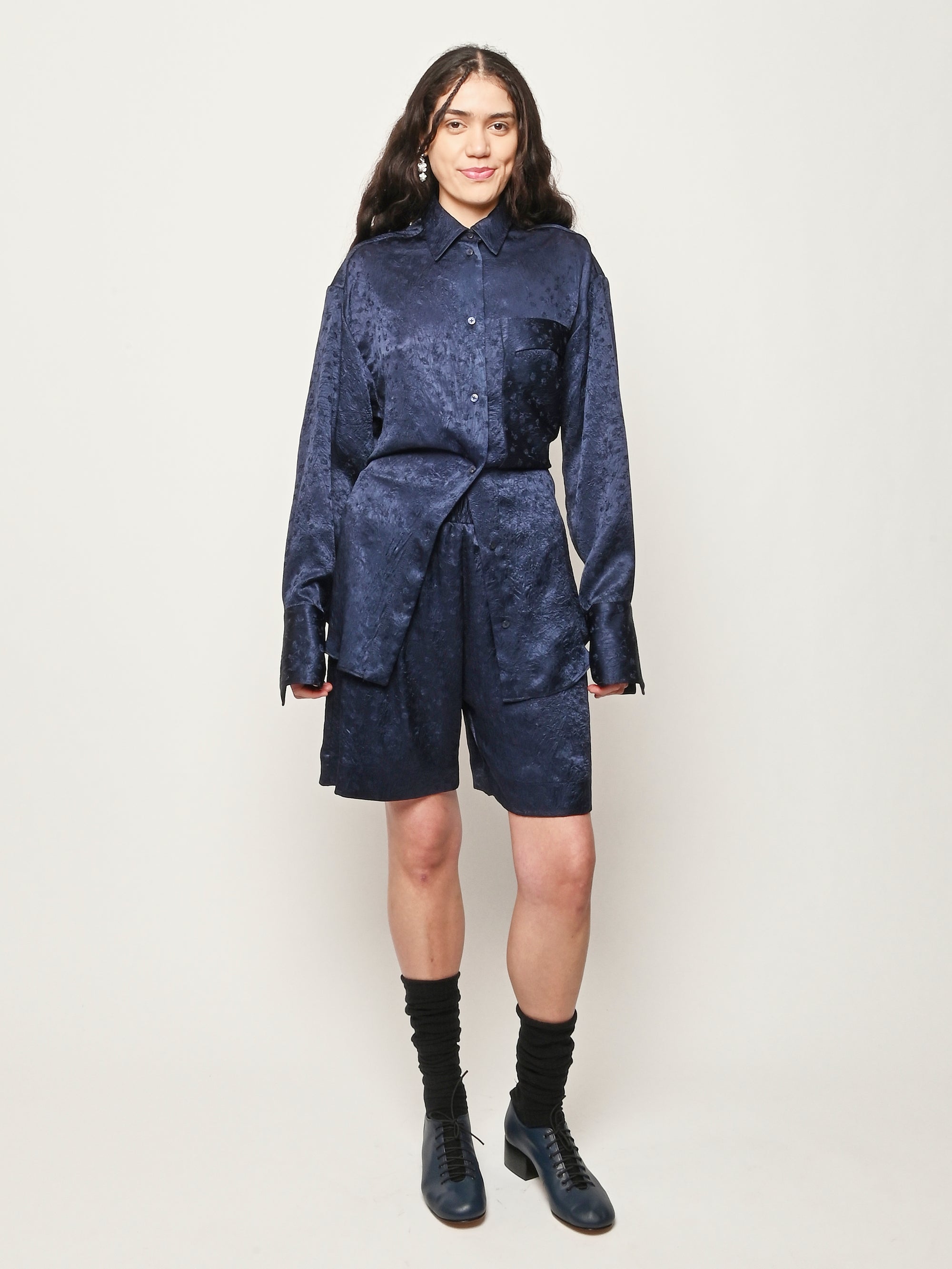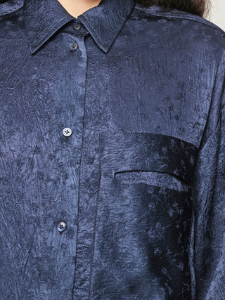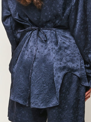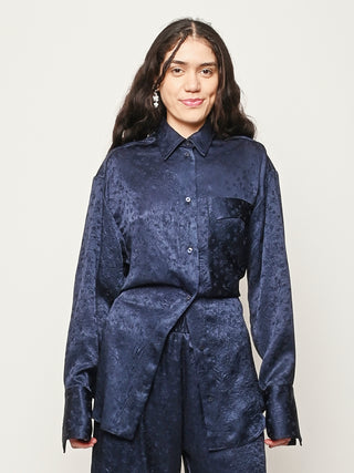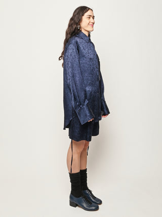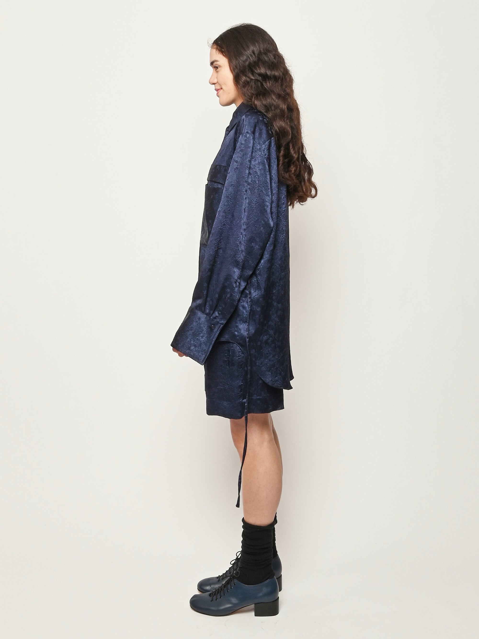 Oversized Button Down shirt by Nomia with slightly dropped shoulders, and pointed collar. Self Ties at waist allow for cinched silhouette.