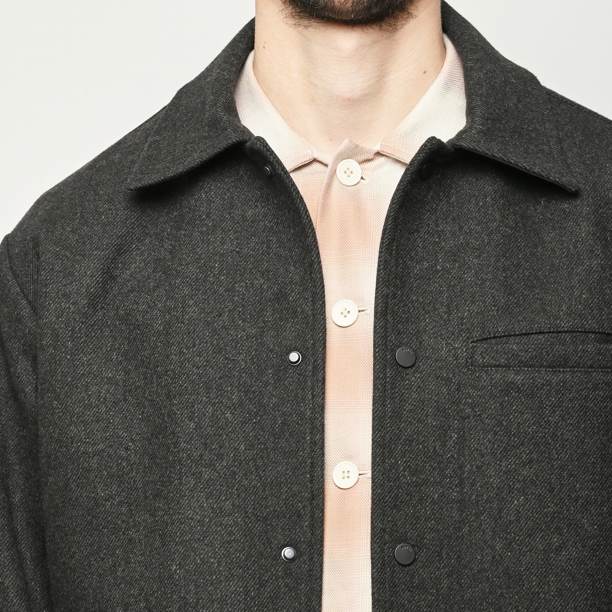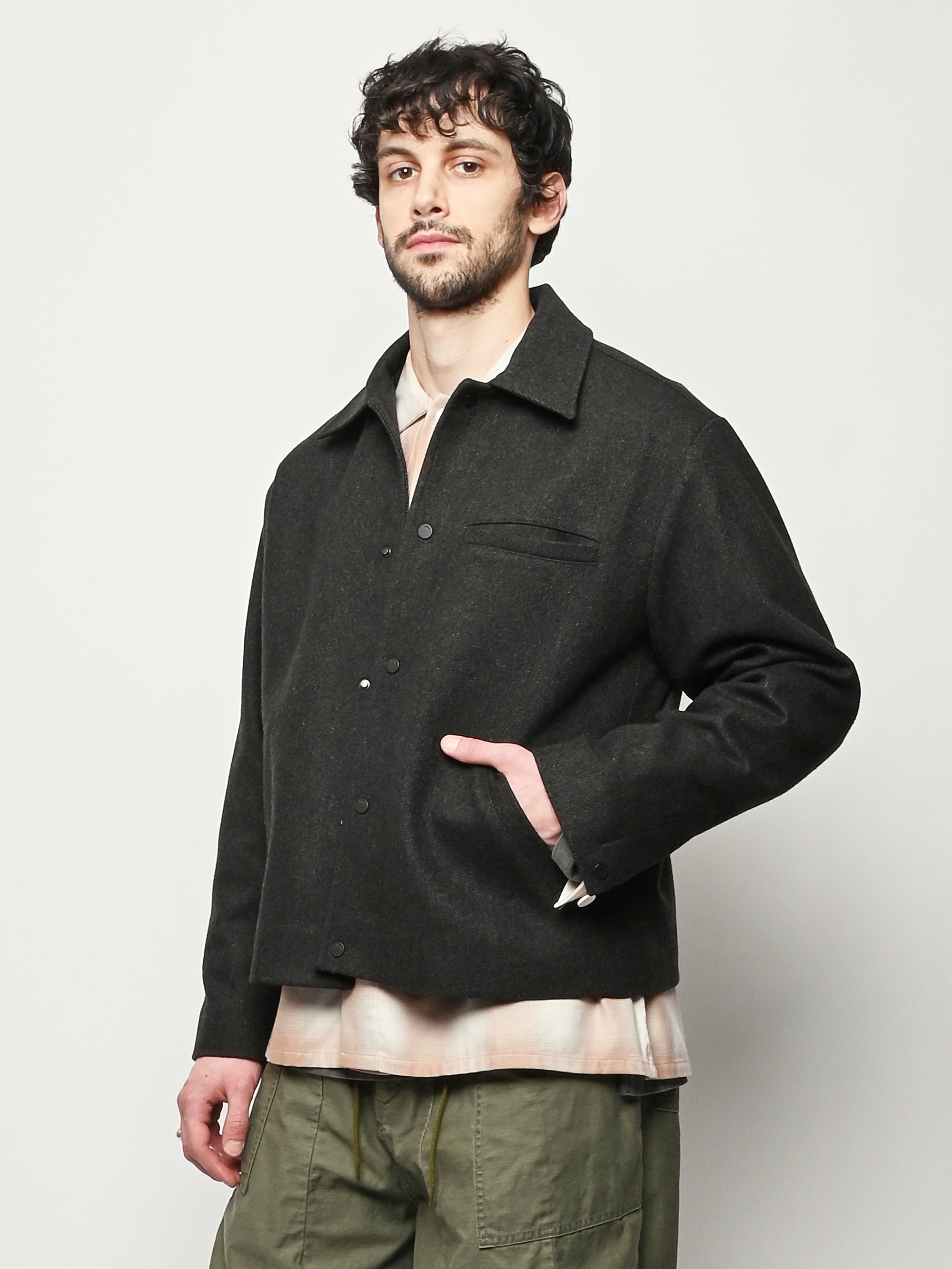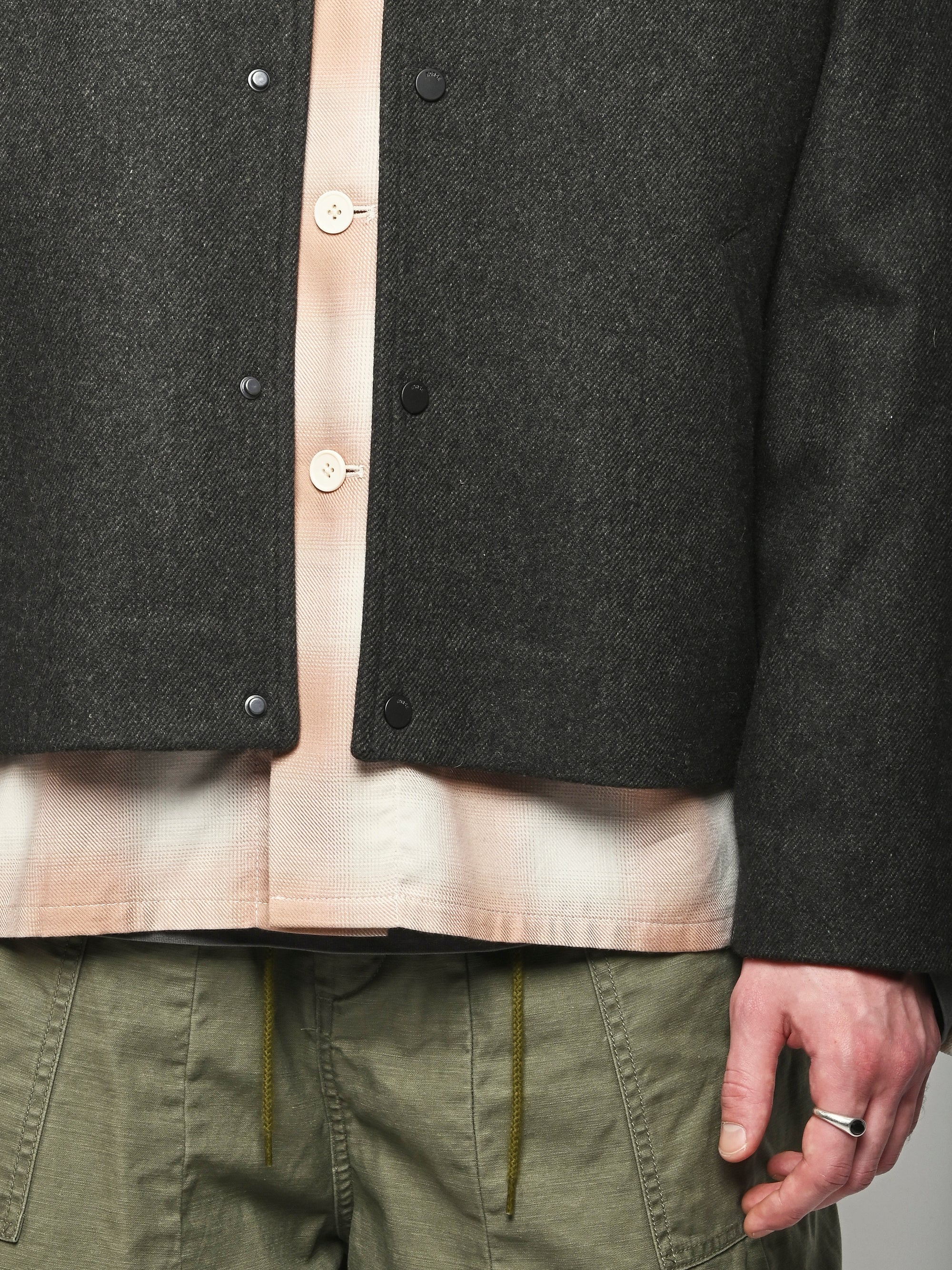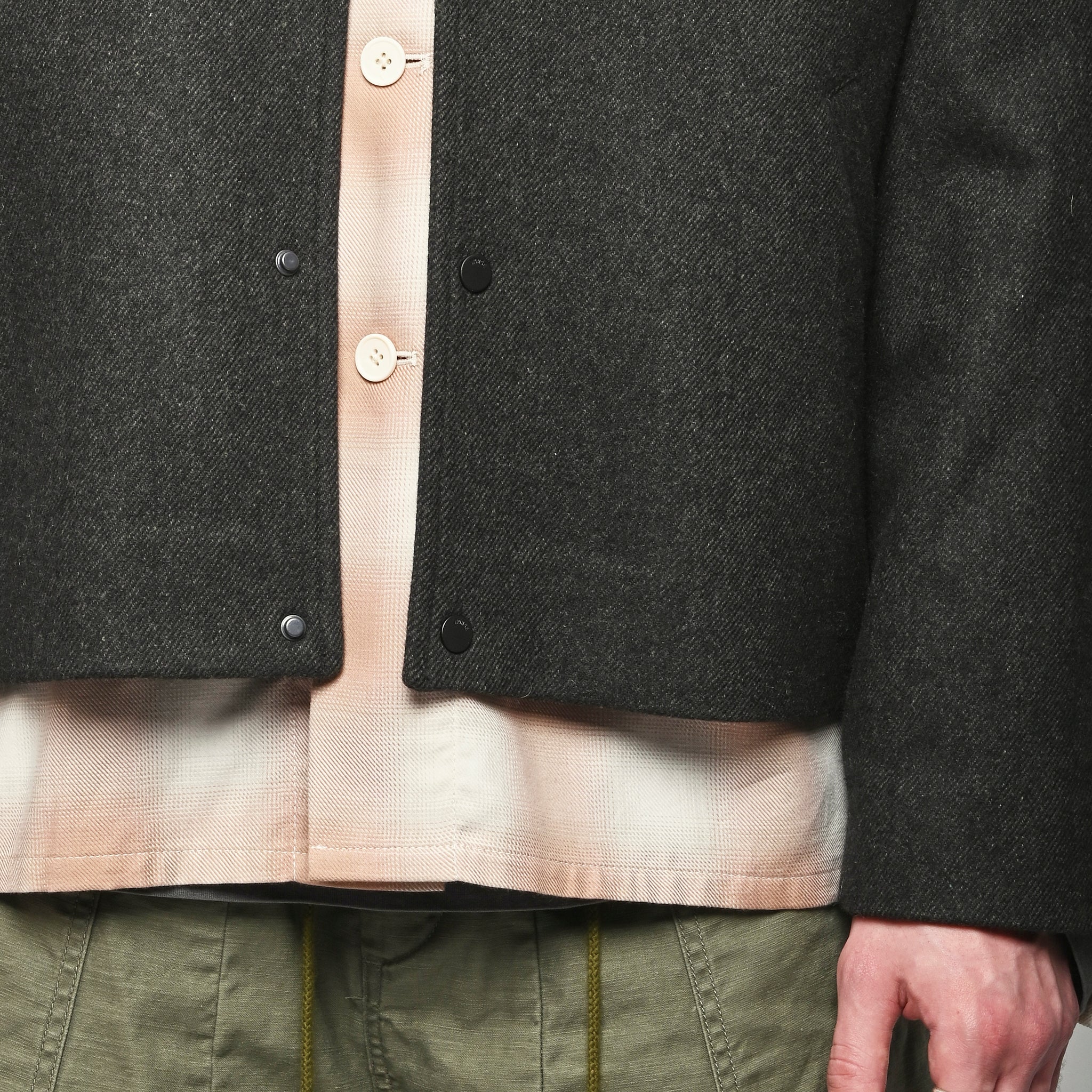 A short wool sports jacket, constructed from a heavy wool twill cloth from Italian mill Balli. Cut with a relaxed boxy fit, this style features a front branded snap closure, slanted welt pockets, chest welt pocket, set-in sleeves, and lined with compact lining for wind proofing.