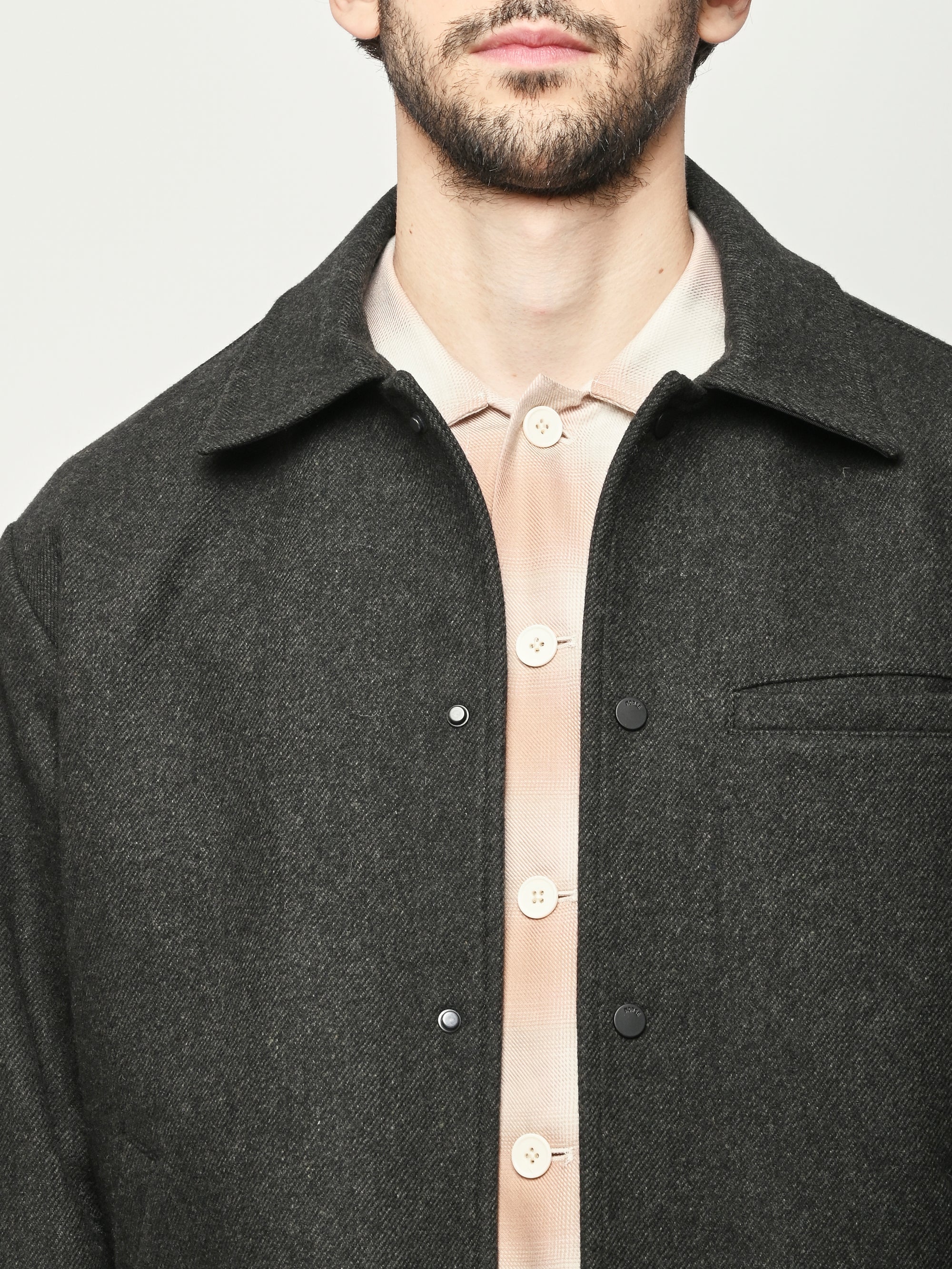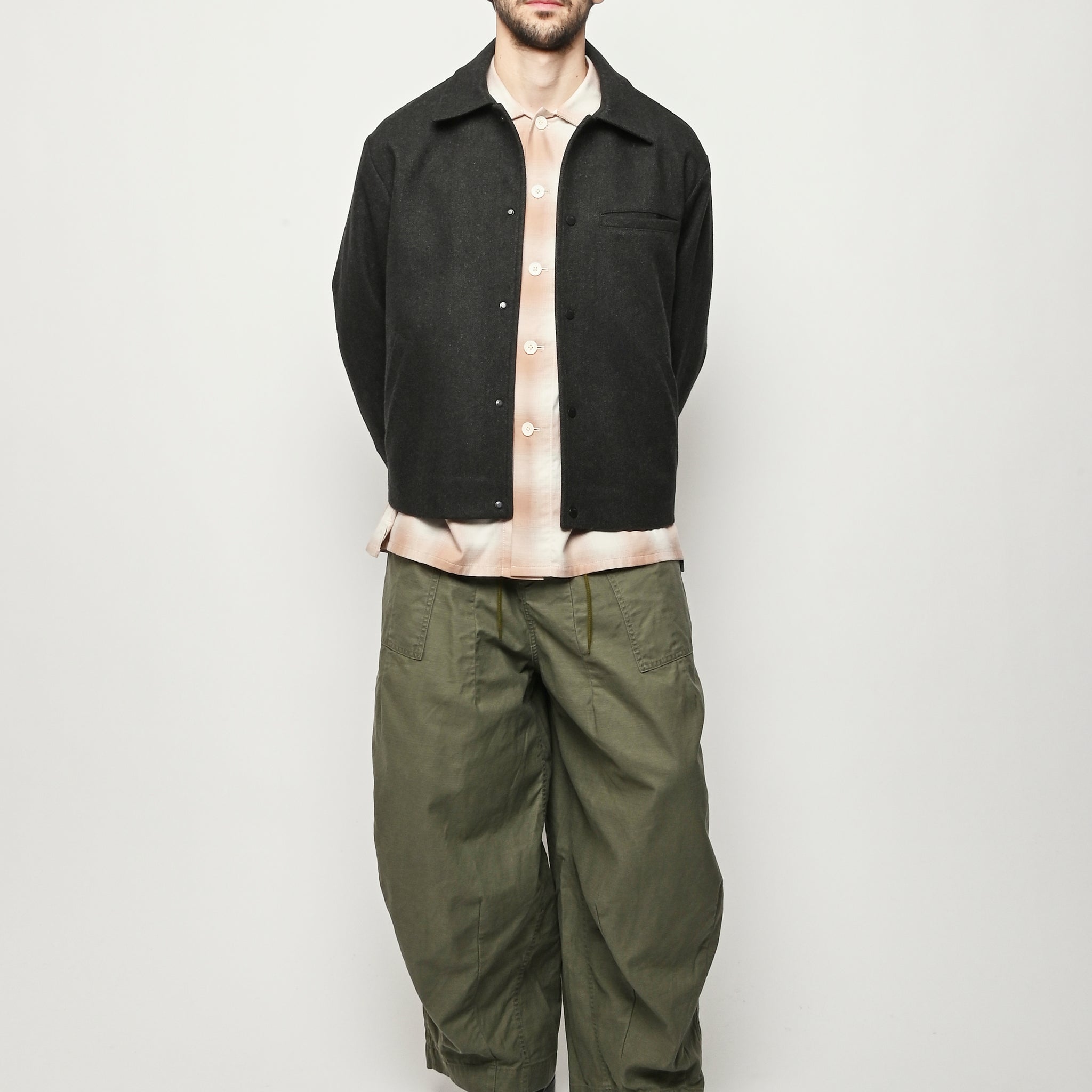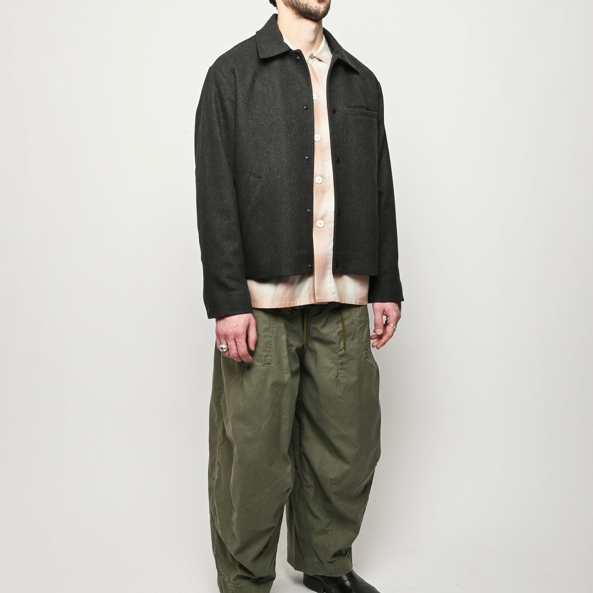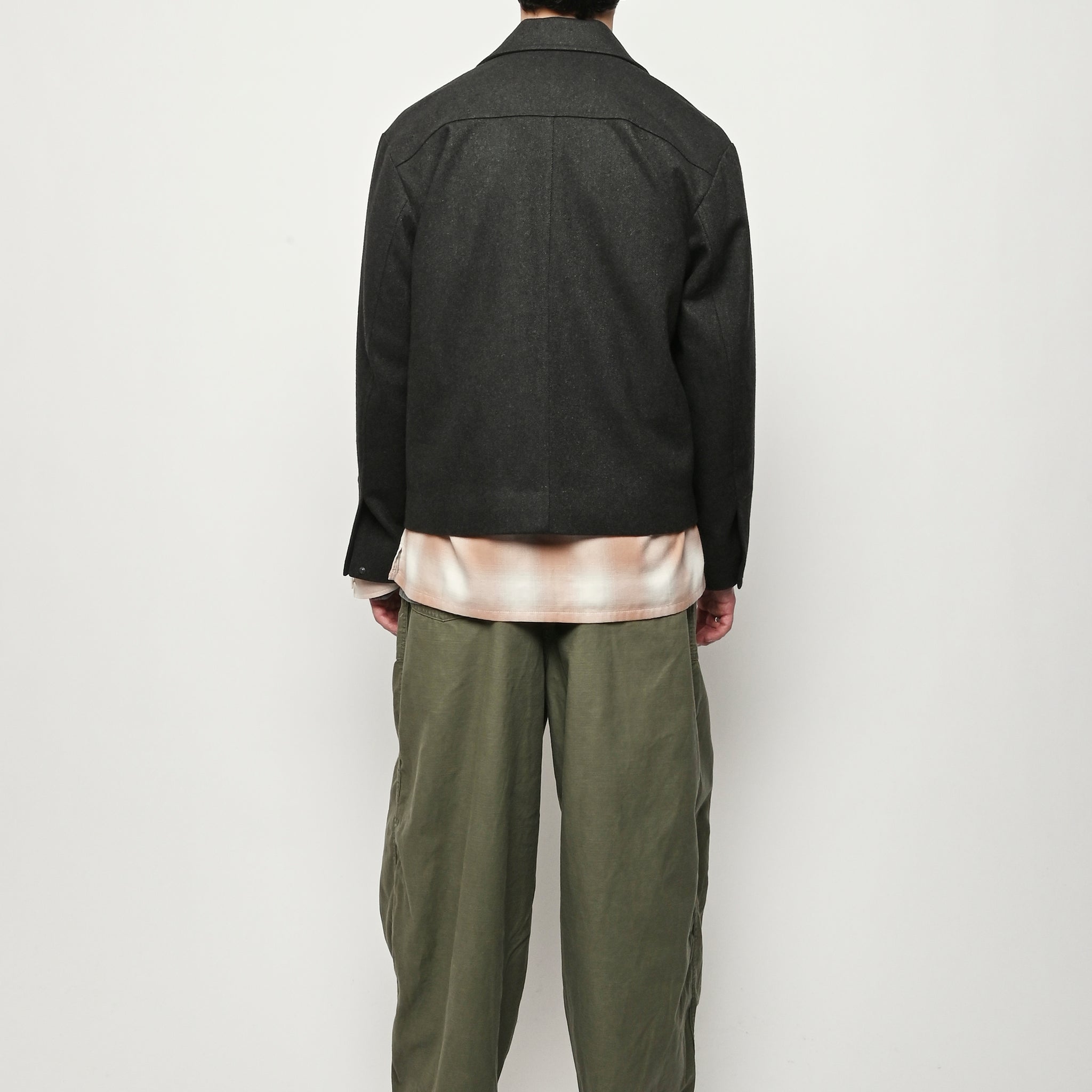 A short wool sports jacket, constructed from a heavy wool twill cloth from Italian mill Balli. Cut with a relaxed boxy fit, this style features a front branded snap closure, slanted welt pockets, chest welt pocket, set-in sleeves, and lined with compact lining for wind proofing.