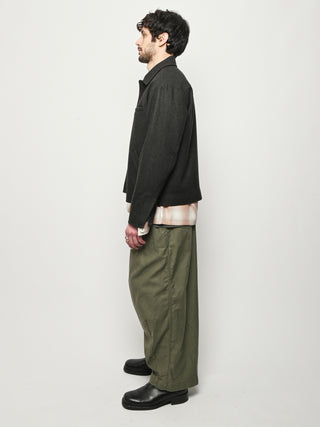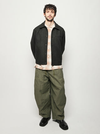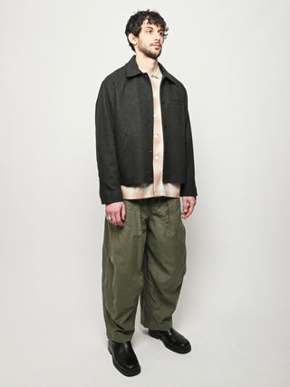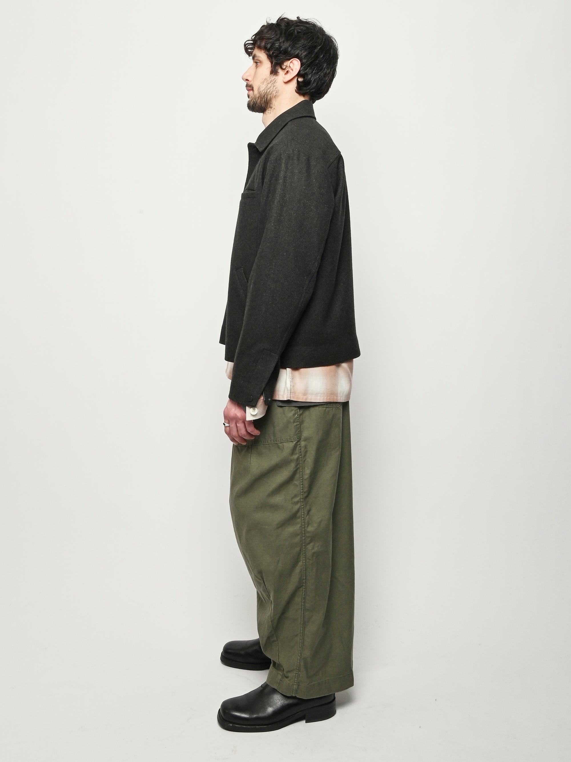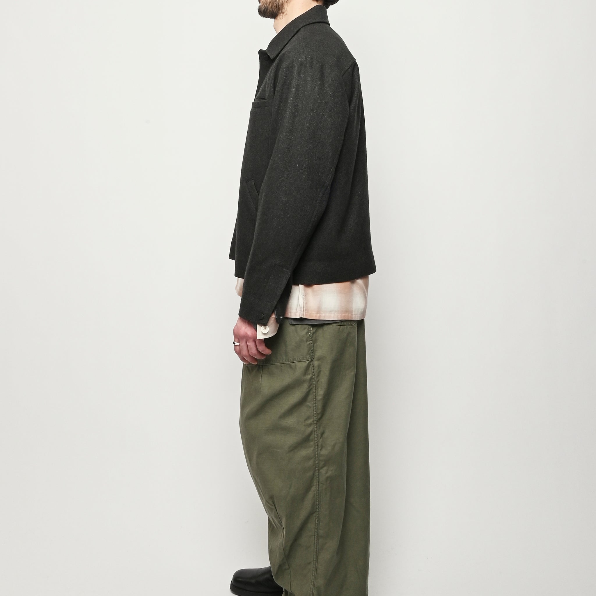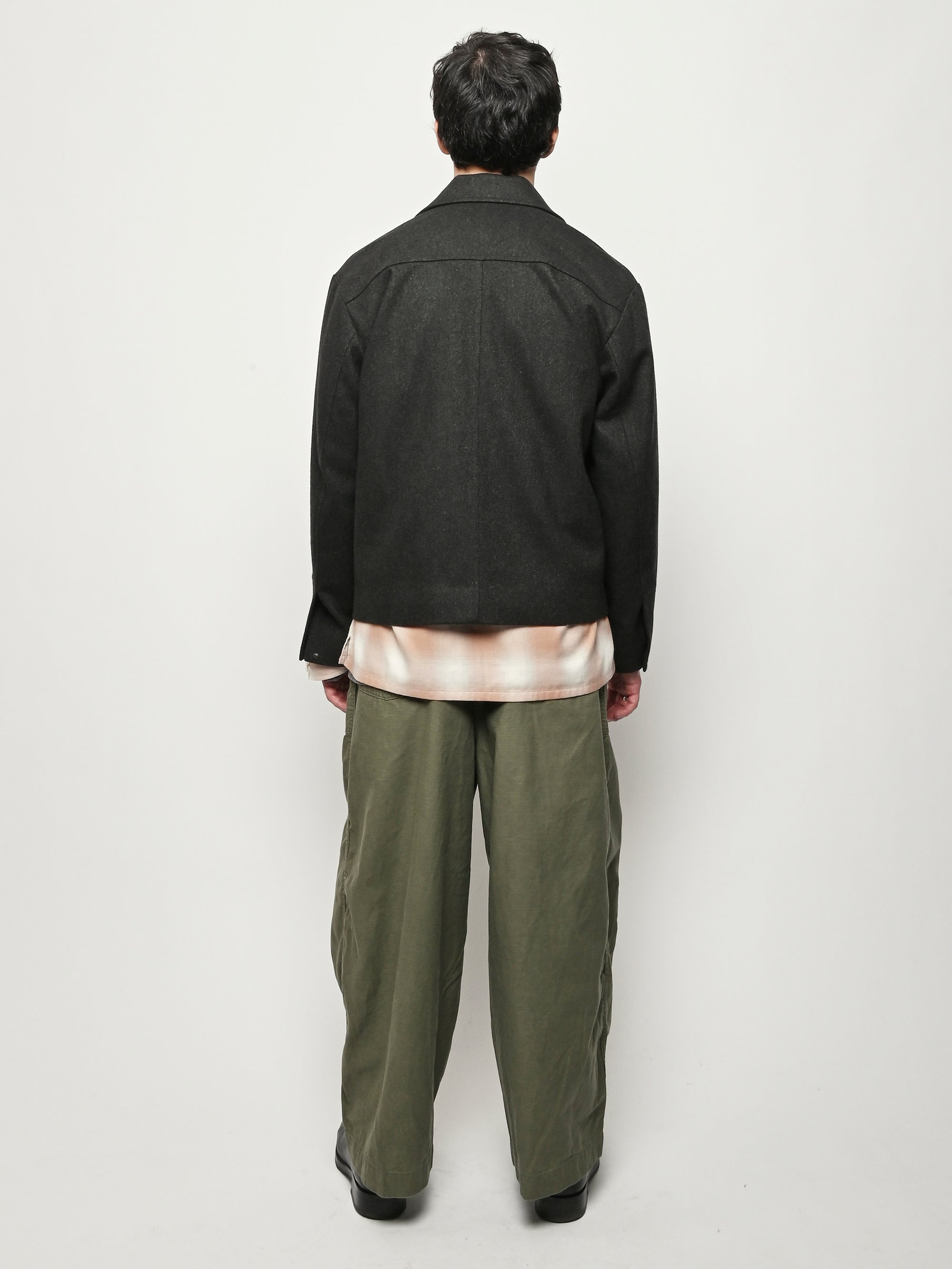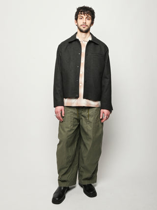 A short wool sports jacket, constructed from a heavy wool twill cloth from Italian mill Balli. Cut with a relaxed boxy fit, this style features a front branded snap closure, slanted welt pockets, chest welt pocket, set-in sleeves, and lined with compact lining for wind proofing.
