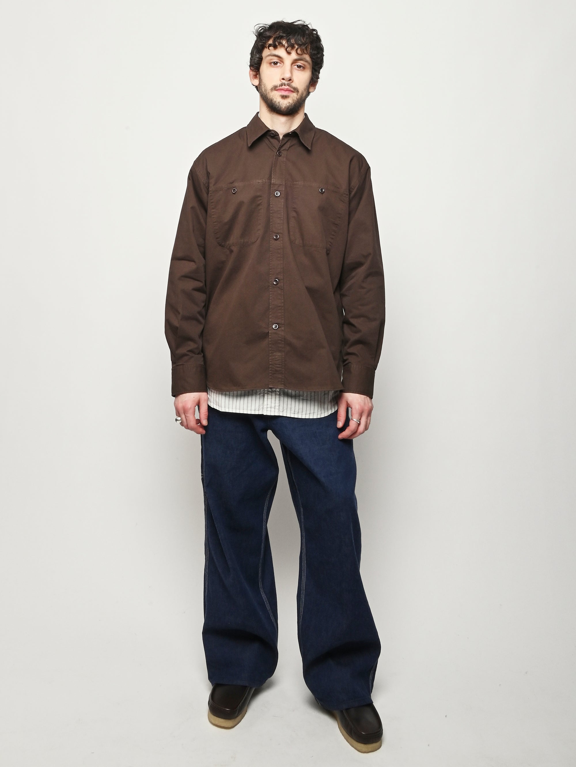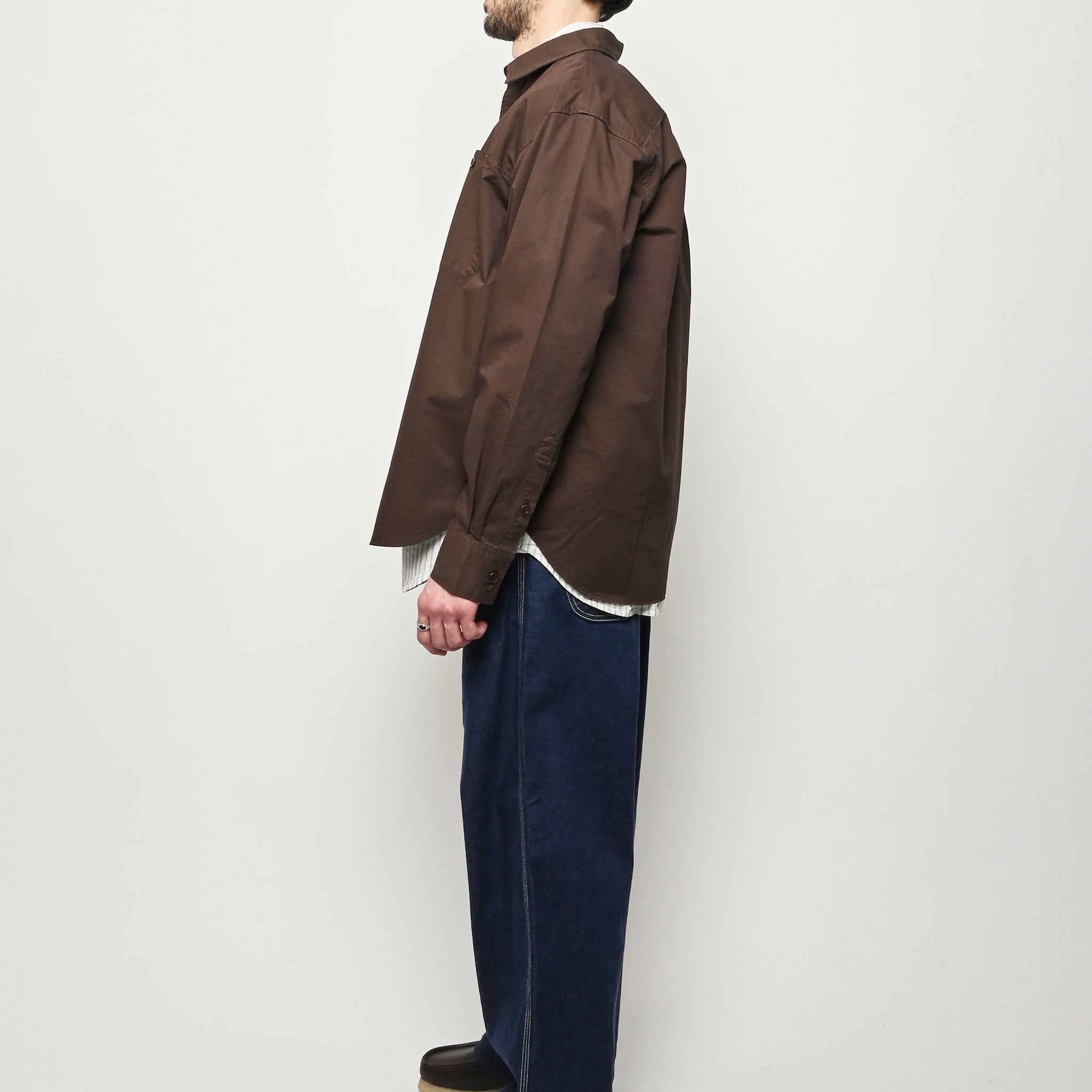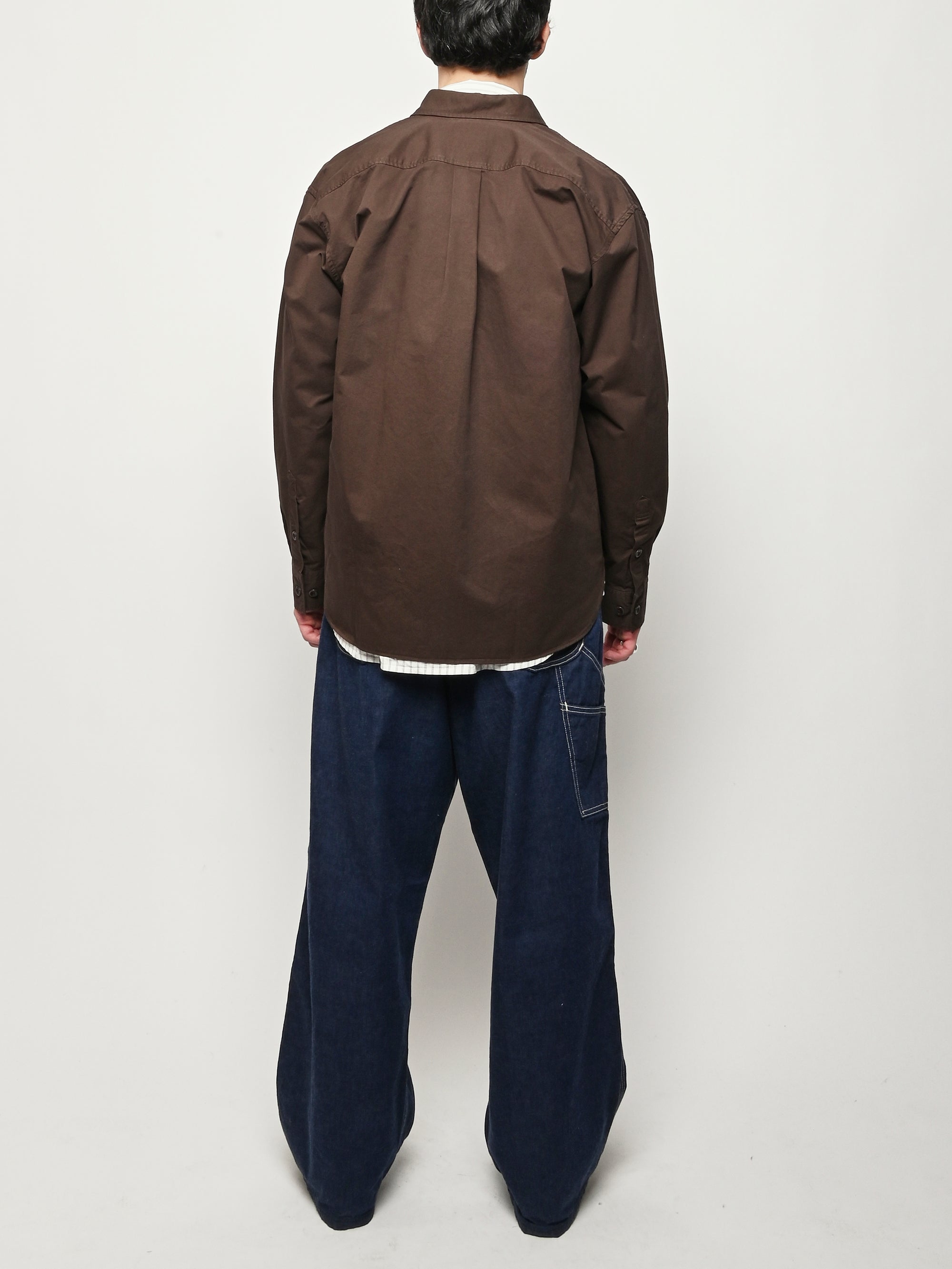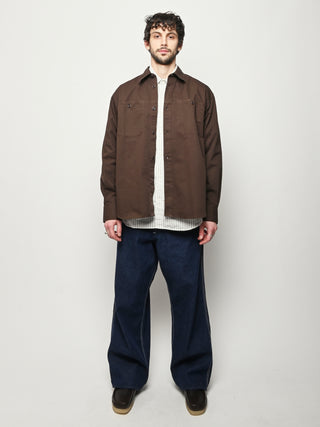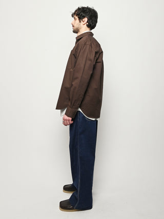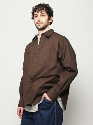 A relaxed fitting shirt, with a wider body constructed from a fine cotton twill. The shirt is garment-dyed in a deep rich colour. Features front inseam chest pockets, a box pleat at the back, heavy top stitching, shaped hem and corozo buttons.