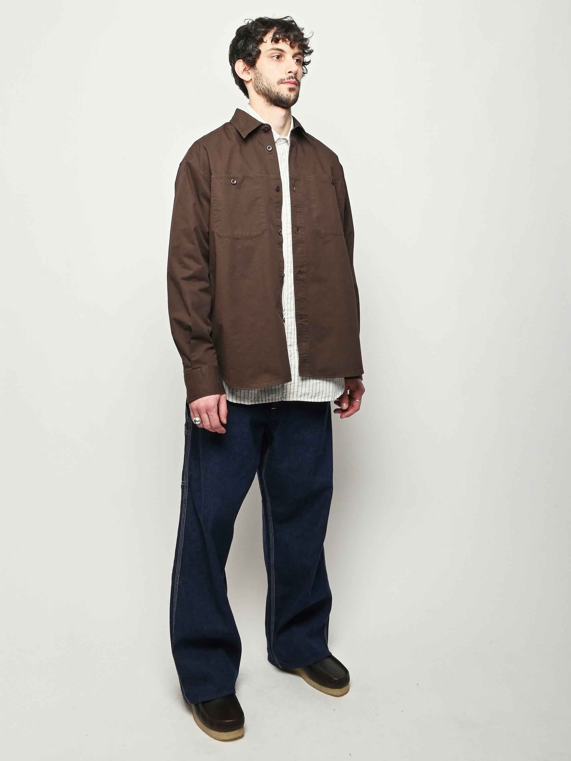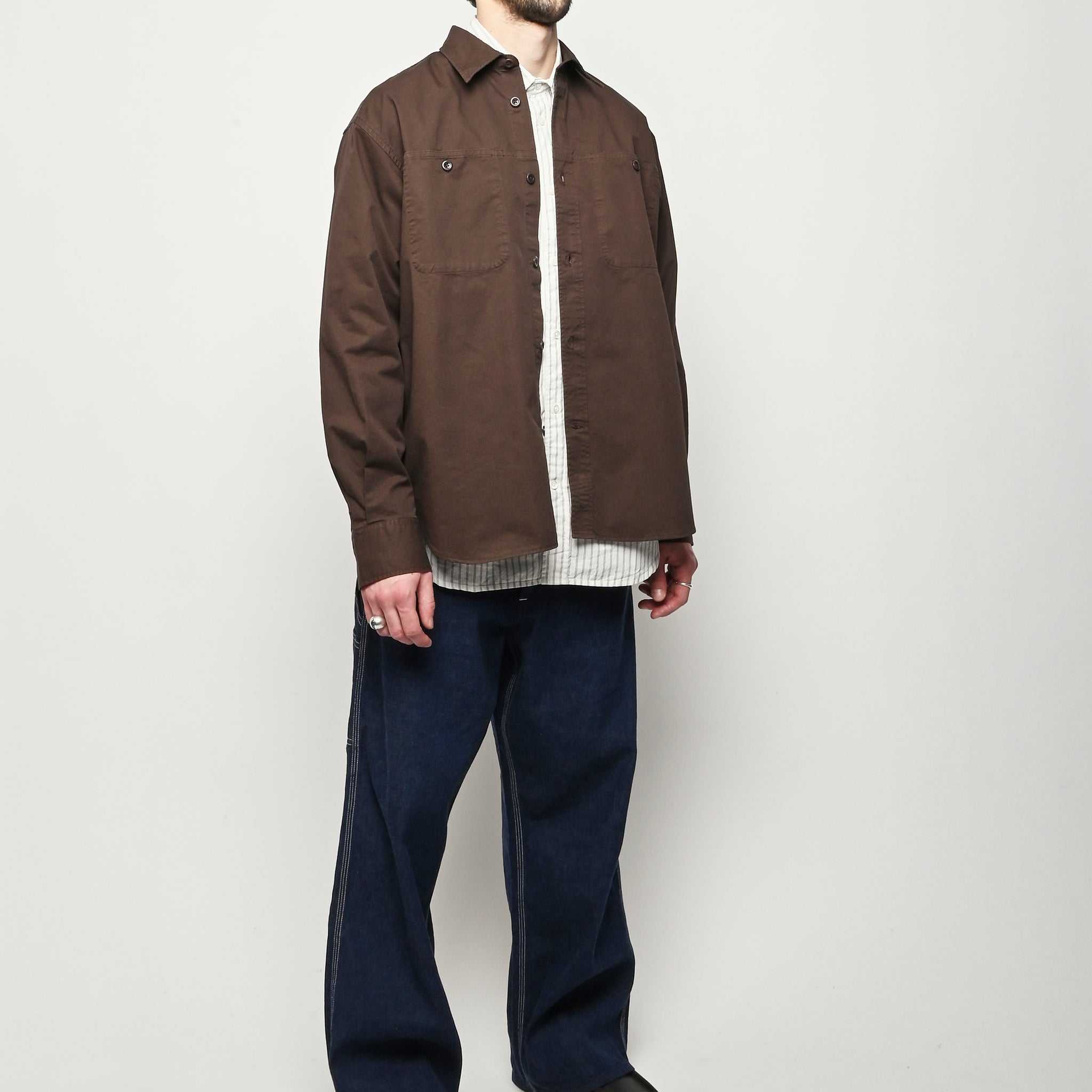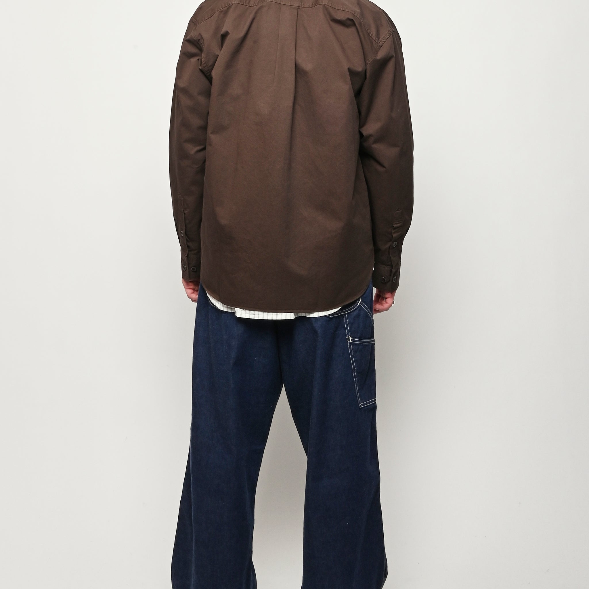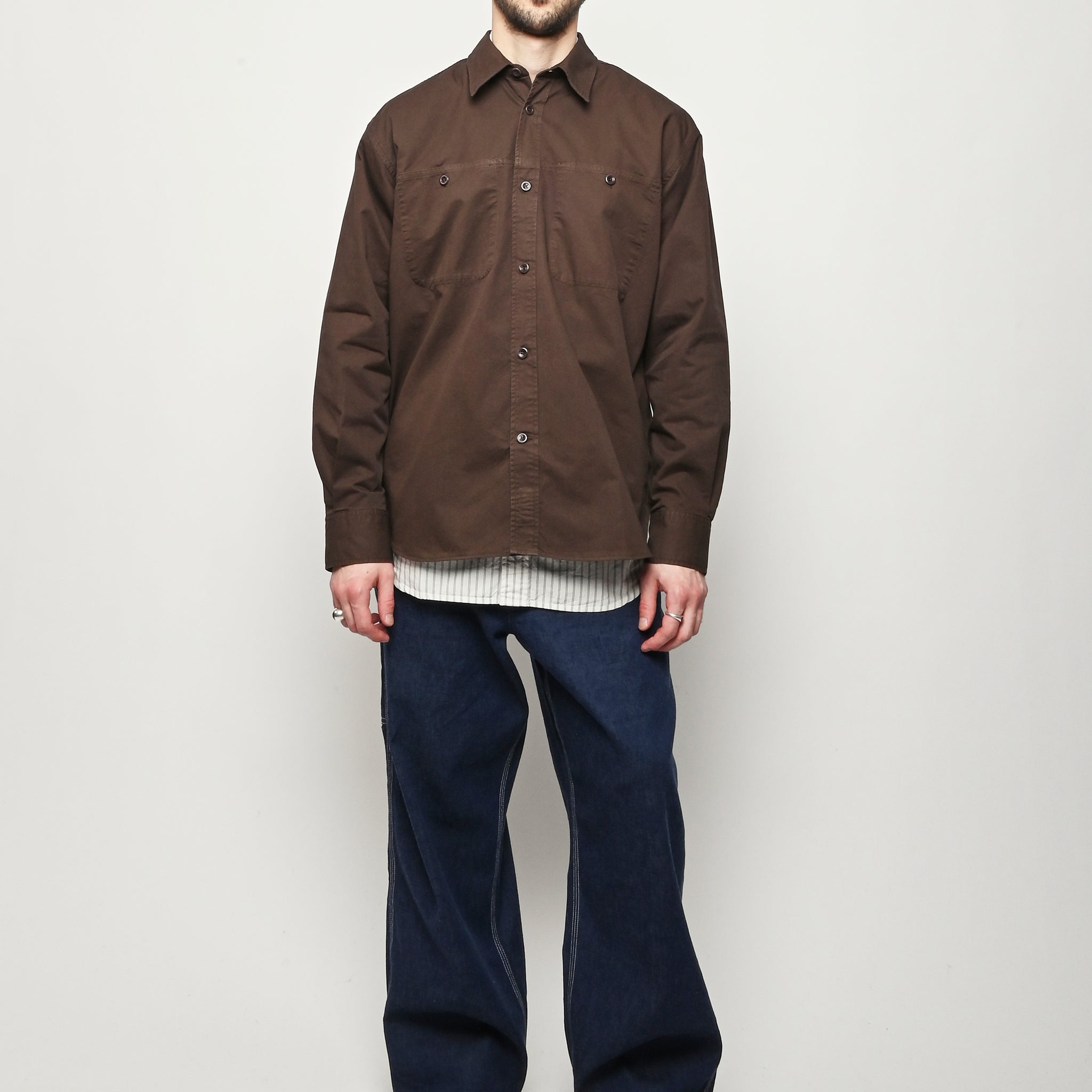 A relaxed fitting shirt, with a wider body constructed from a fine cotton twill. The shirt is garment-dyed in a deep rich colour. Features front inseam chest pockets, a box pleat at the back, heavy top stitching, shaped hem and corozo buttons.
