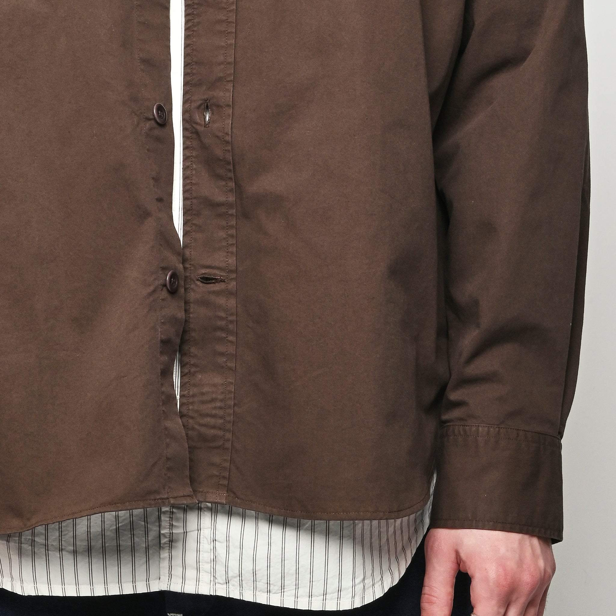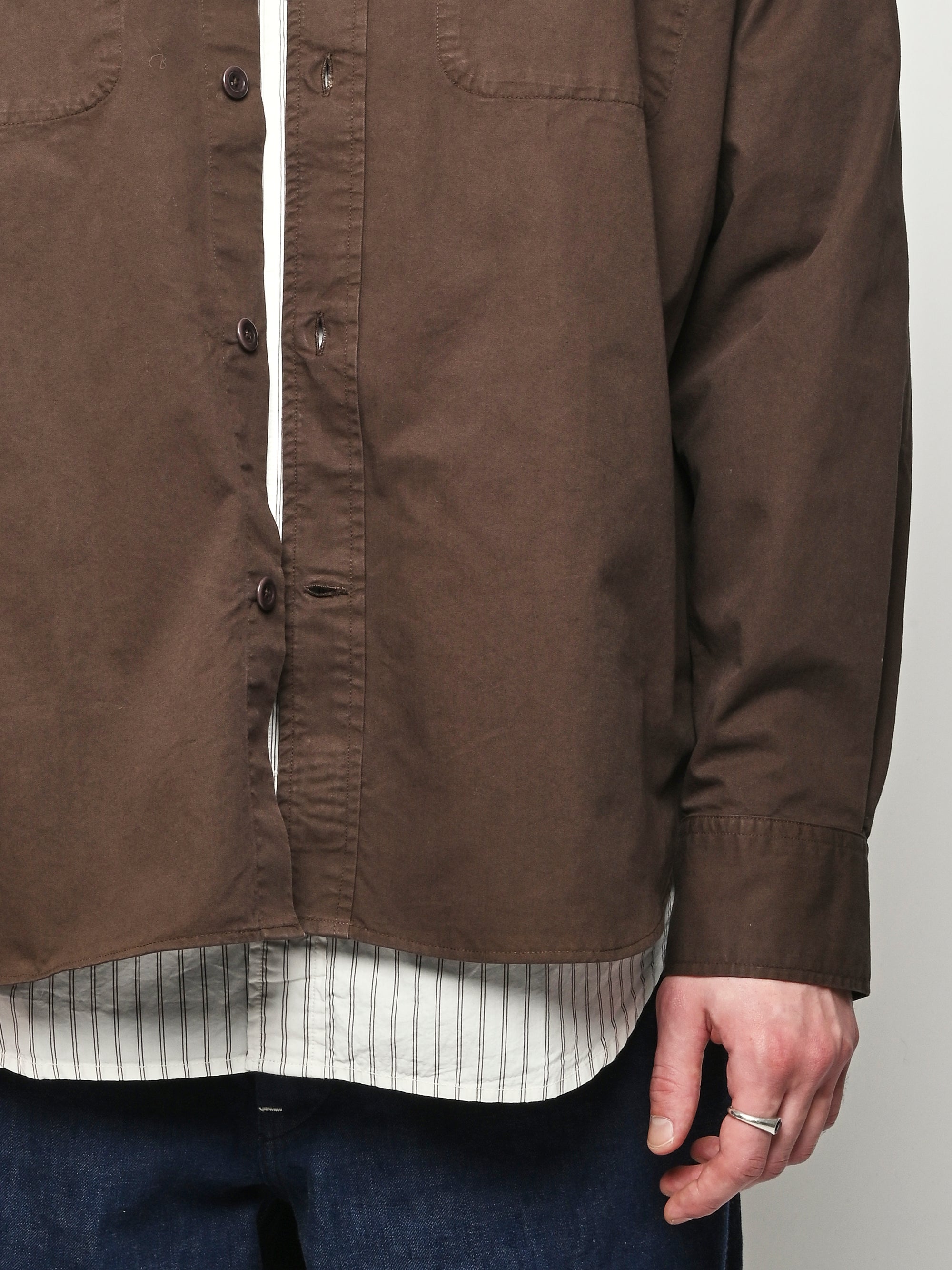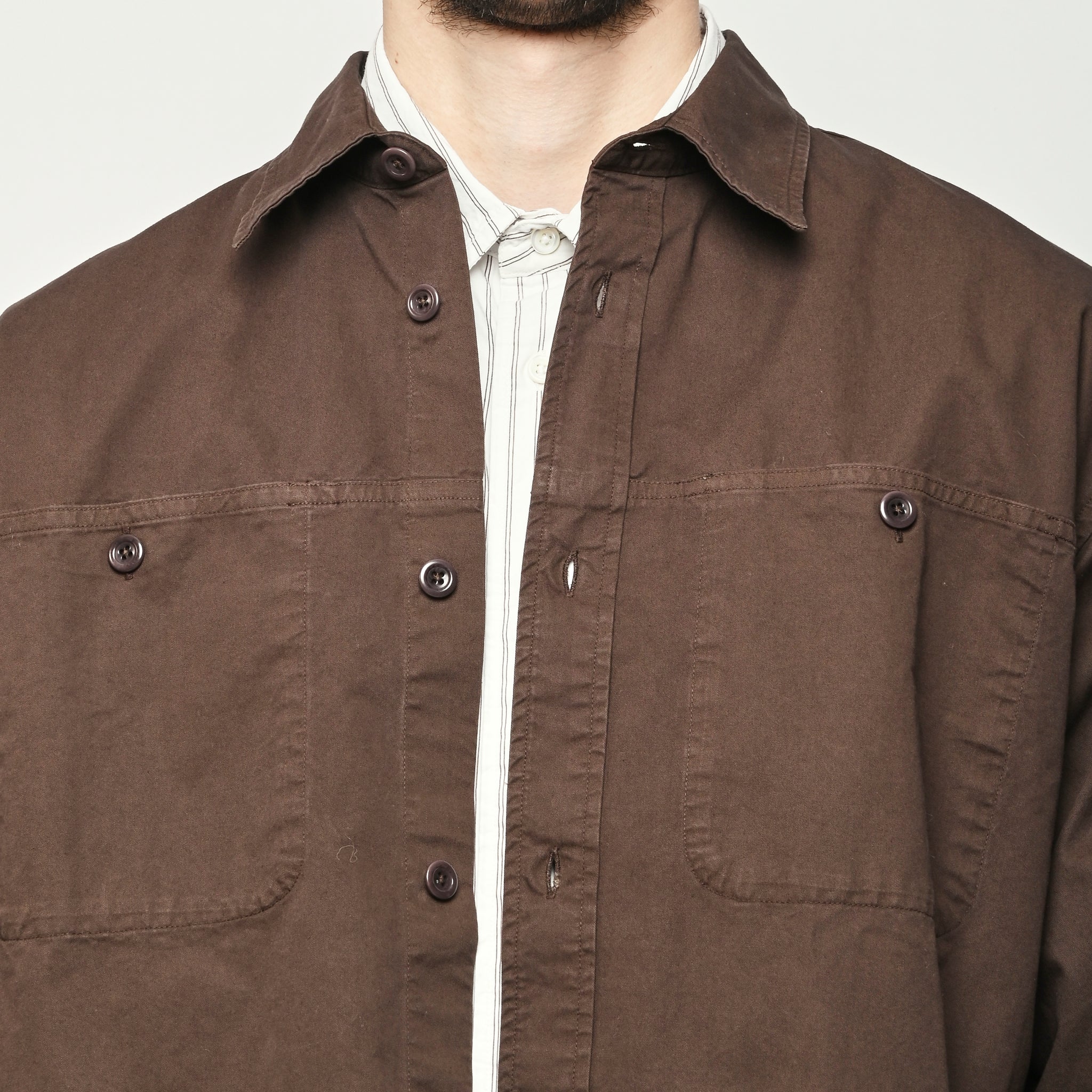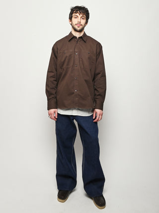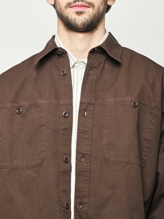 A relaxed fitting shirt, with a wider body constructed from a fine cotton twill. The shirt is garment-dyed in a deep rich colour. Features front inseam chest pockets, a box pleat at the back, heavy top stitching, shaped hem and corozo buttons.