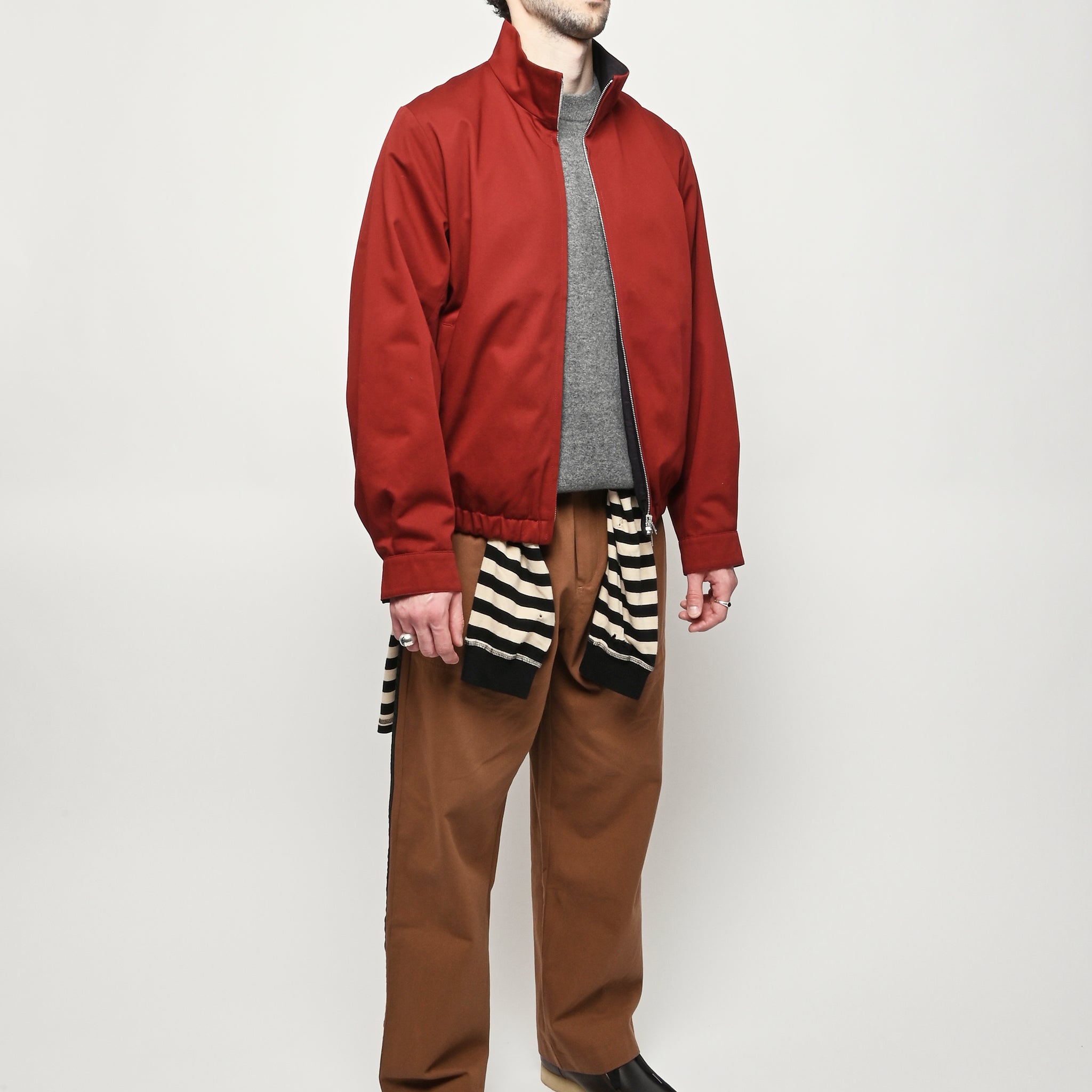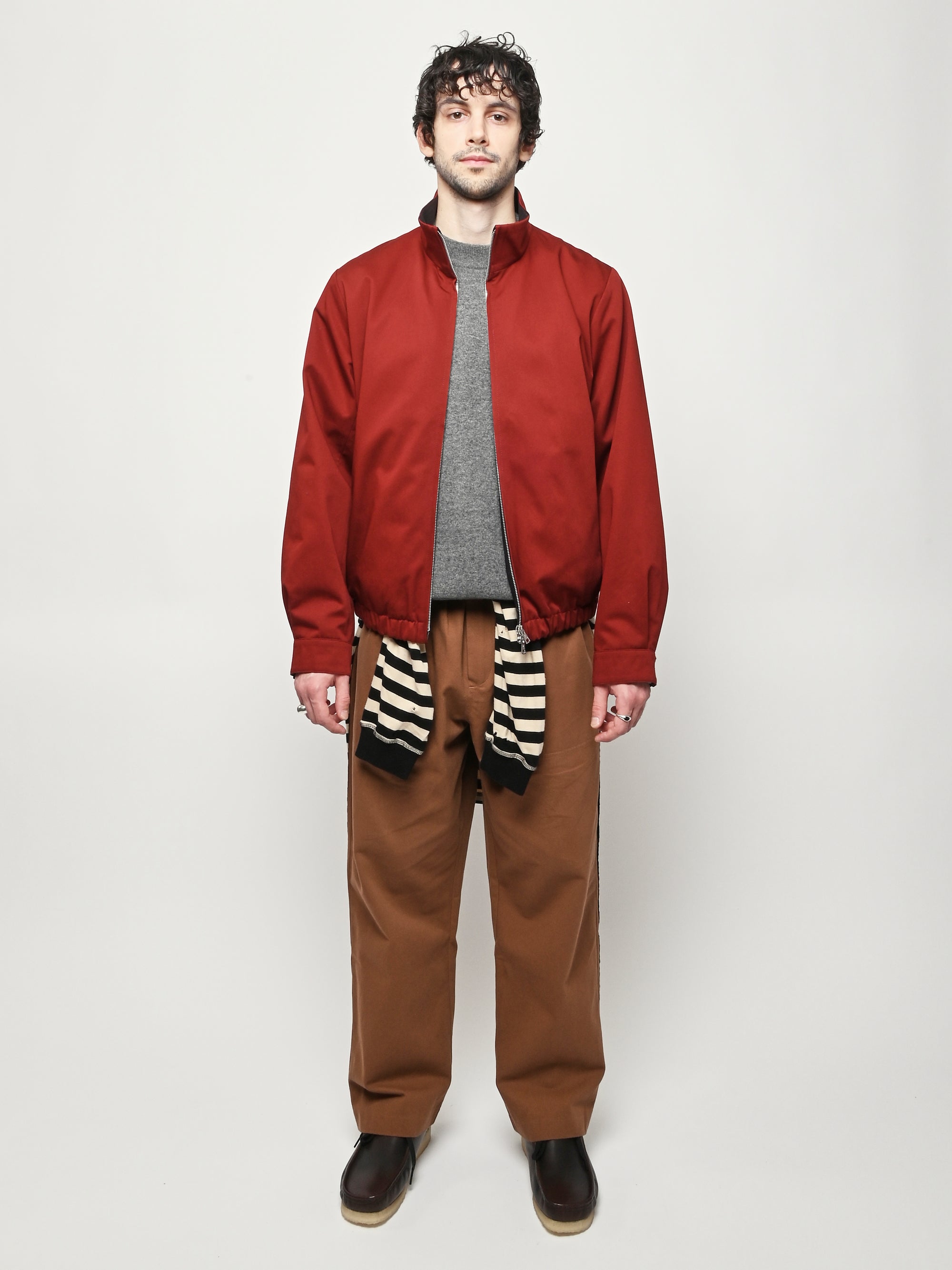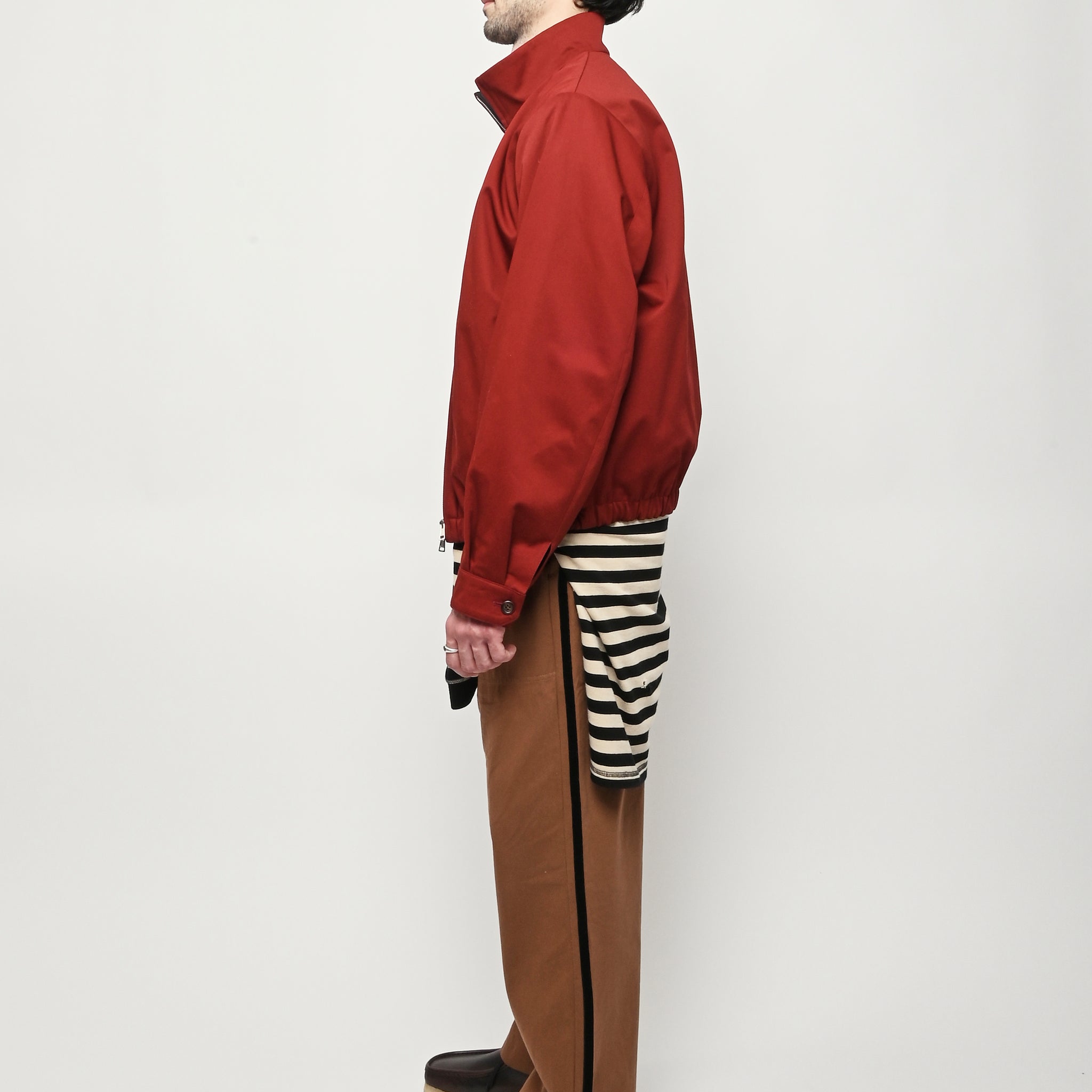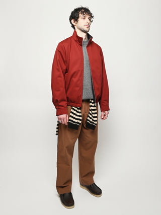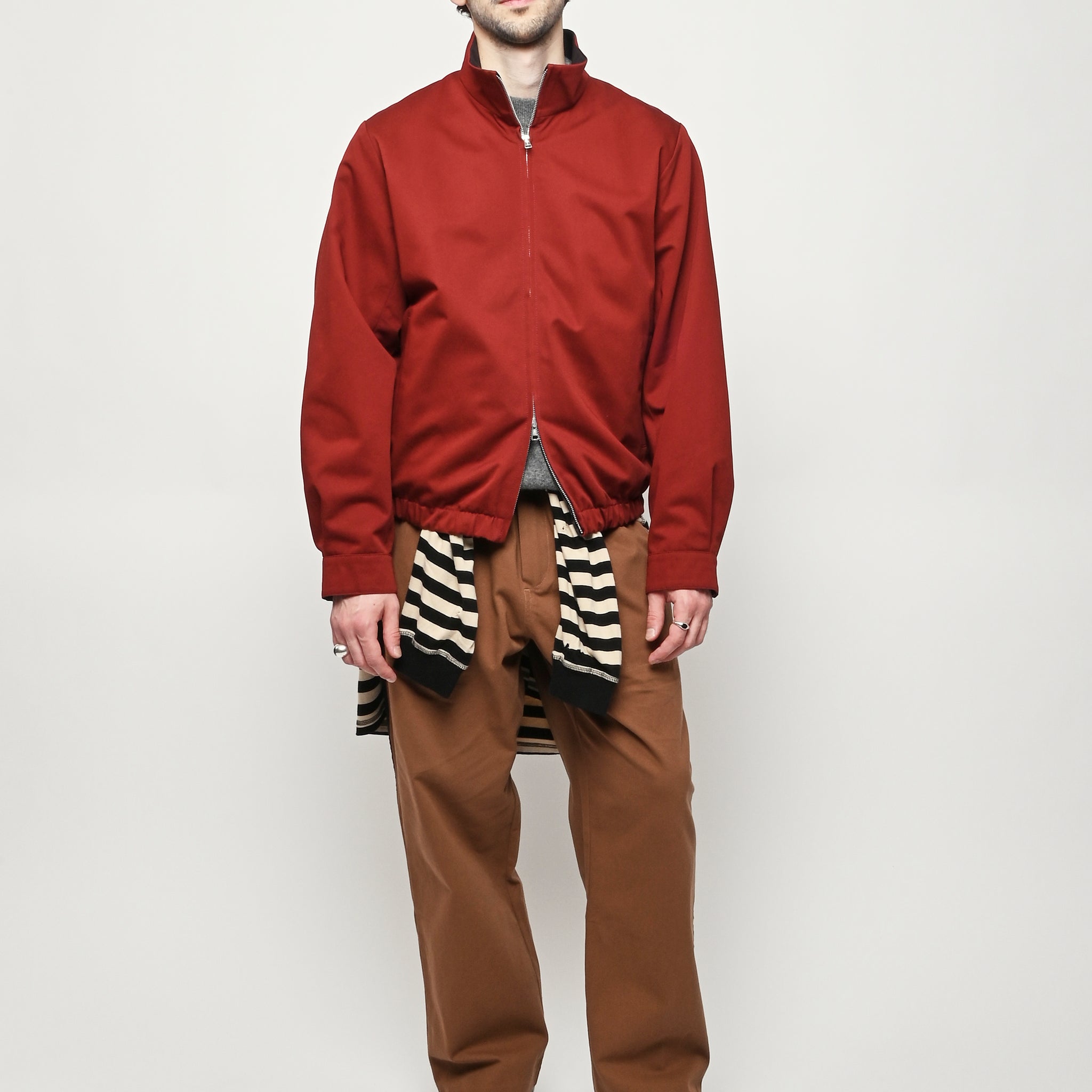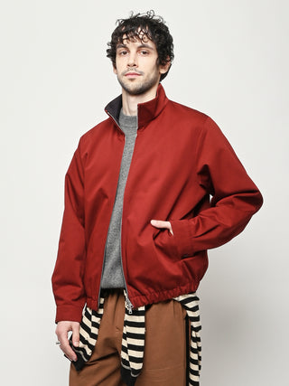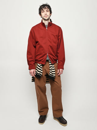 Our Legacy Casino Jacket in Profound Red Megatwist Twill. Produced in Italian twill fabric with a subtle sheen, the men's Casino Jacket has a short, boxy fit and features a funnel neck collar, Lampo two-way zip, horn button cuffs, contrast inside facing and necklines, and an elastic hem. The Harrington-inspired style offers Our Legacy's oversized interpretation of everyday staples, sitting on the hips with a relaxed silhouette.