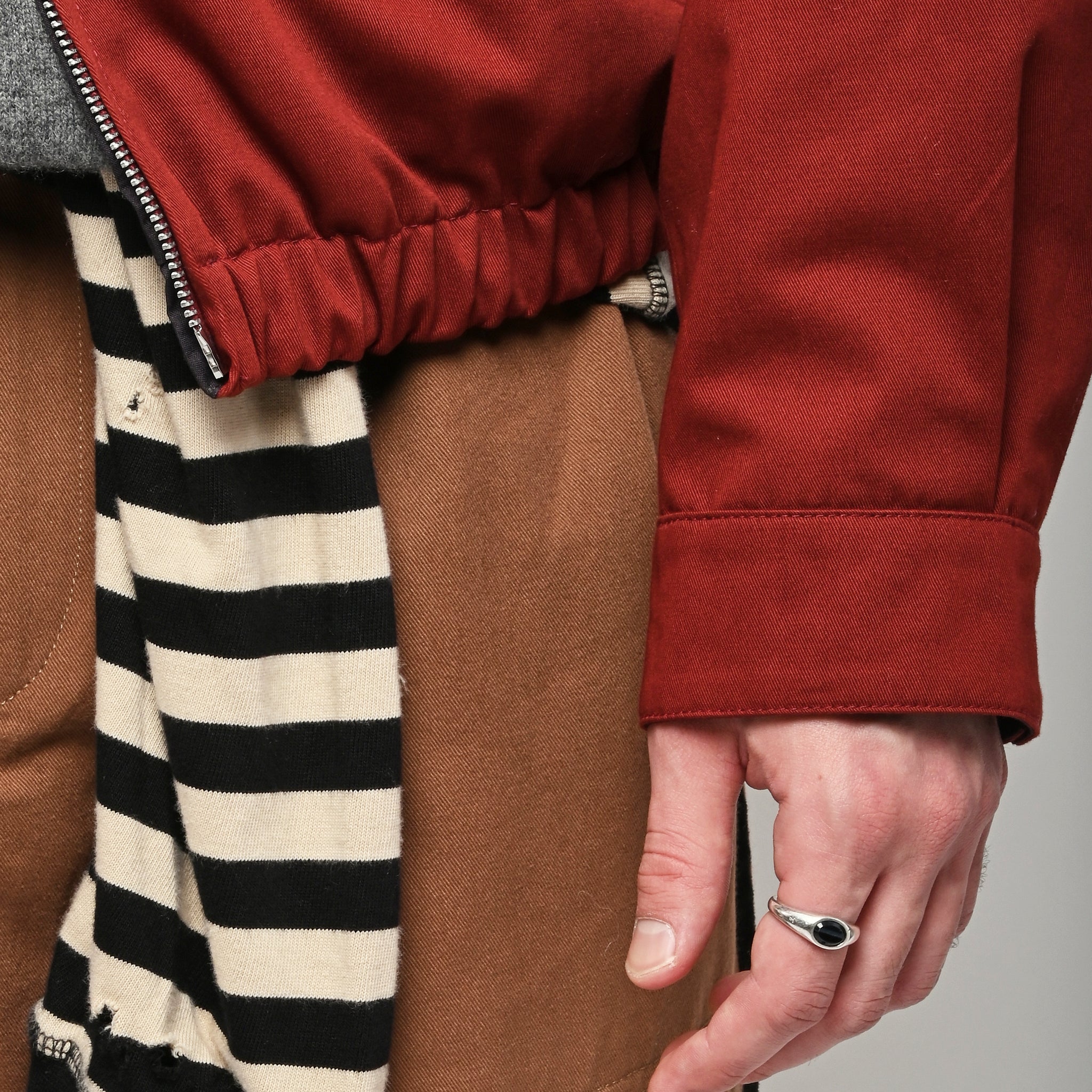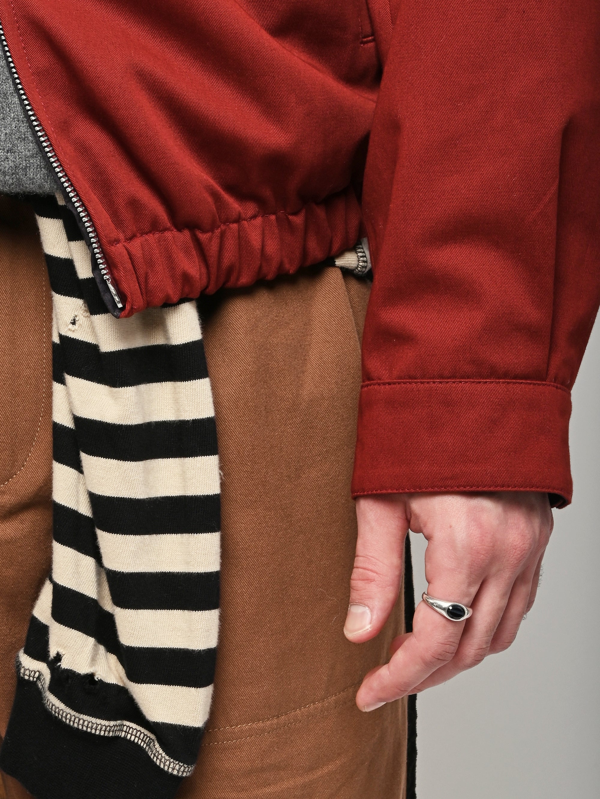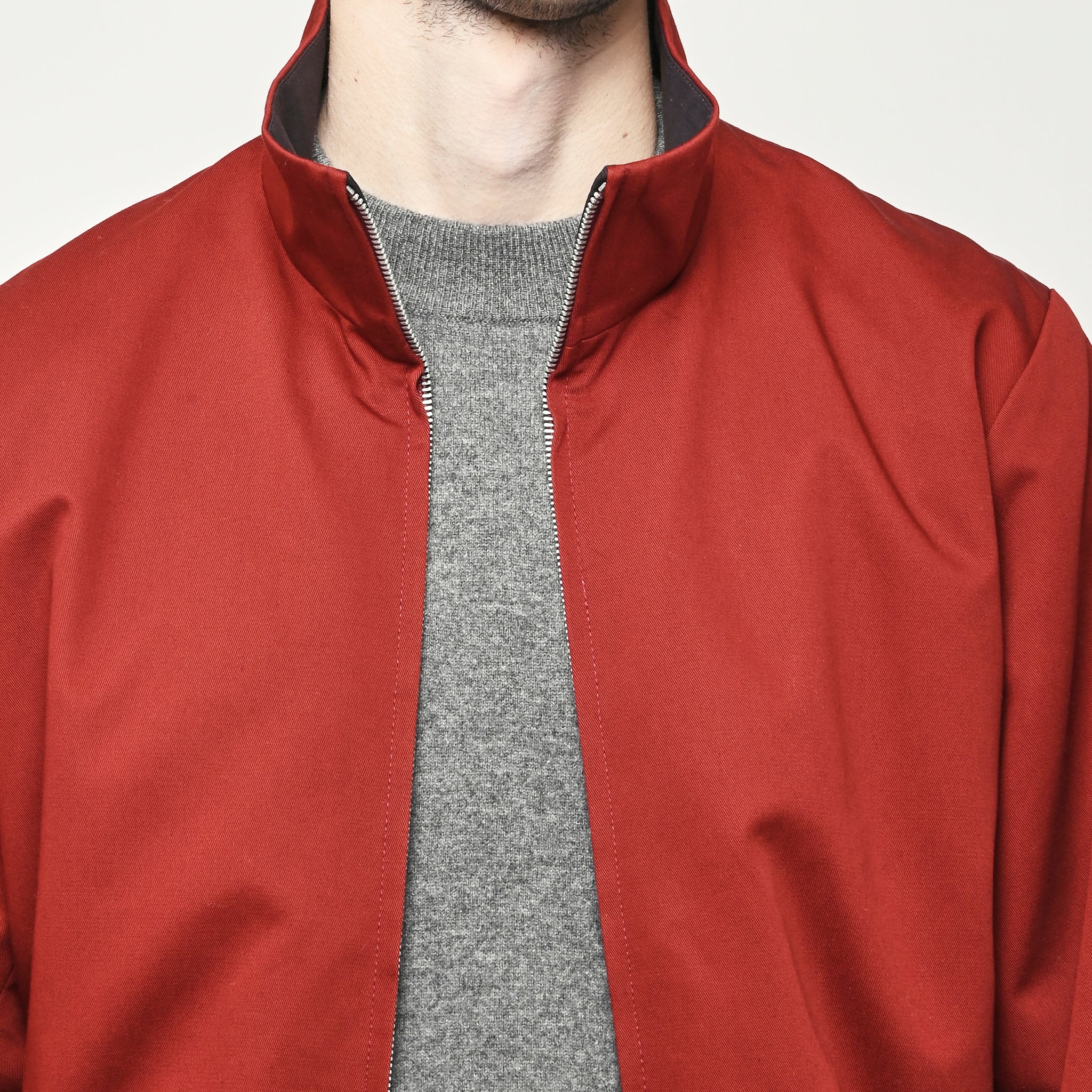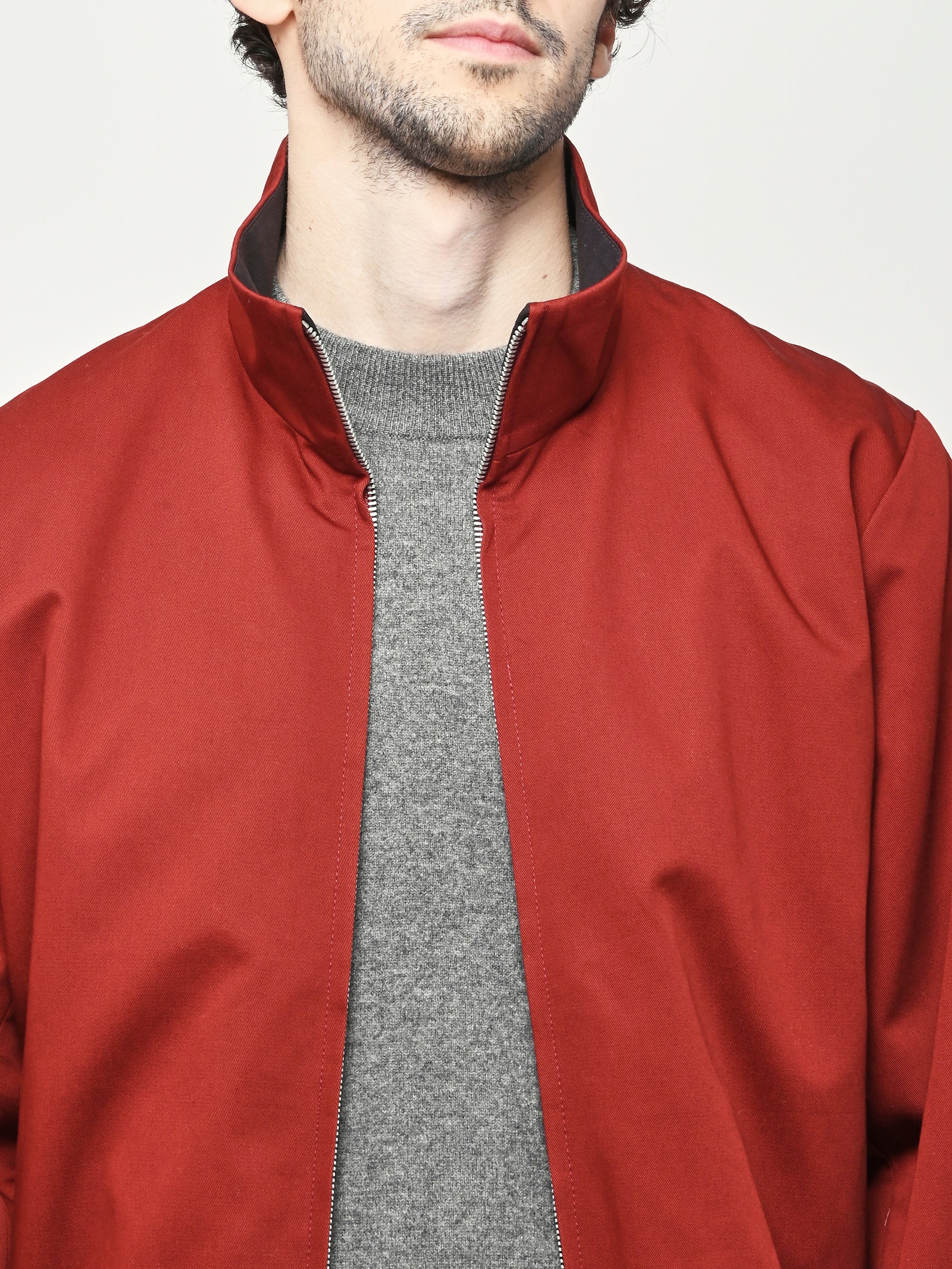 Our Legacy Casino Jacket in Profound Red Megatwist Twill. Produced in Italian twill fabric with a subtle sheen, the men's Casino Jacket has a short, boxy fit and features a funnel neck collar, Lampo two-way zip, horn button cuffs, contrast inside facing and necklines, and an elastic hem. The Harrington-inspired style offers Our Legacy's oversized interpretation of everyday staples, sitting on the hips with a relaxed silhouette.