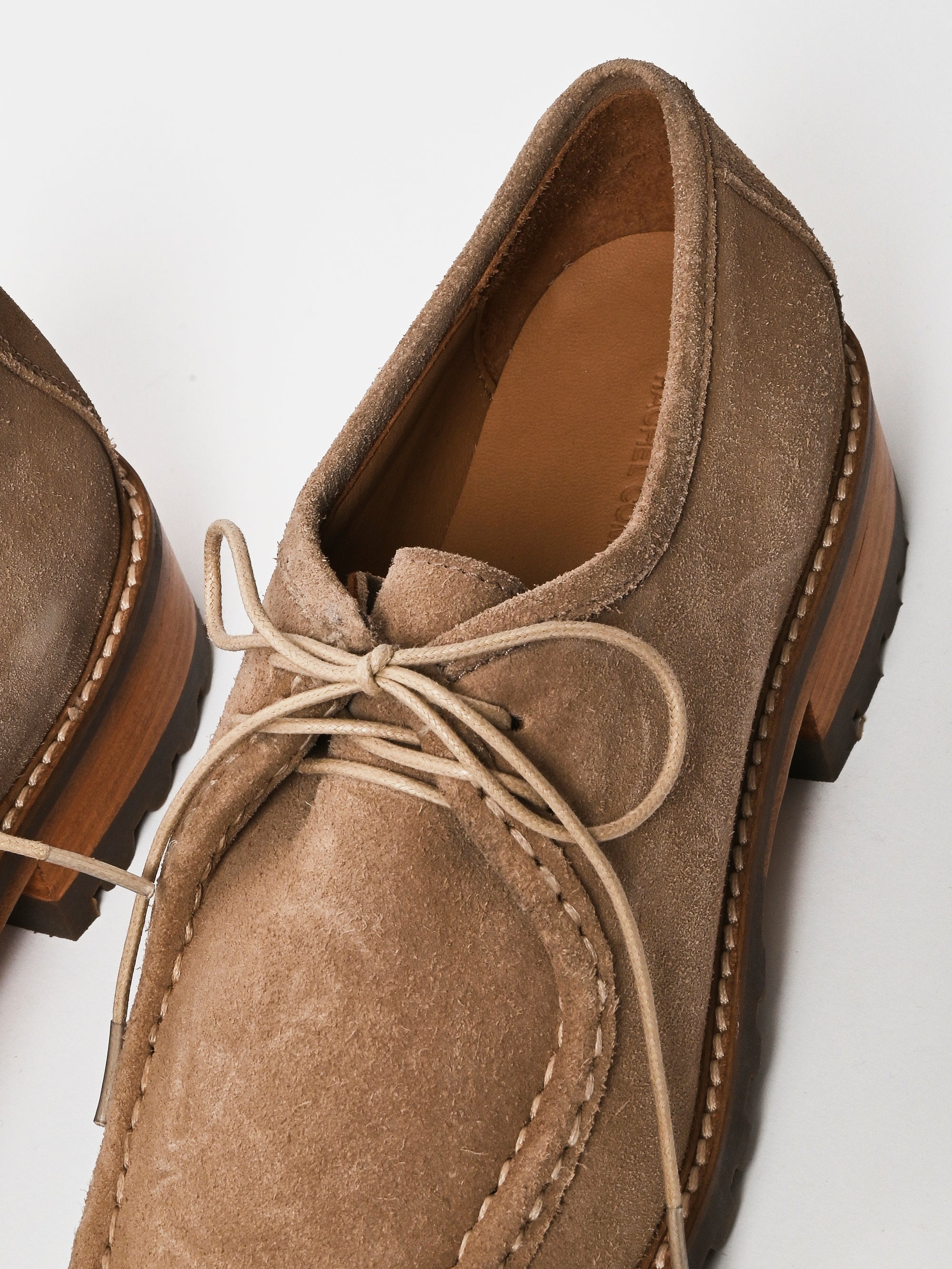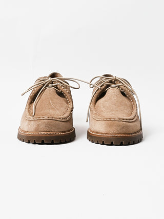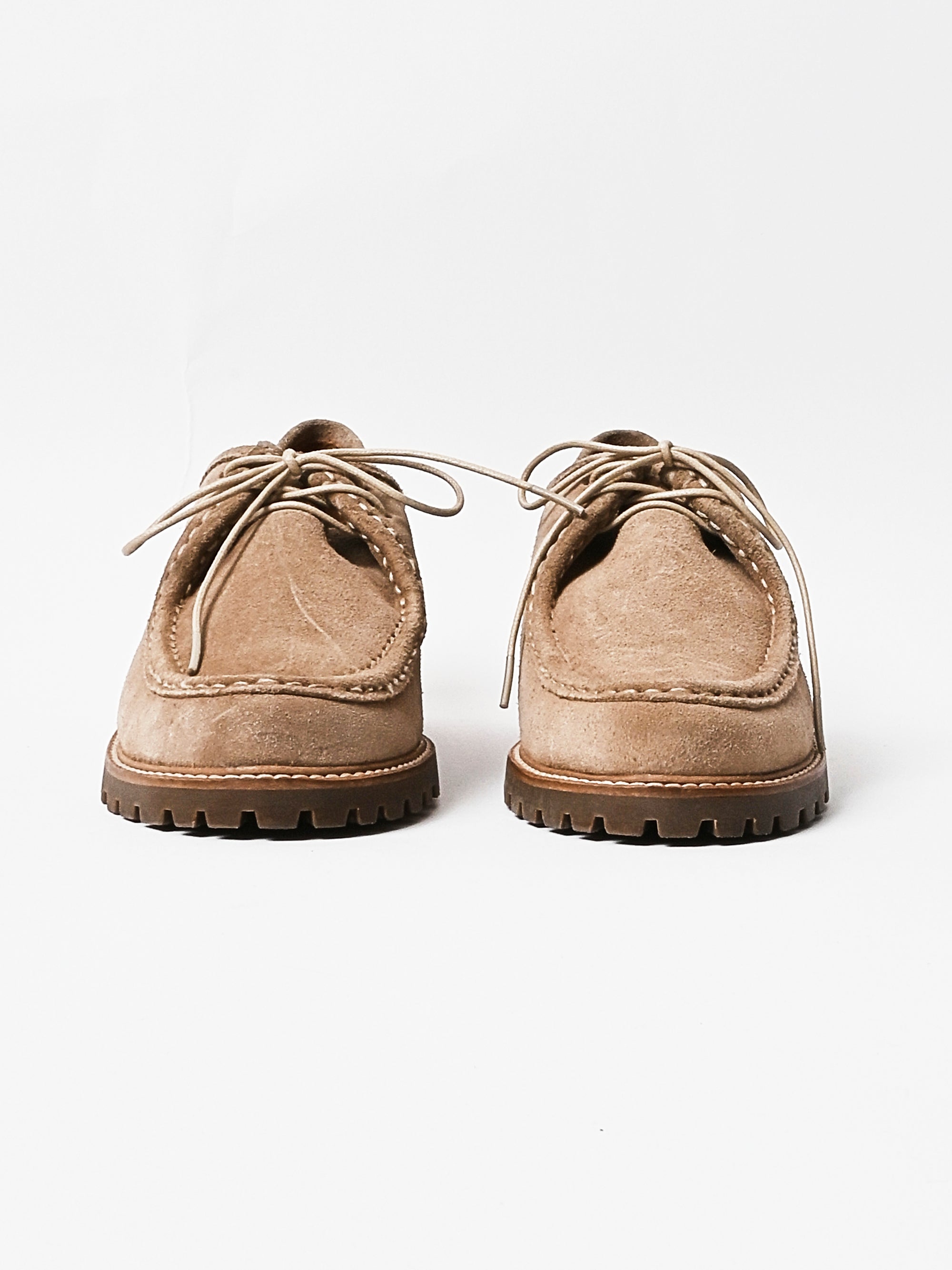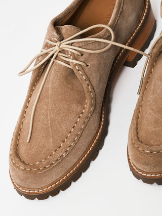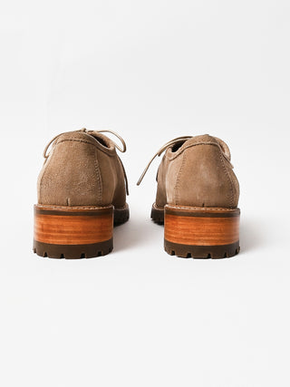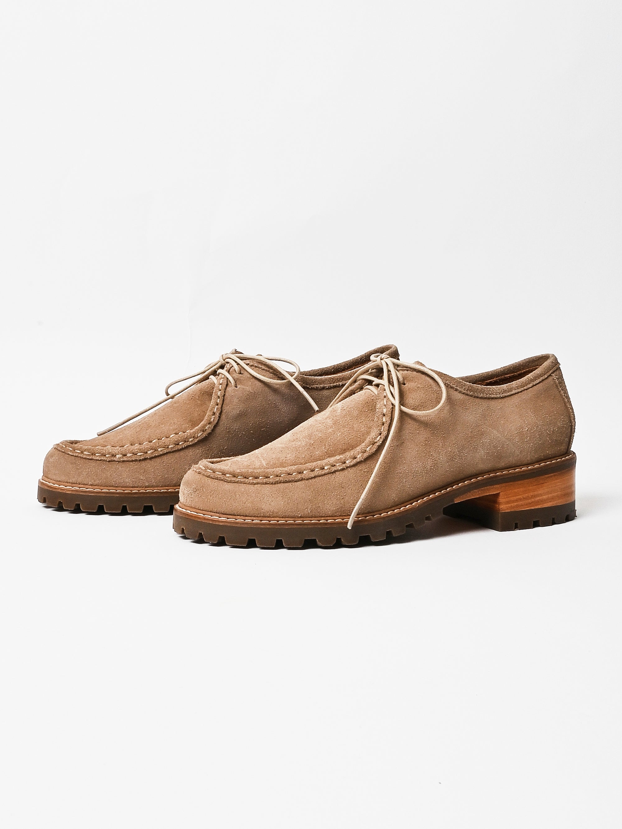Low-profile wallabee-constructed shoe crafted from soft suede with an almond toe and hand-stitched apron seam. Features a lace-up front that kisses at the top, stitched-out construction at the vamp, padded insoles for added comfort, and a sturdy rubber lug sole with a stacked heel.