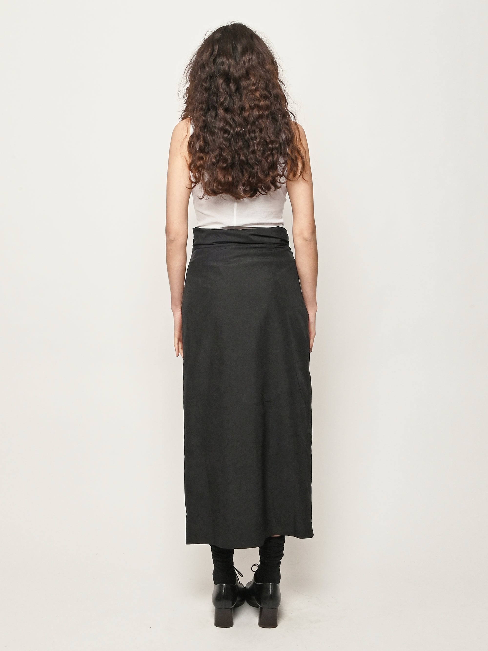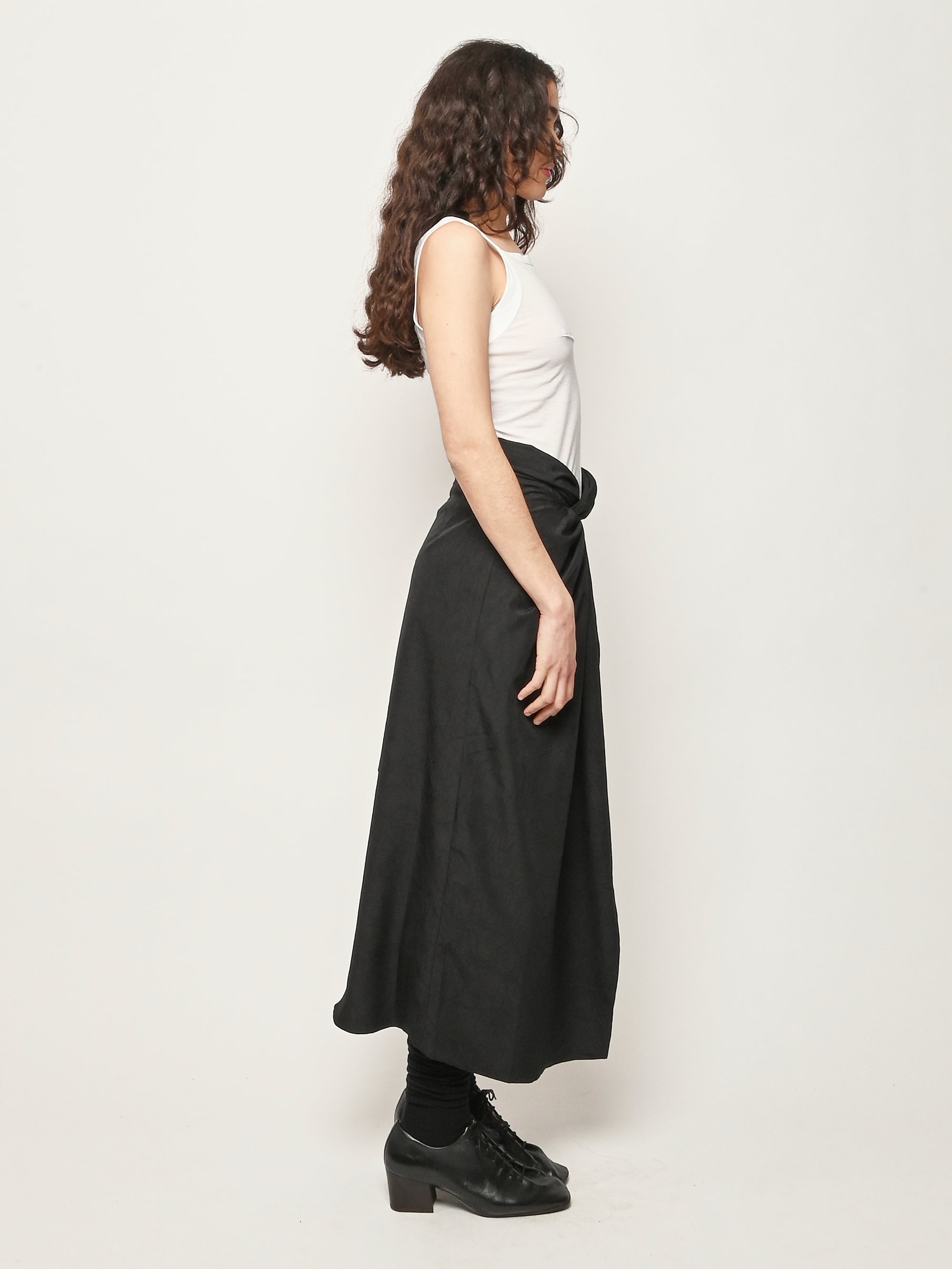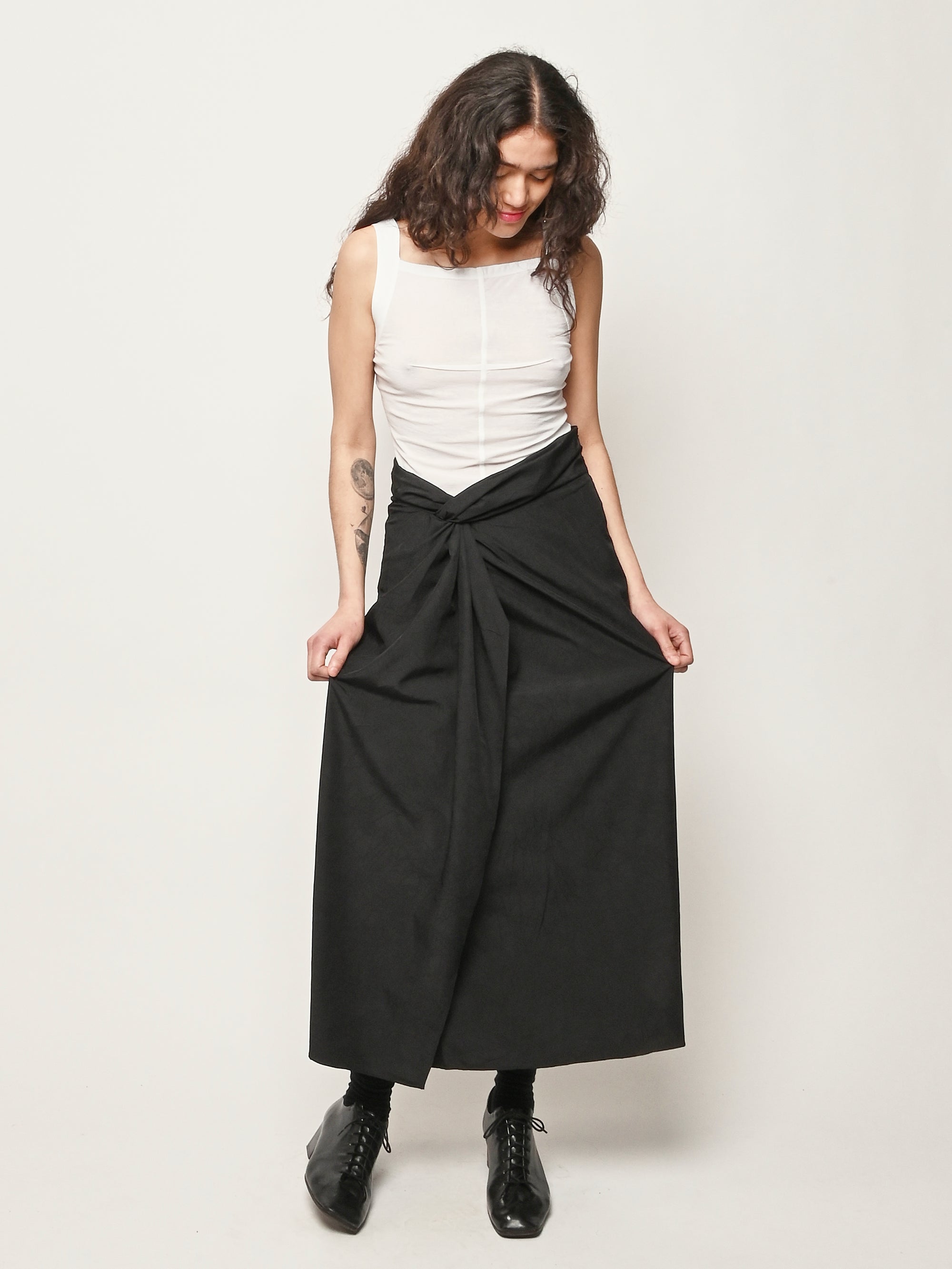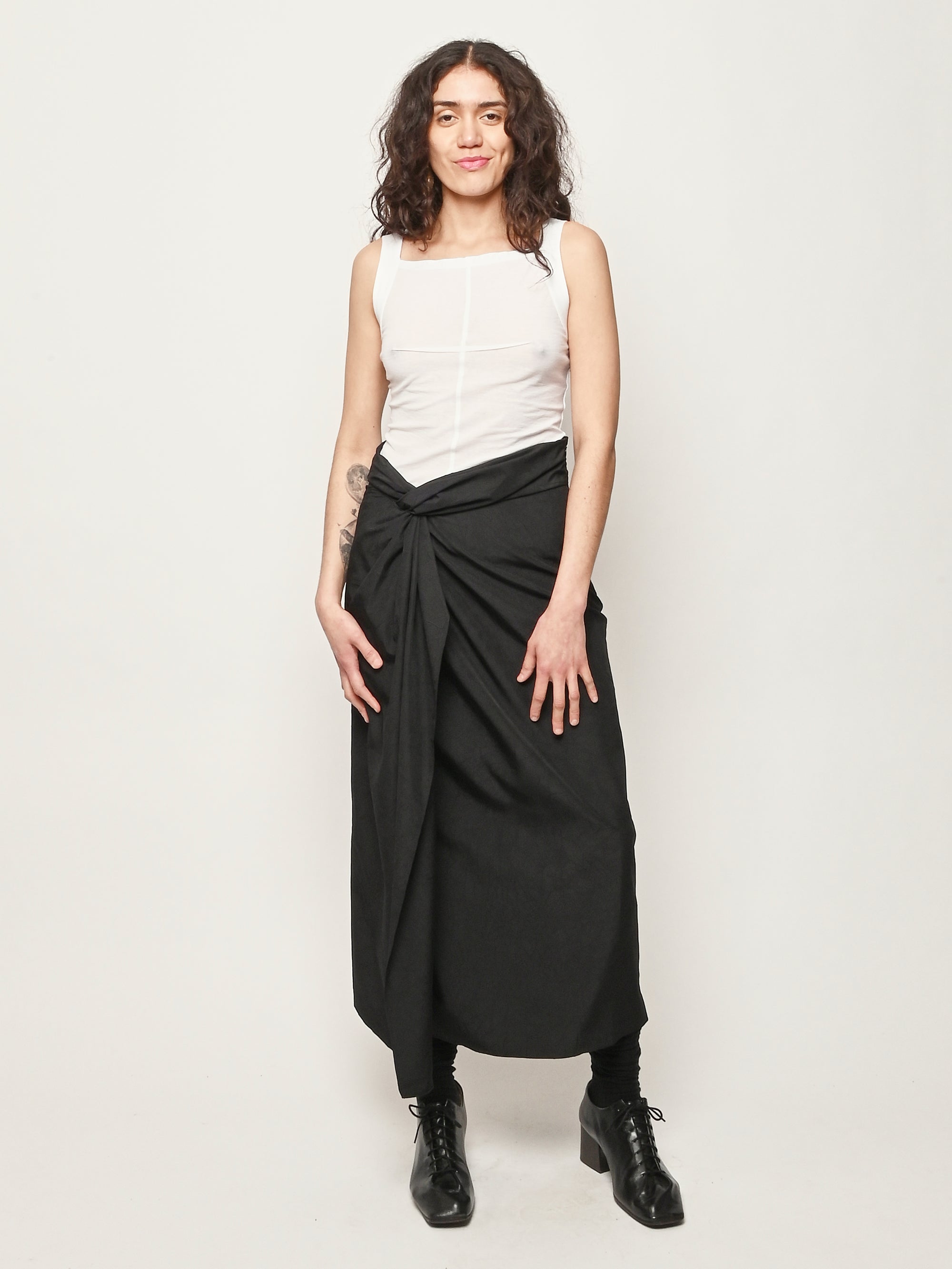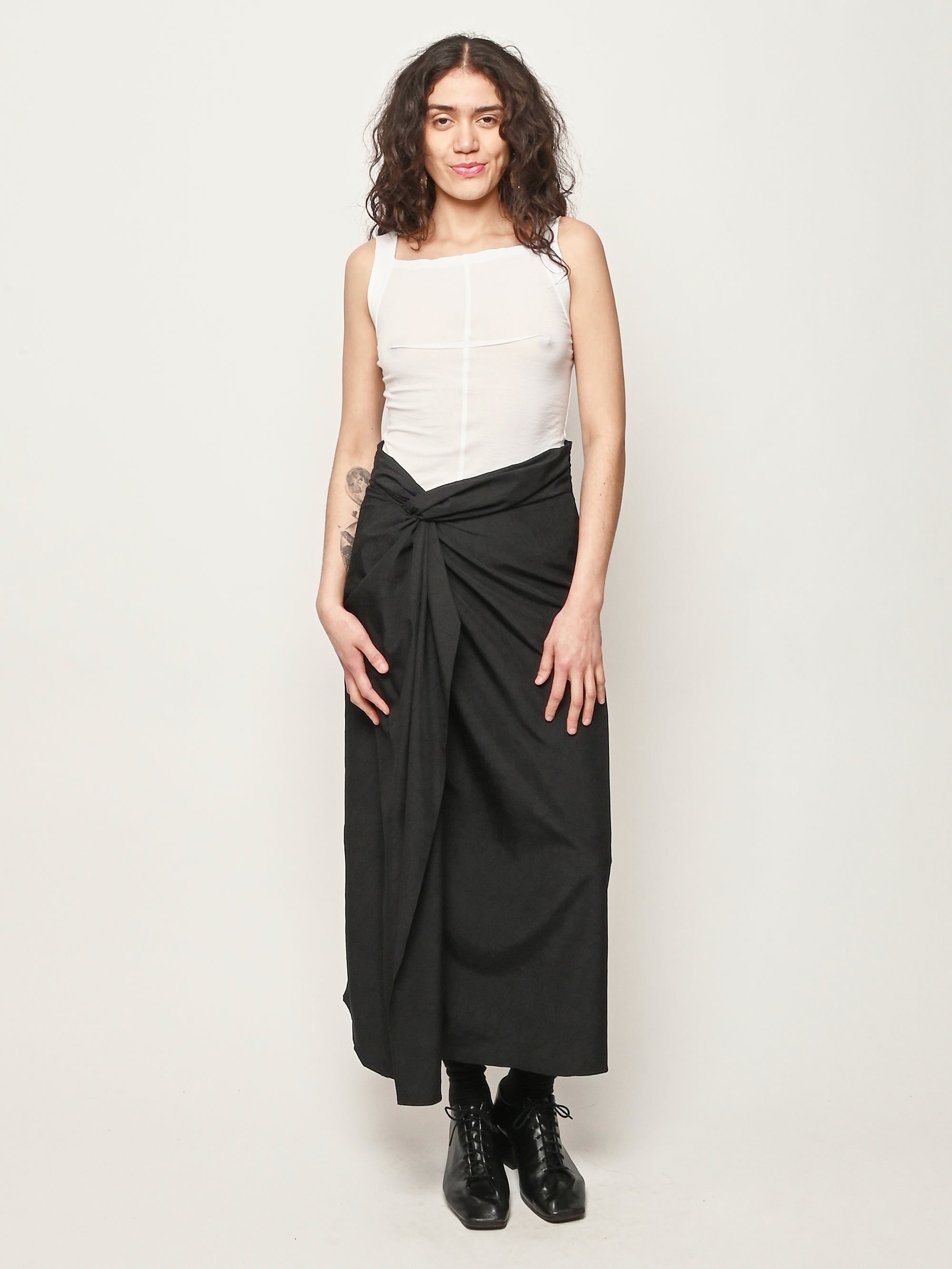 A sarong style skirt by Róhe faturing a knot detail and gathered fabric at the waistband. A concealed zip fastening ensures ease of wear.