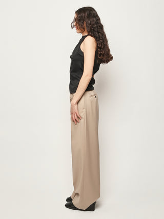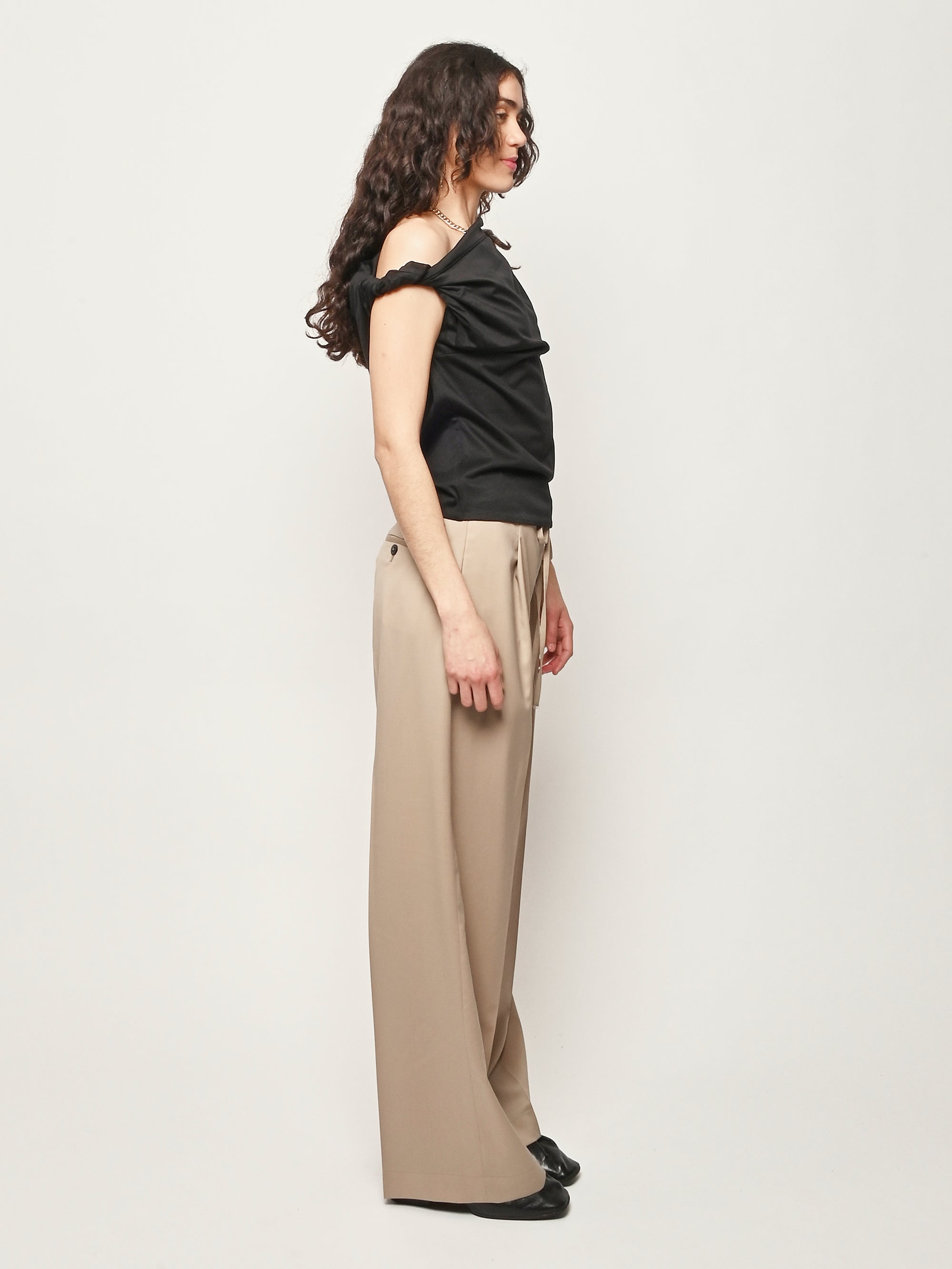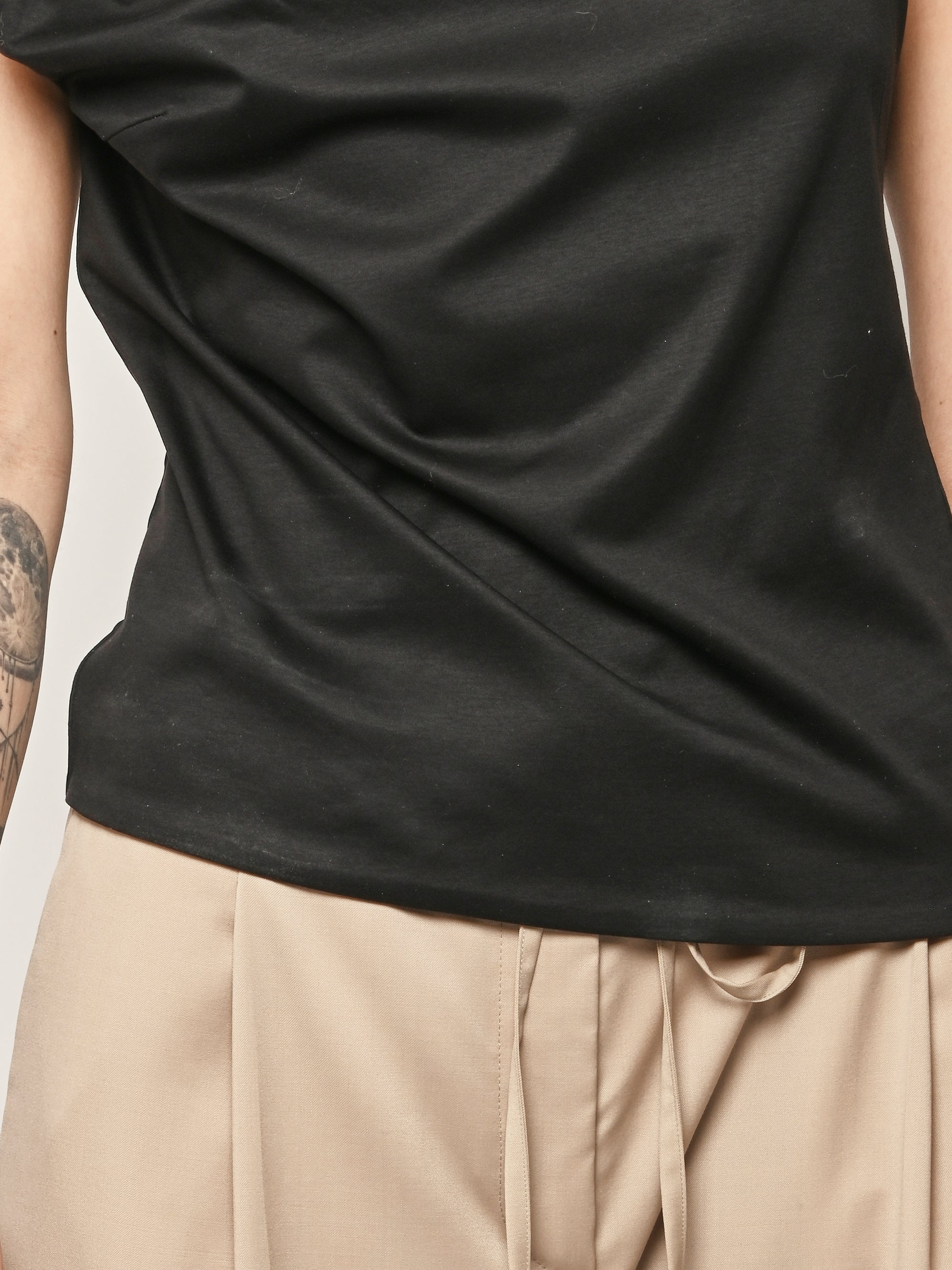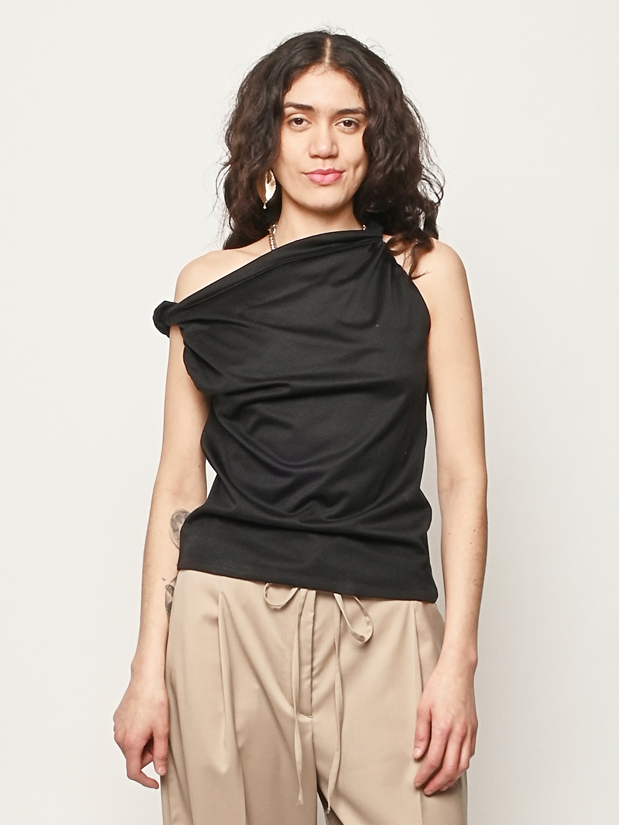 A drapey top from Róhe in a cotton-silk blend, defined by twisted strap details and a soft asymmetry as one sleeve falls off the shoulder, creating a relaxed, sculptural silhouette.
