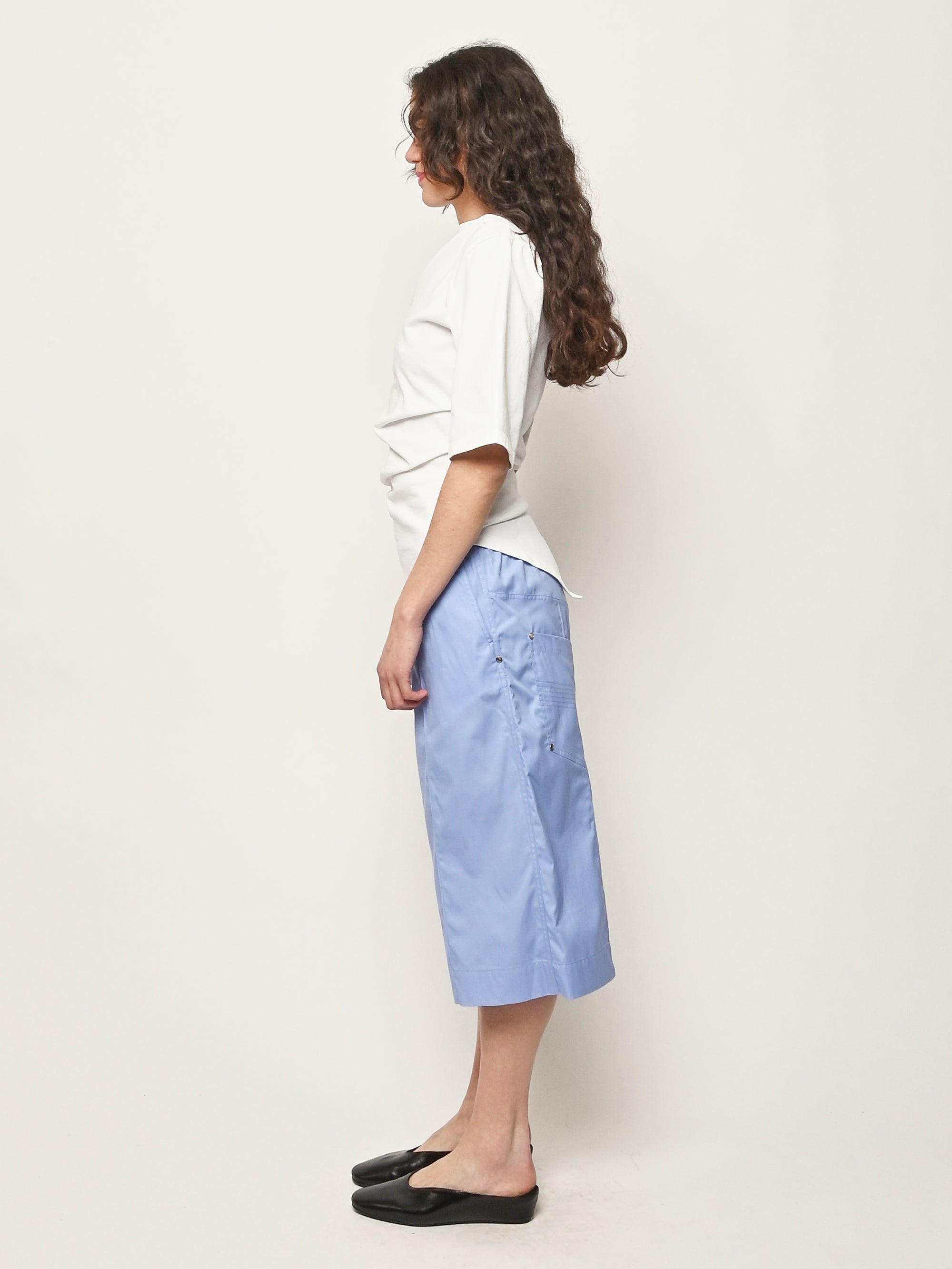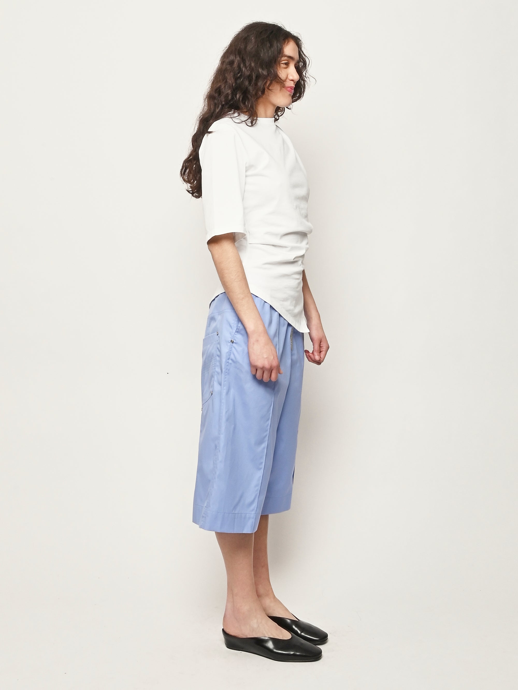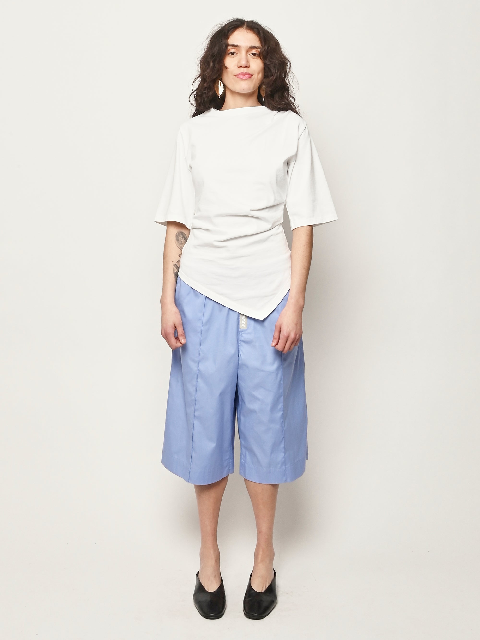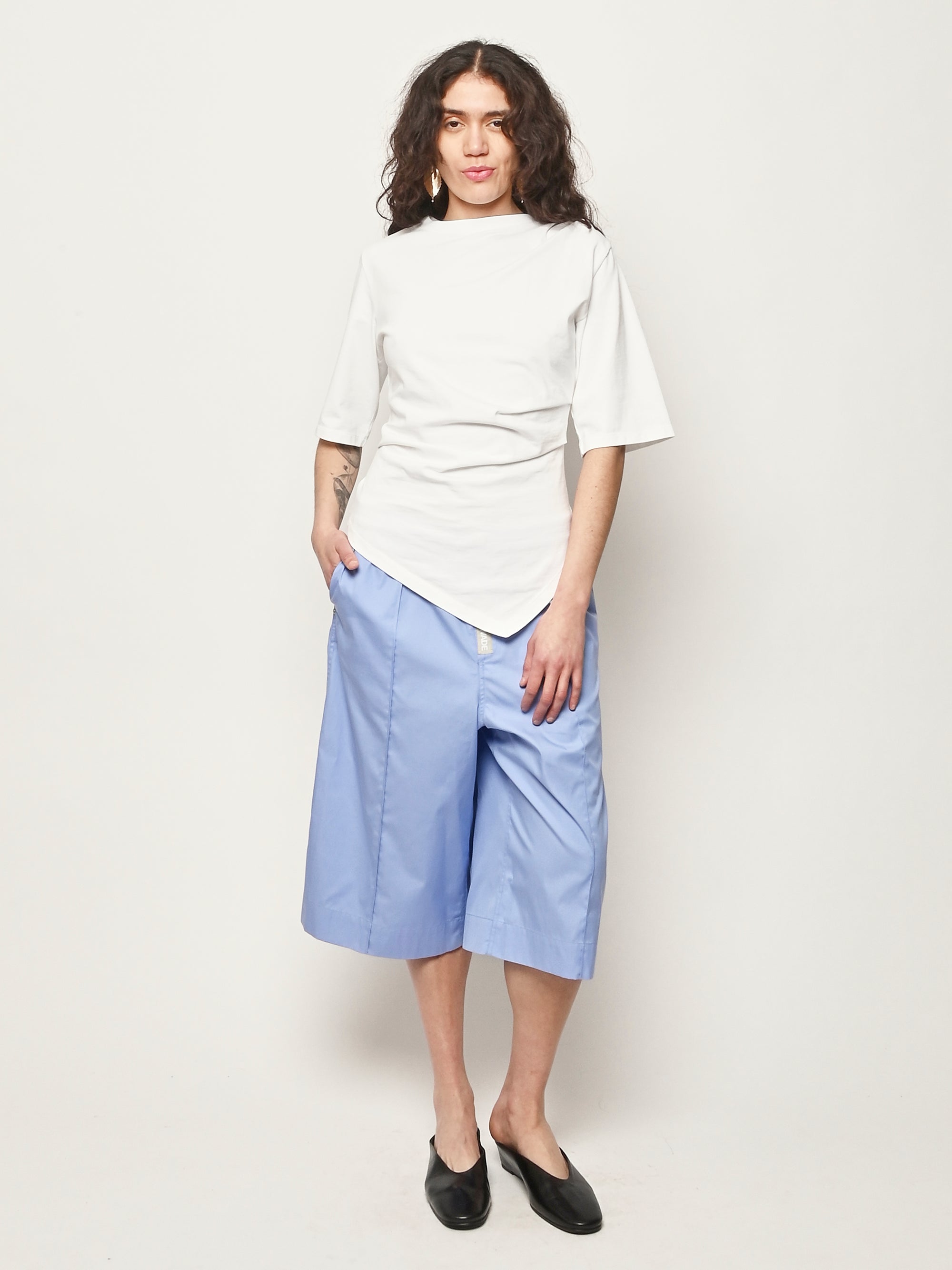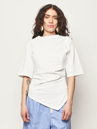 Róhe's sculptural update to the everyday T-shirt. Designed with a twisted asymmetrical drape that contours the waist and forms elegantly around the shape of the body, combining comfort with directional design.
