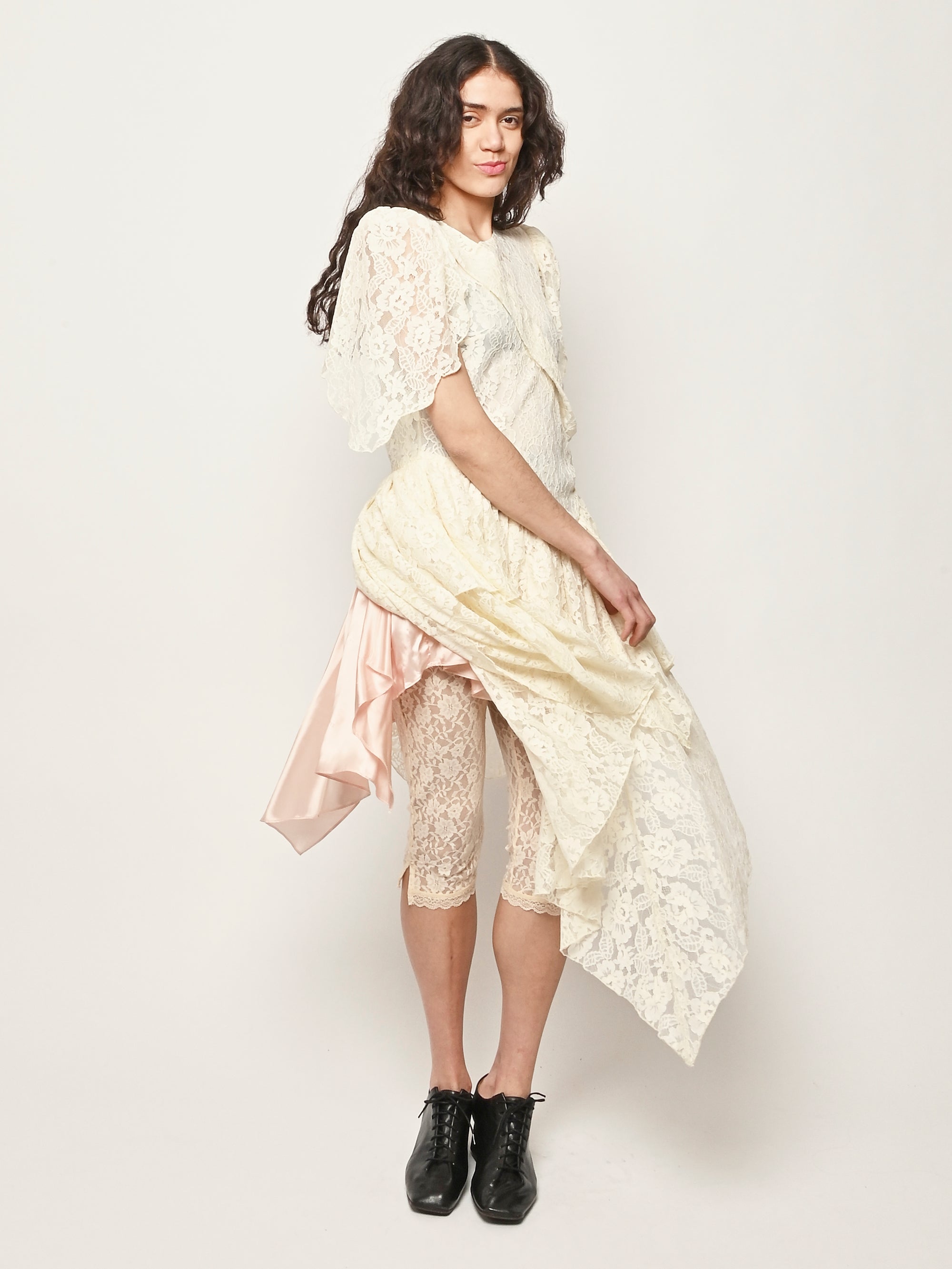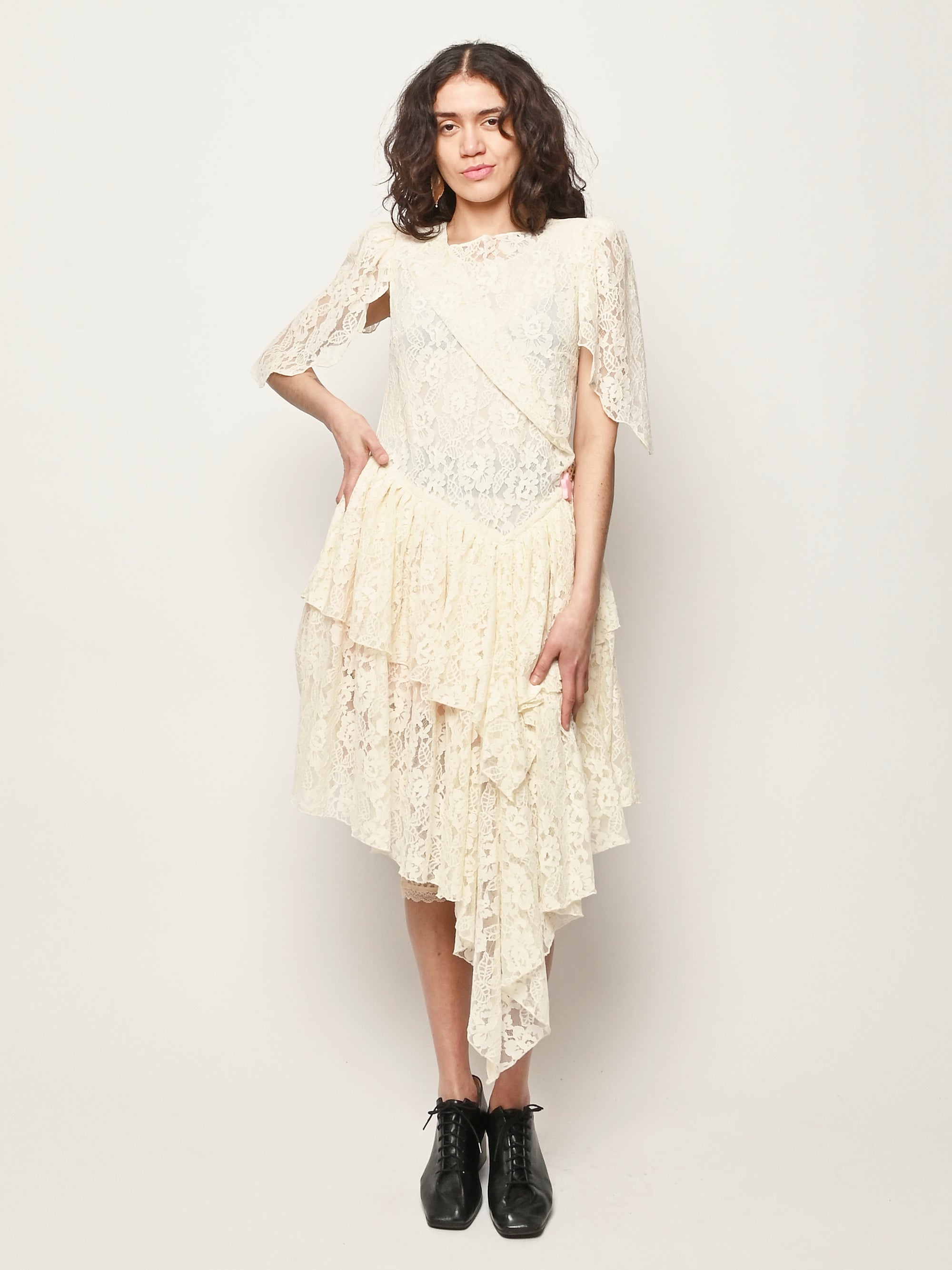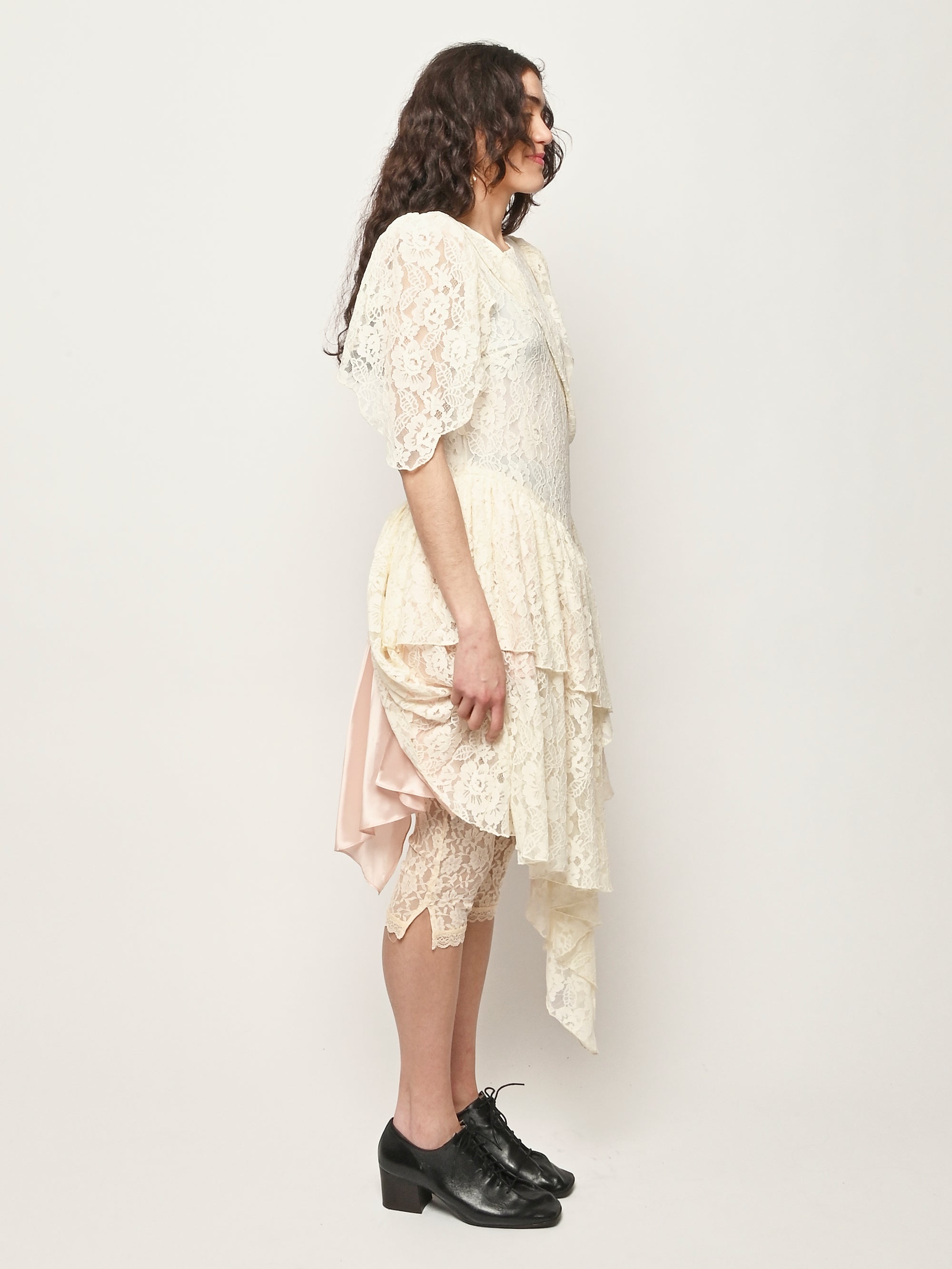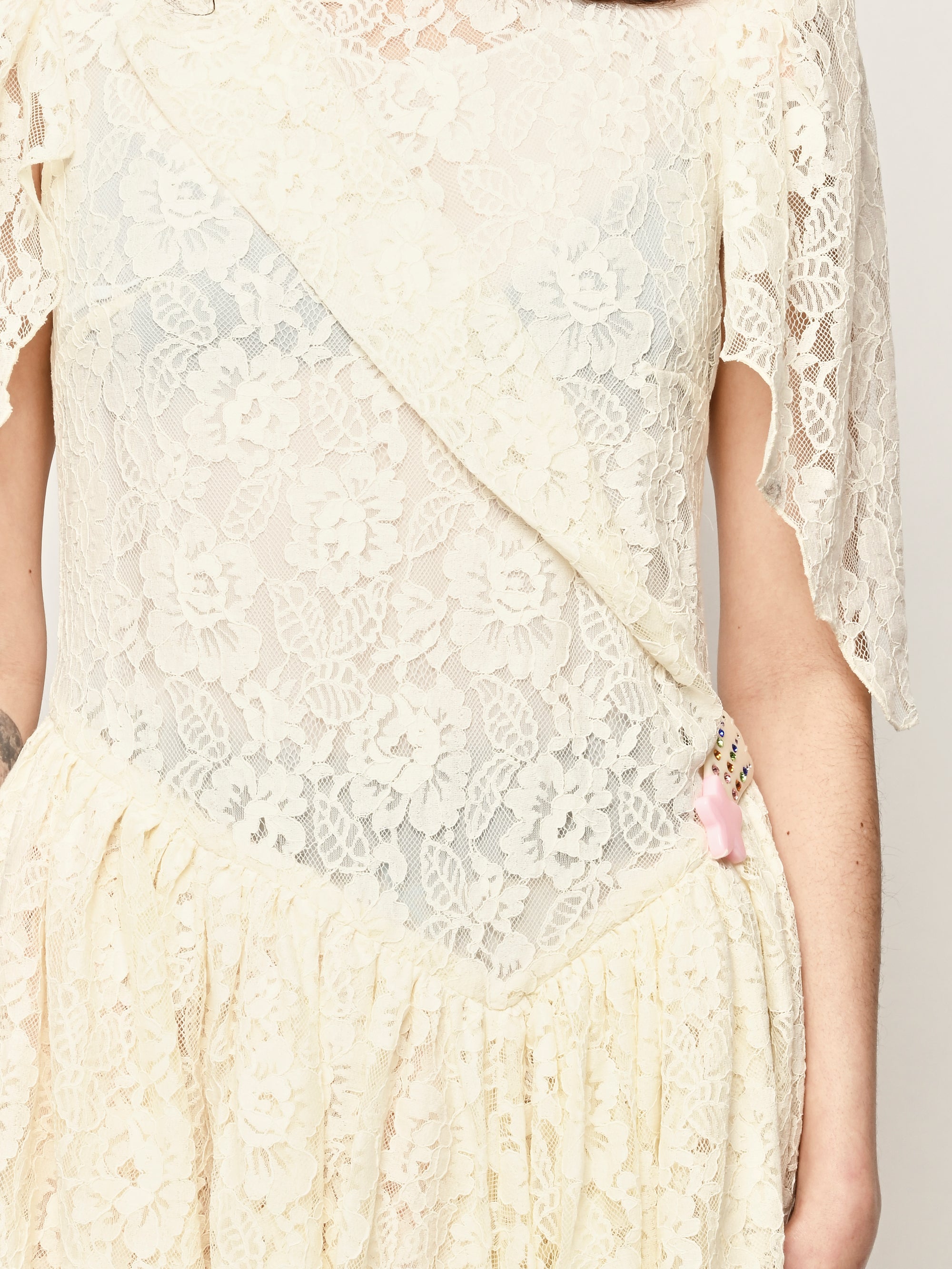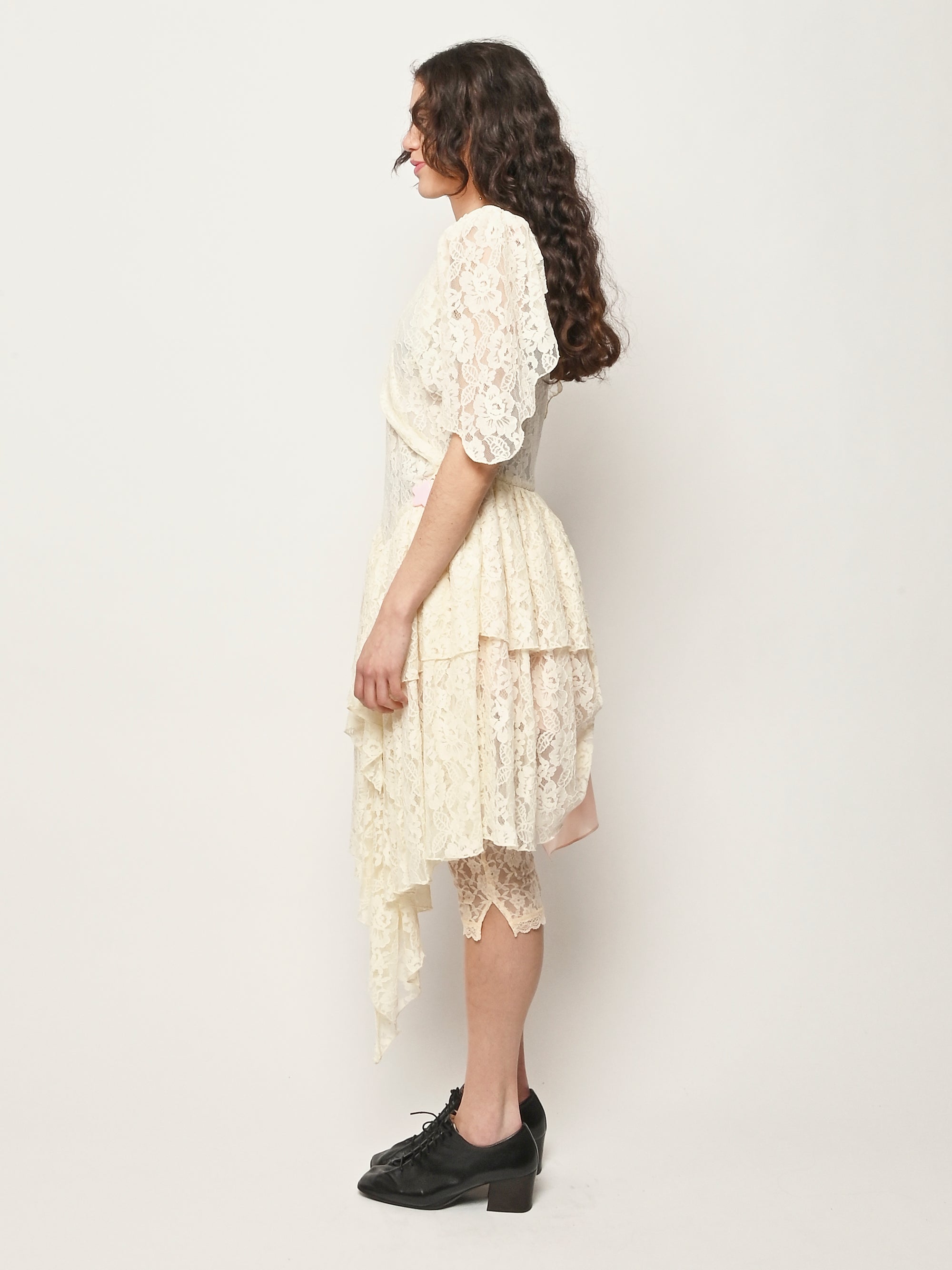Asymmetrical lace dress with hand draped details.