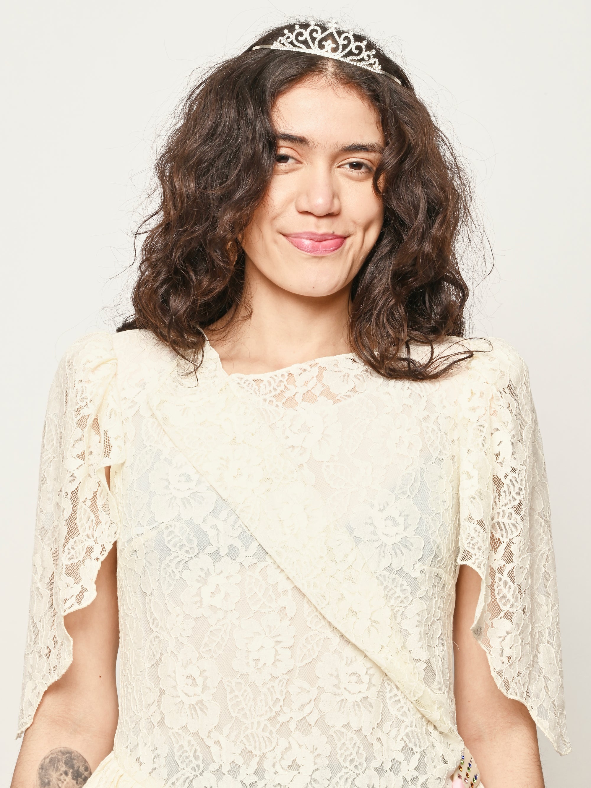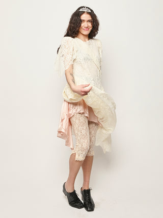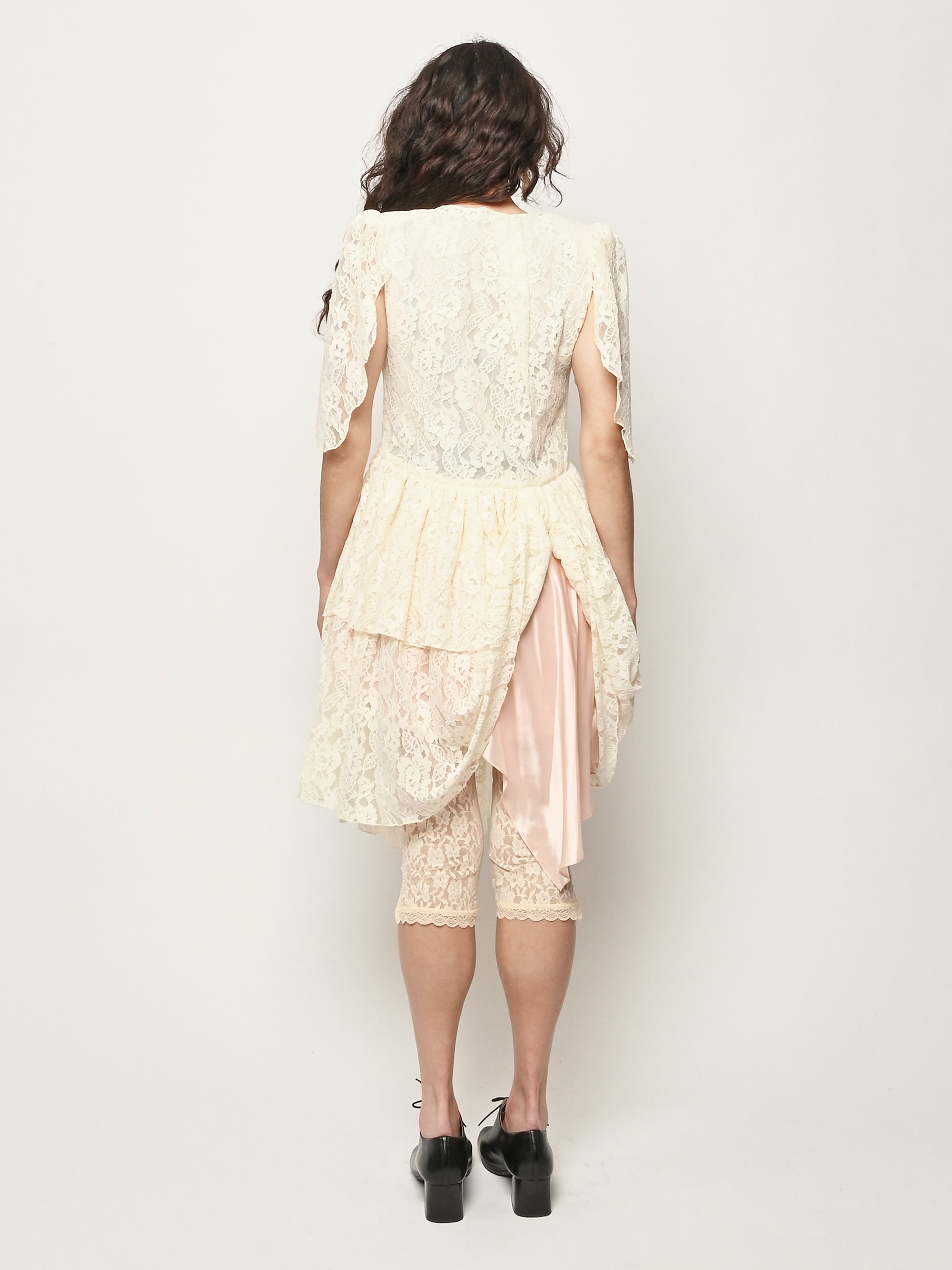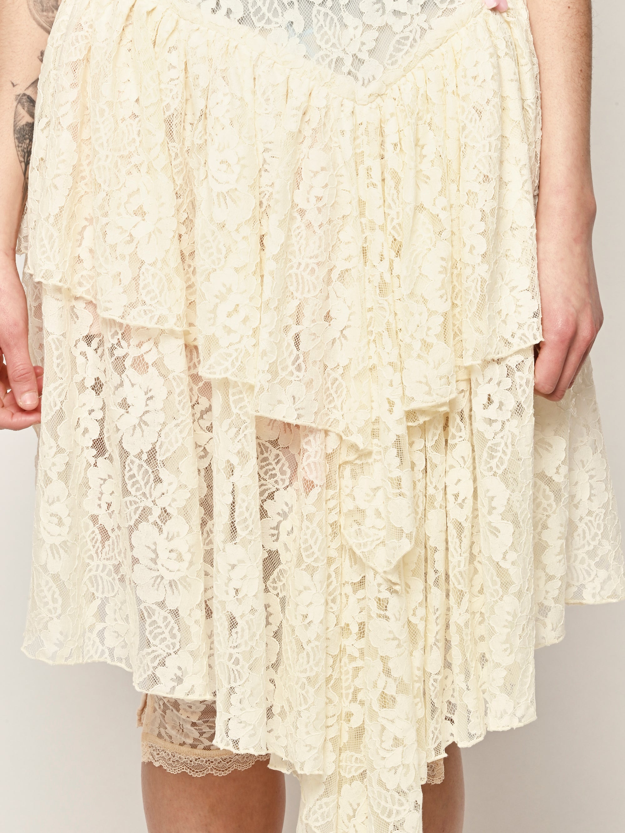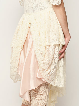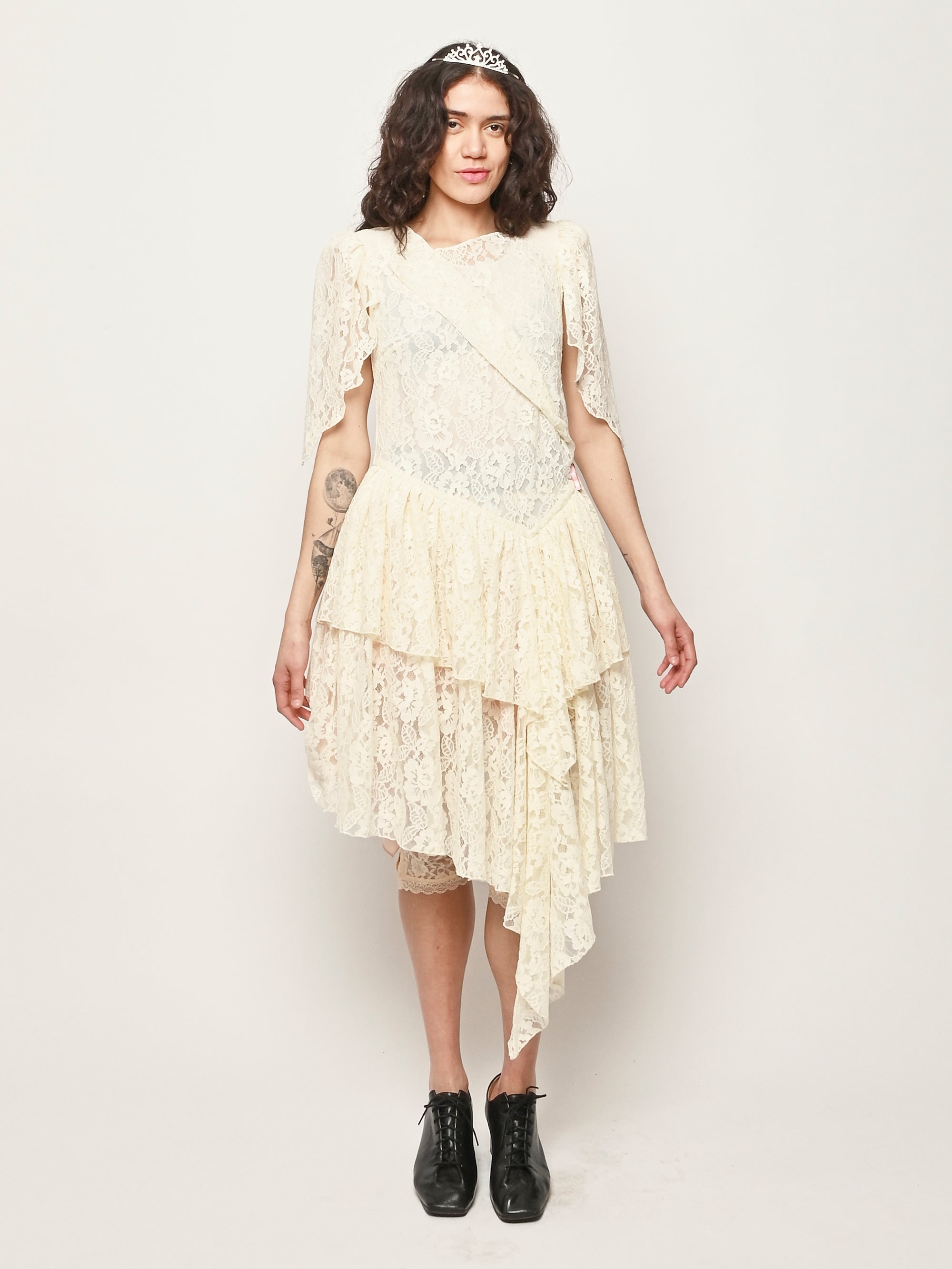 Asymmetrical lace dress with hand draped details.