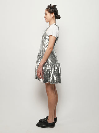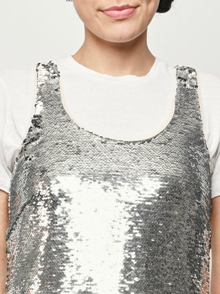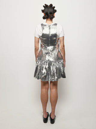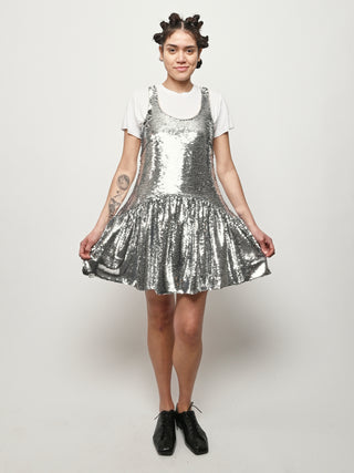 Mini tank dress encrusted in silver sequins, featuring a gathered peplum hem at the waist. Rear darts taper the silhouette, capturing the collection's youthful spirit with a sculpted finish.