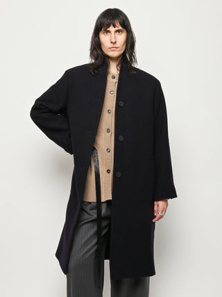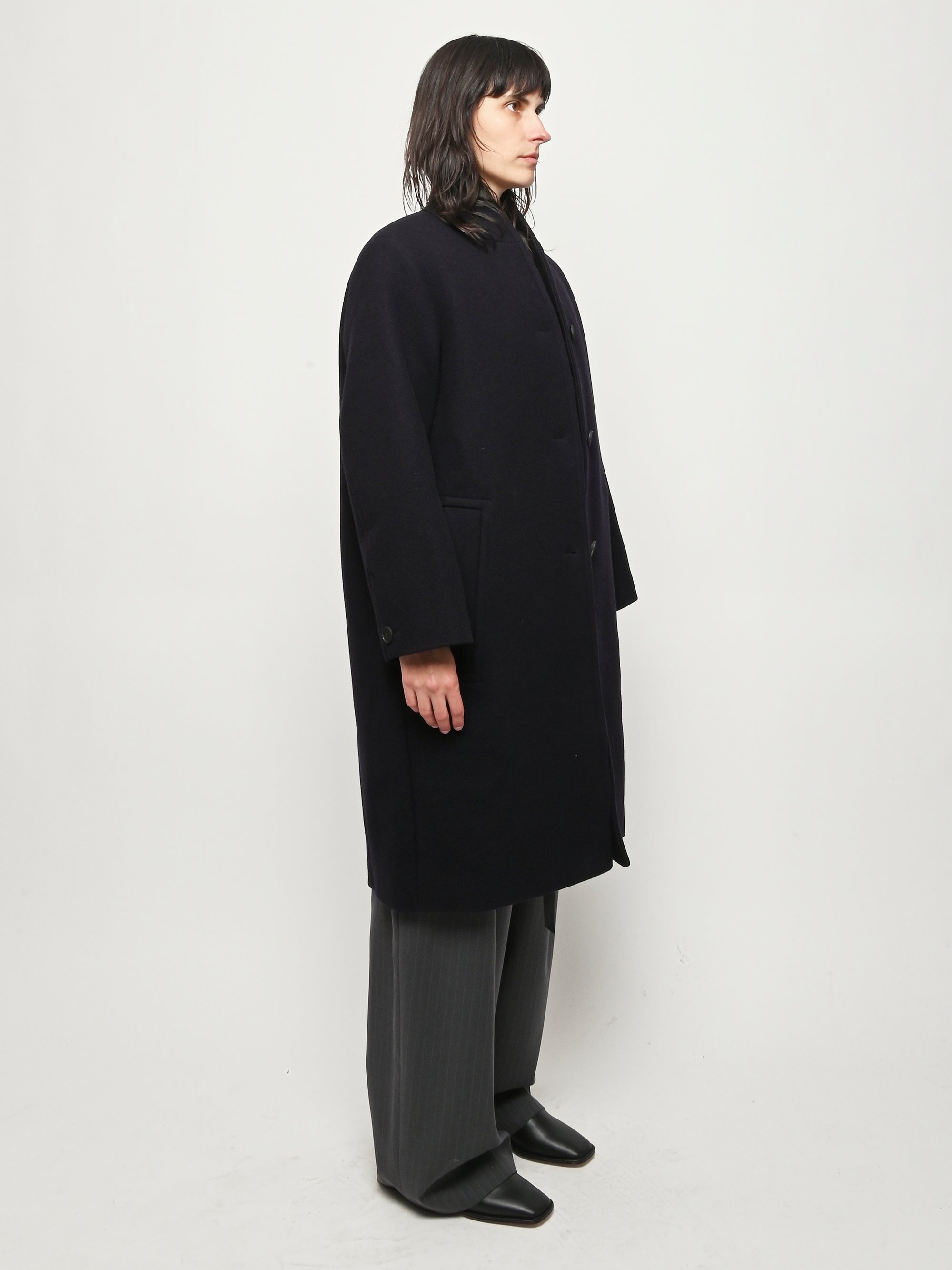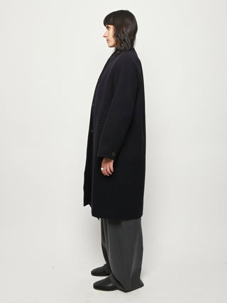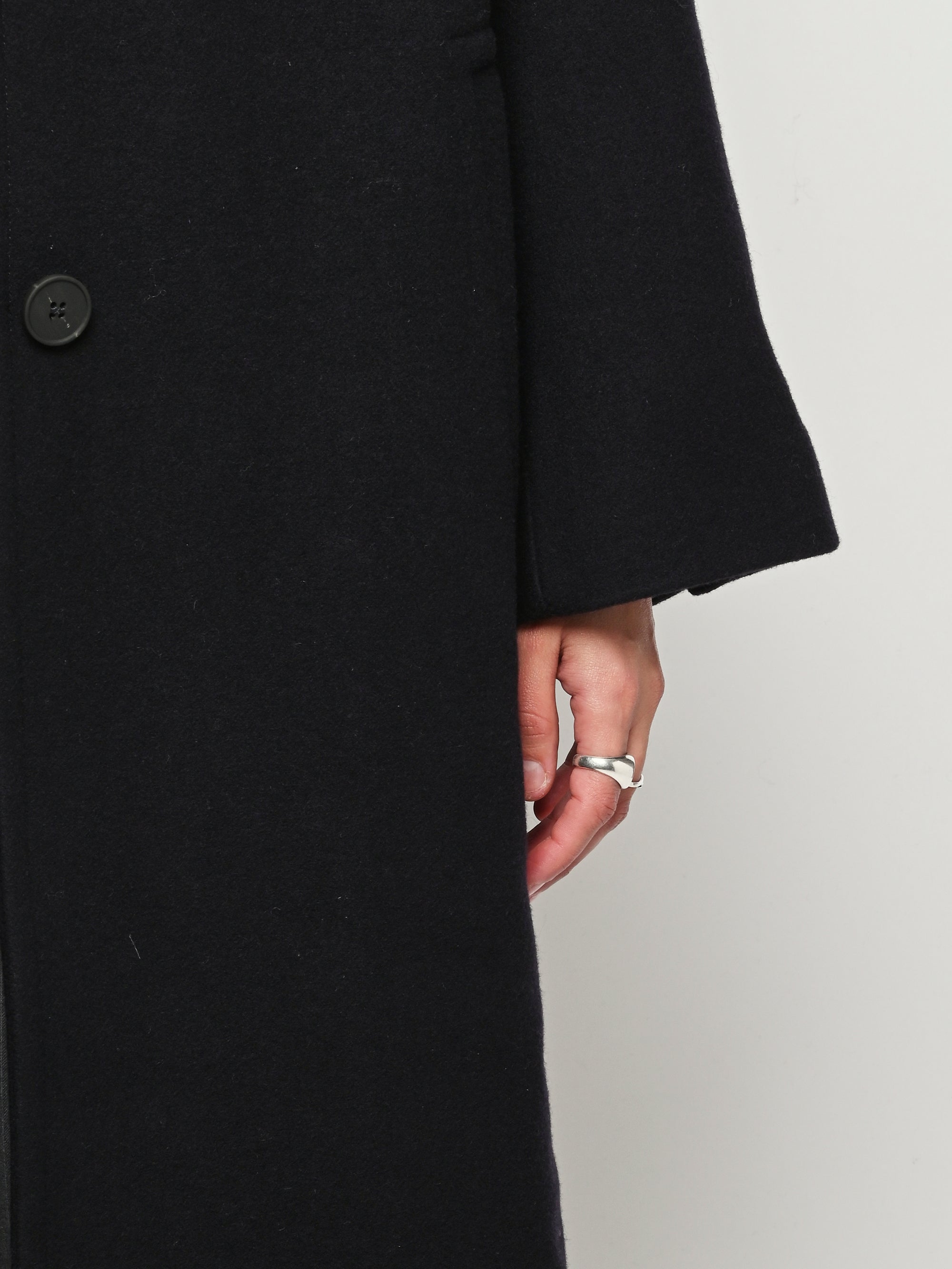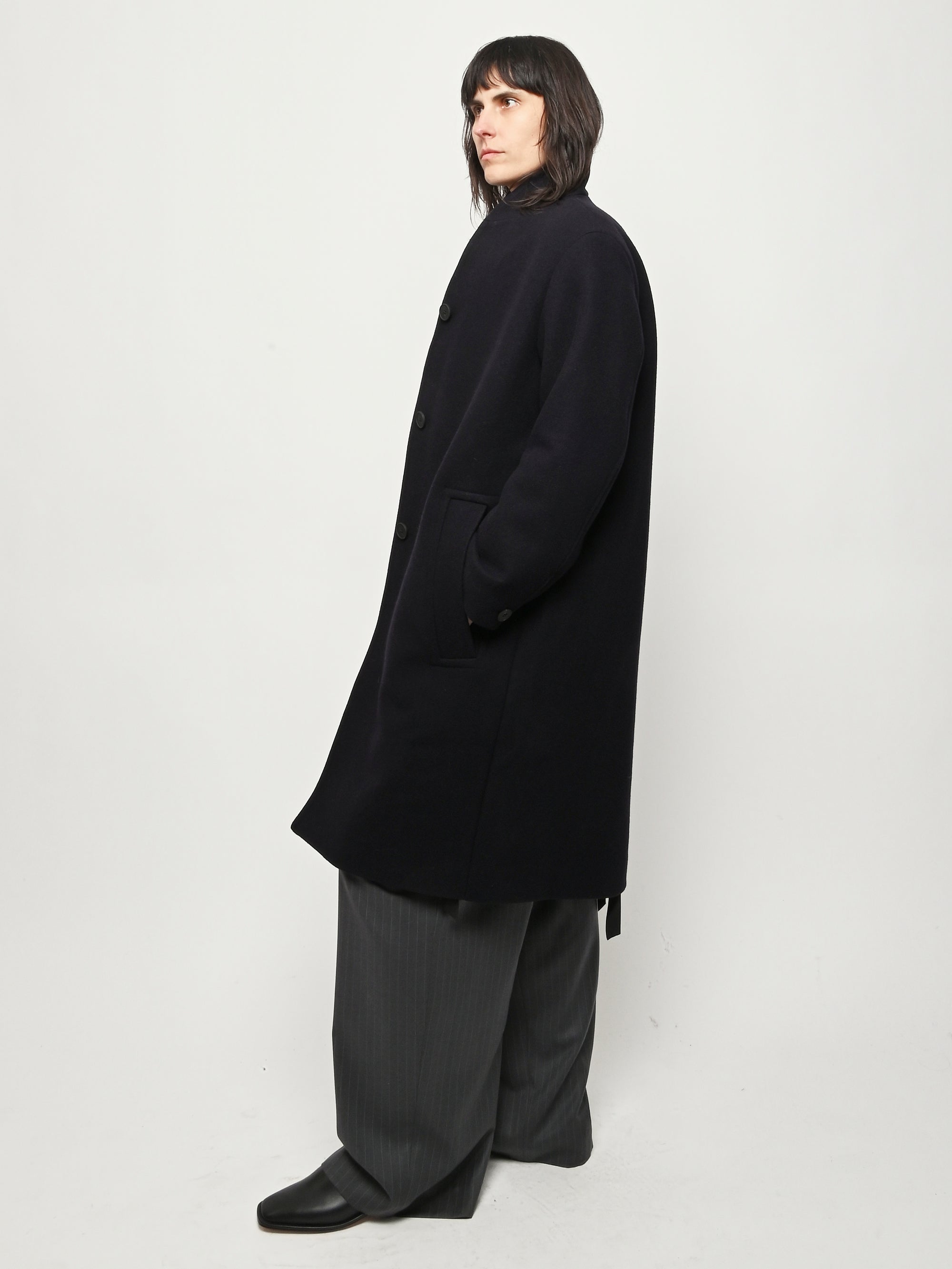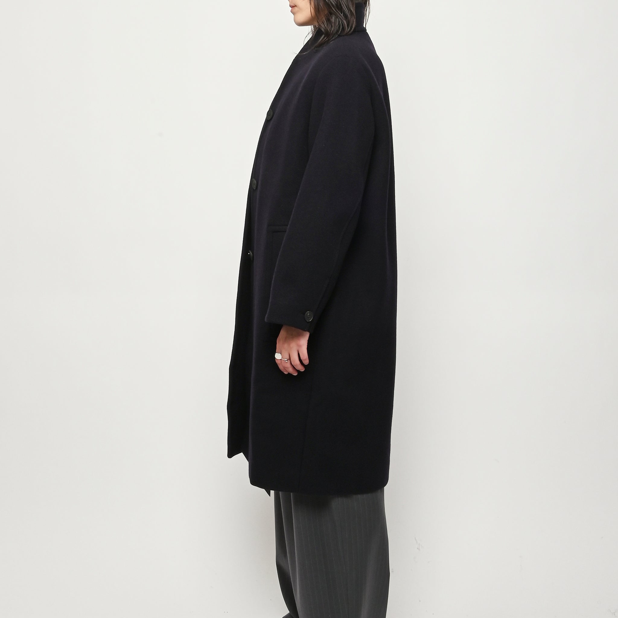 A streamlined take on a traditional tailored overcoat, The Morro Coat by Studio Nicholson is underpinned by their focus on quality fabrics. It’s cut from an Italian-milled double wool cashmere chosen for its satisfying heft and soft, luxurious hand feel. The coat is constructed with a raised collar and shaped with a gentle roll in the shoulder that accentuates the slim, softly cocooning silhouette.