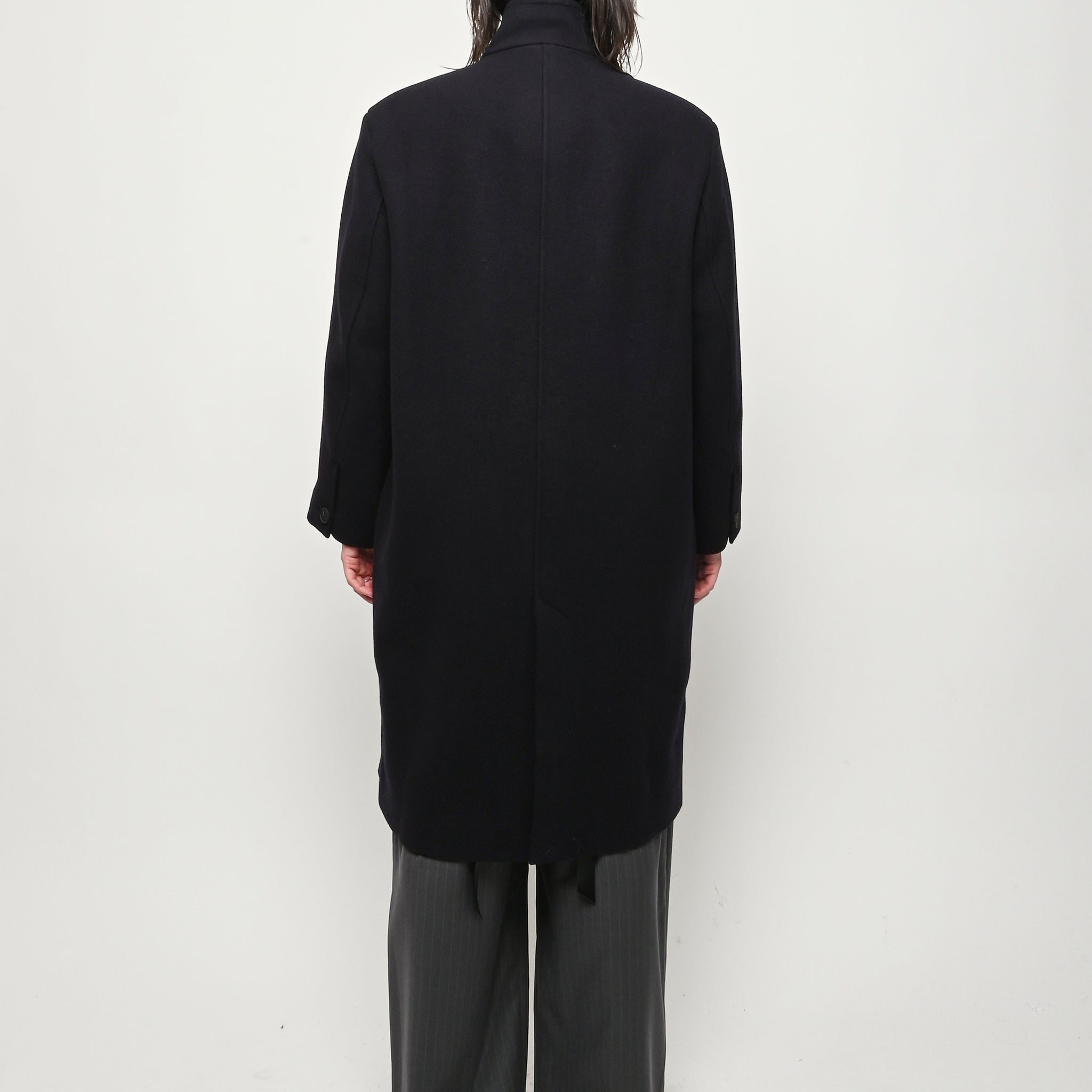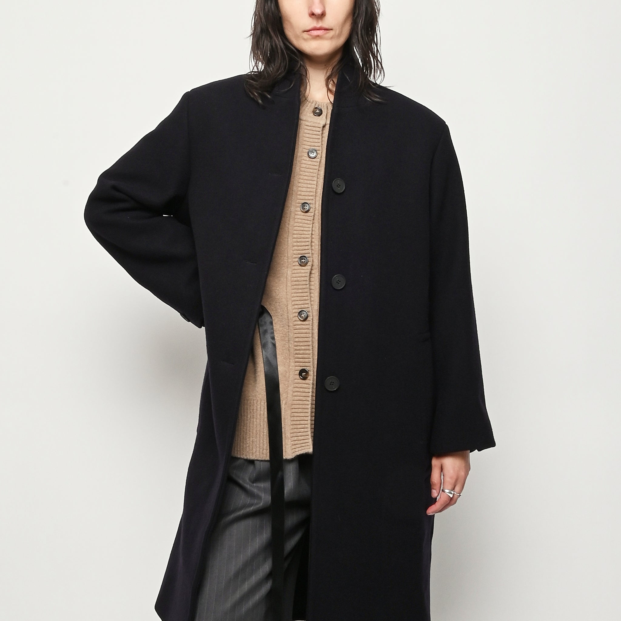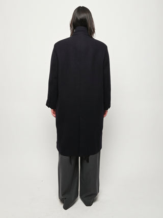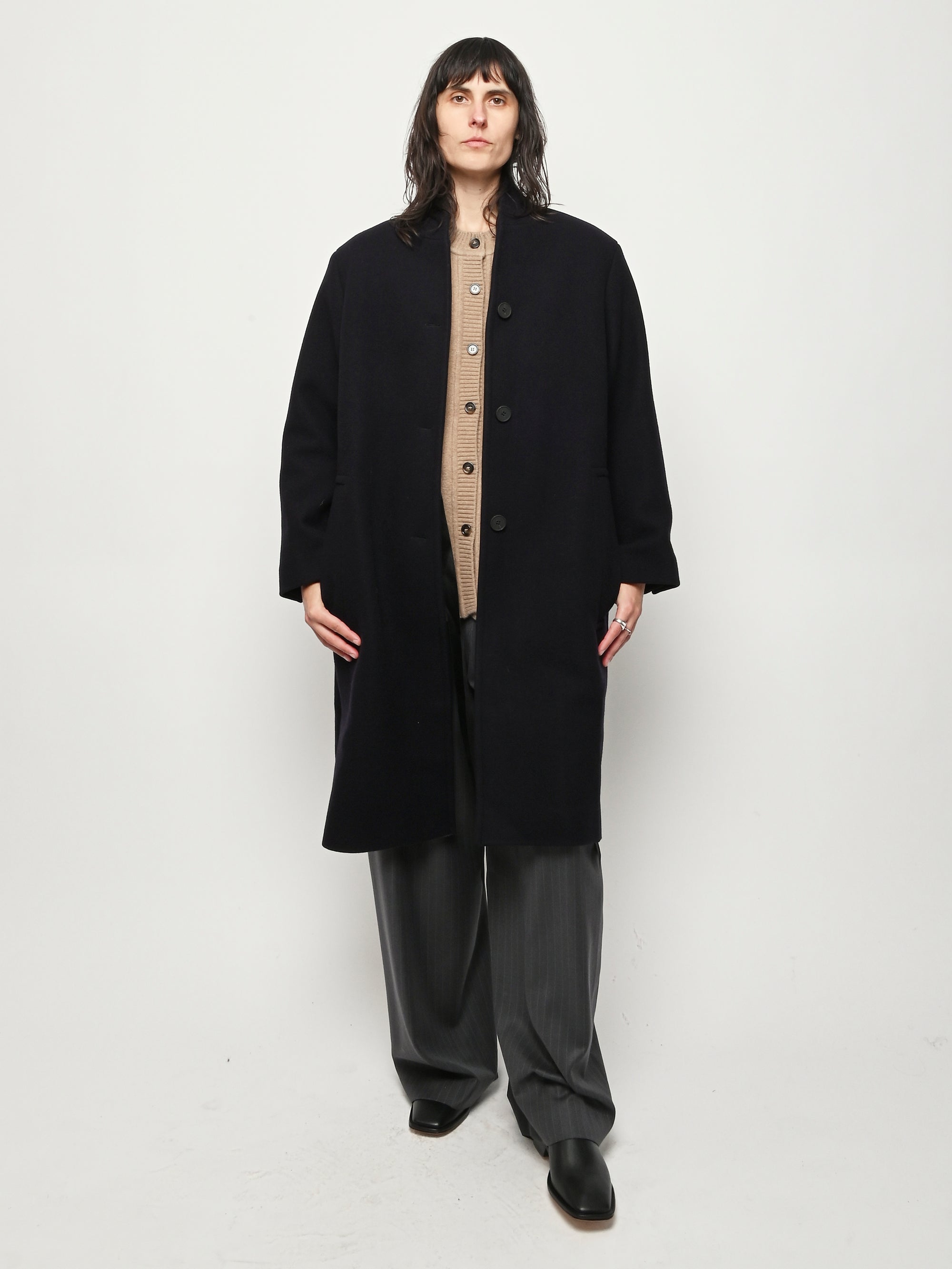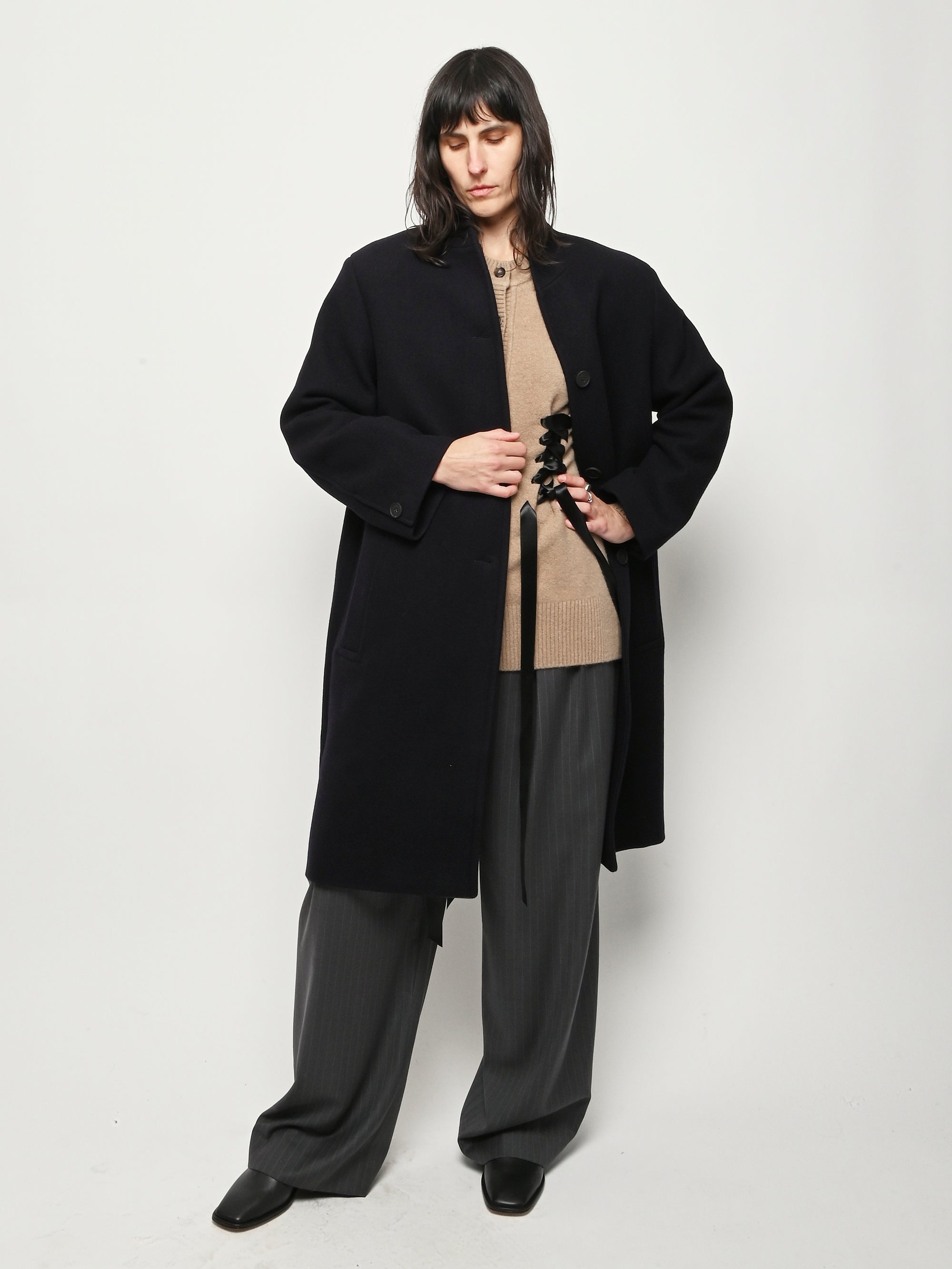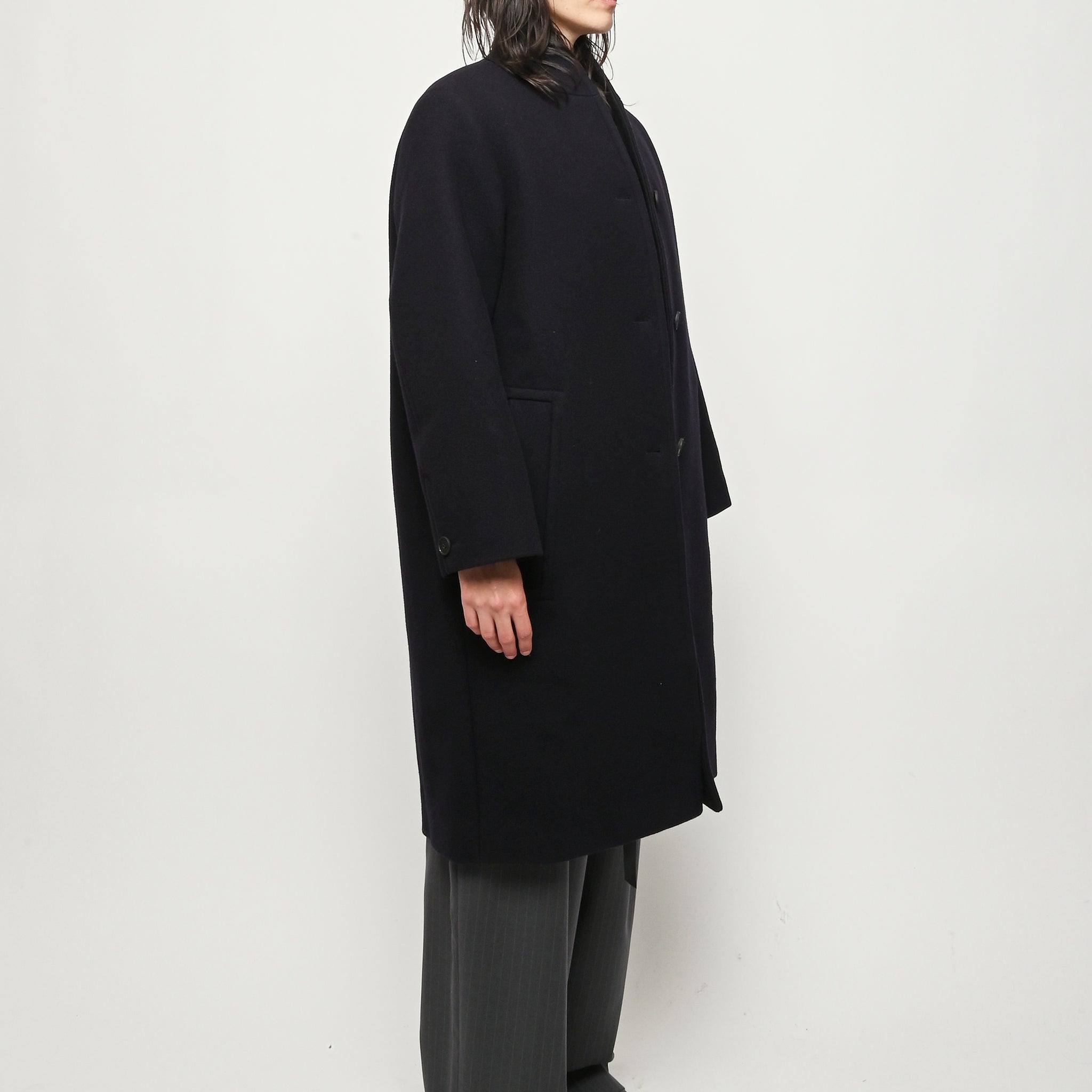A streamlined take on a traditional tailored overcoat, The Morro Coat by Studio Nicholson is underpinned by their focus on quality fabrics. It’s cut from an Italian-milled double wool cashmere chosen for its satisfying heft and soft, luxurious hand feel. The coat is constructed with a raised collar and shaped with a gentle roll in the shoulder that accentuates the slim, softly cocooning silhouette.