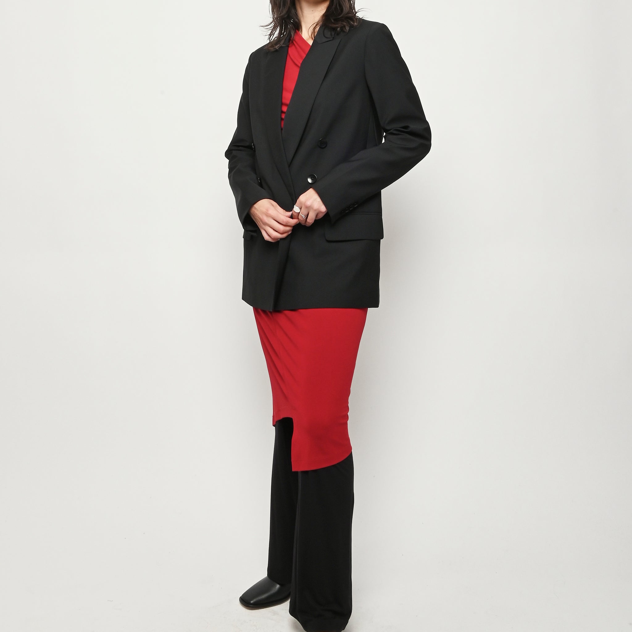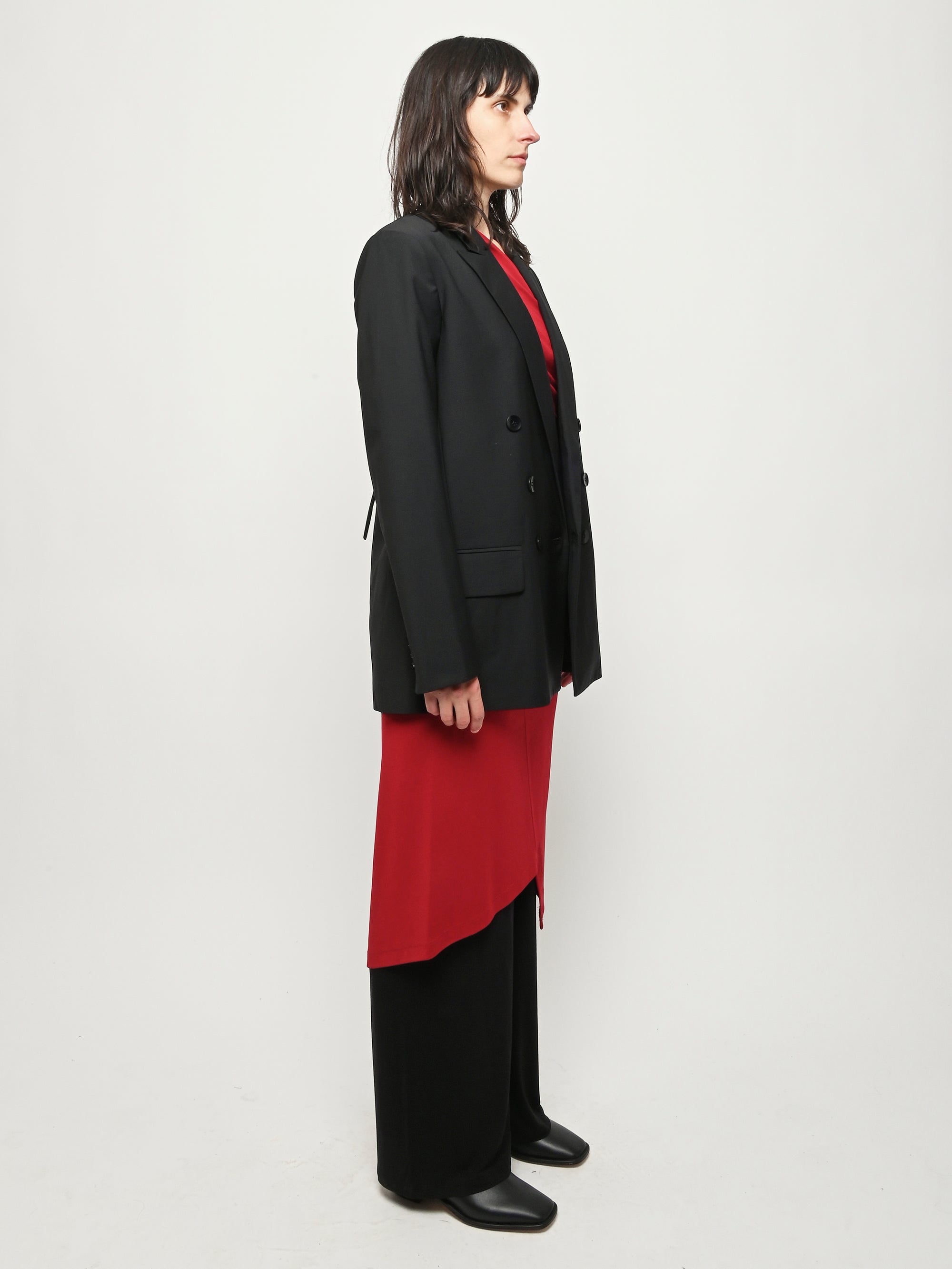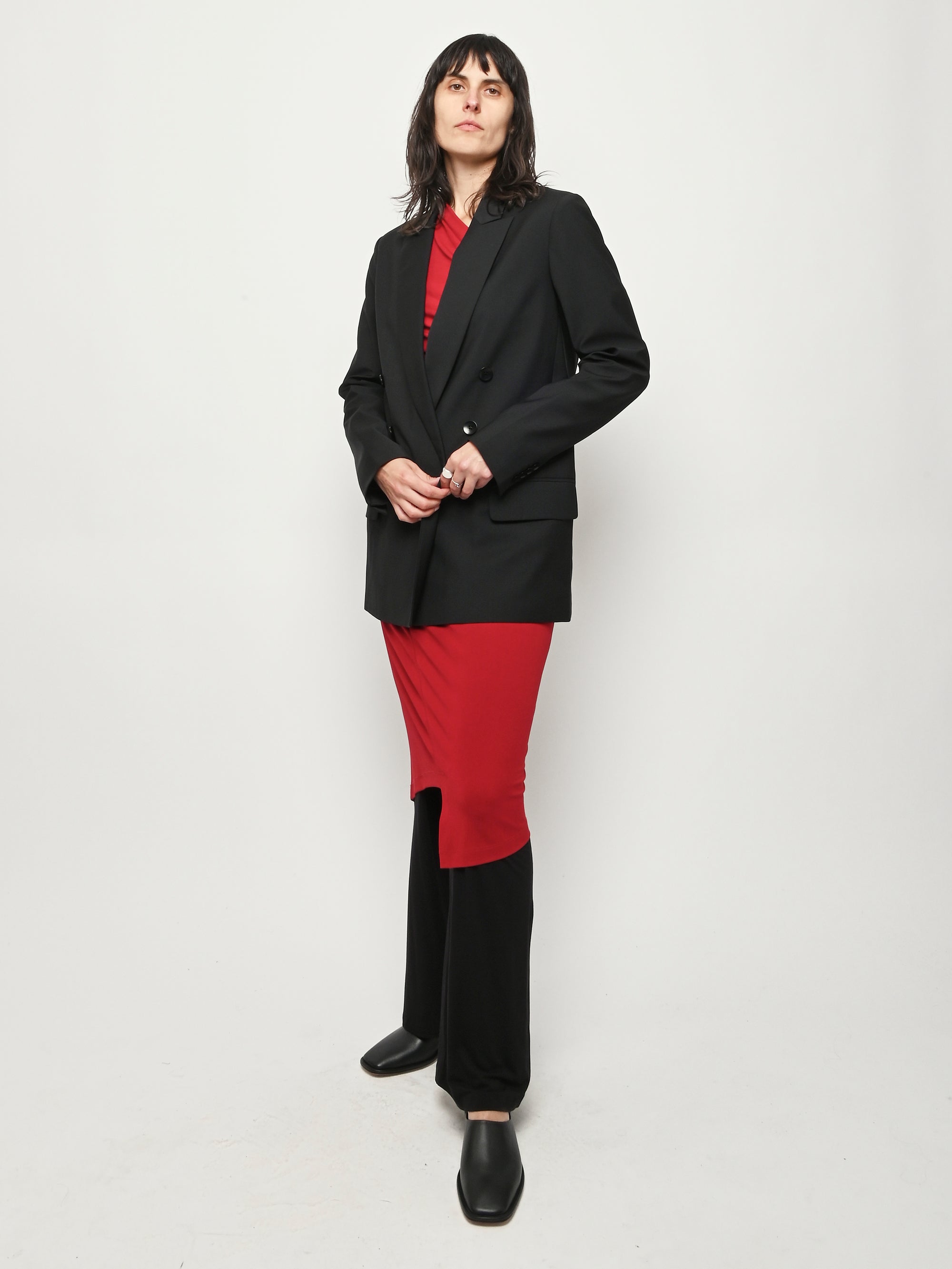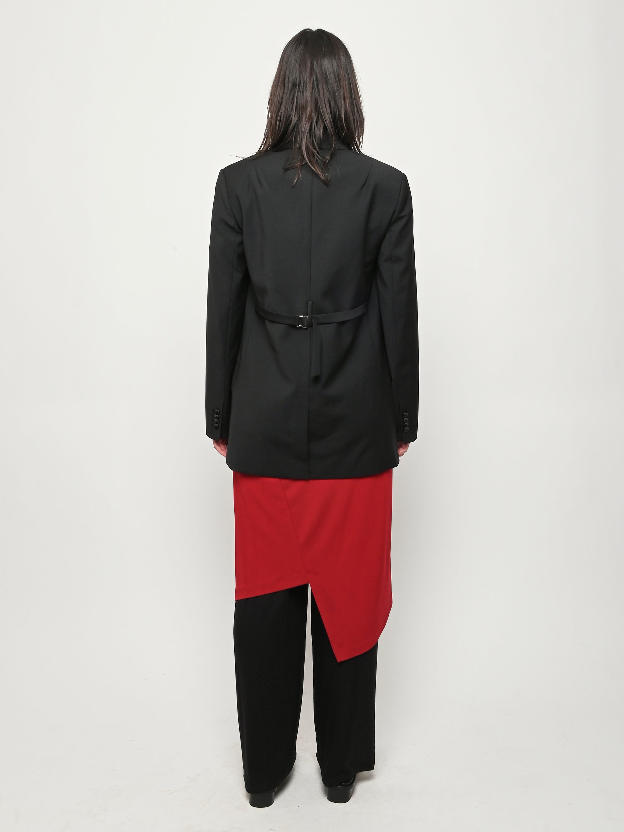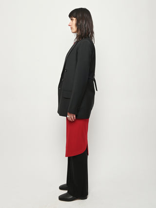 Crafted from recycled tropical wool, this Tibi blazer blends classic tailoring with modern detail. Featuring a defined silhouette enhanced by a back belt, it adds subtle structure and a flattering shape. Wear it with the coordinating trouser or skirt for a refined suiting set or layer over your favorite knits for an elevated everyday look.
