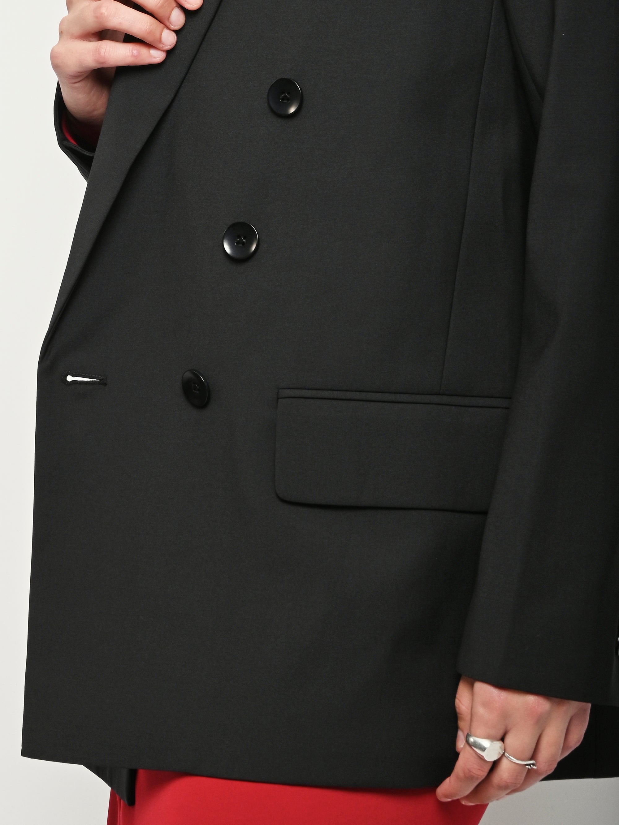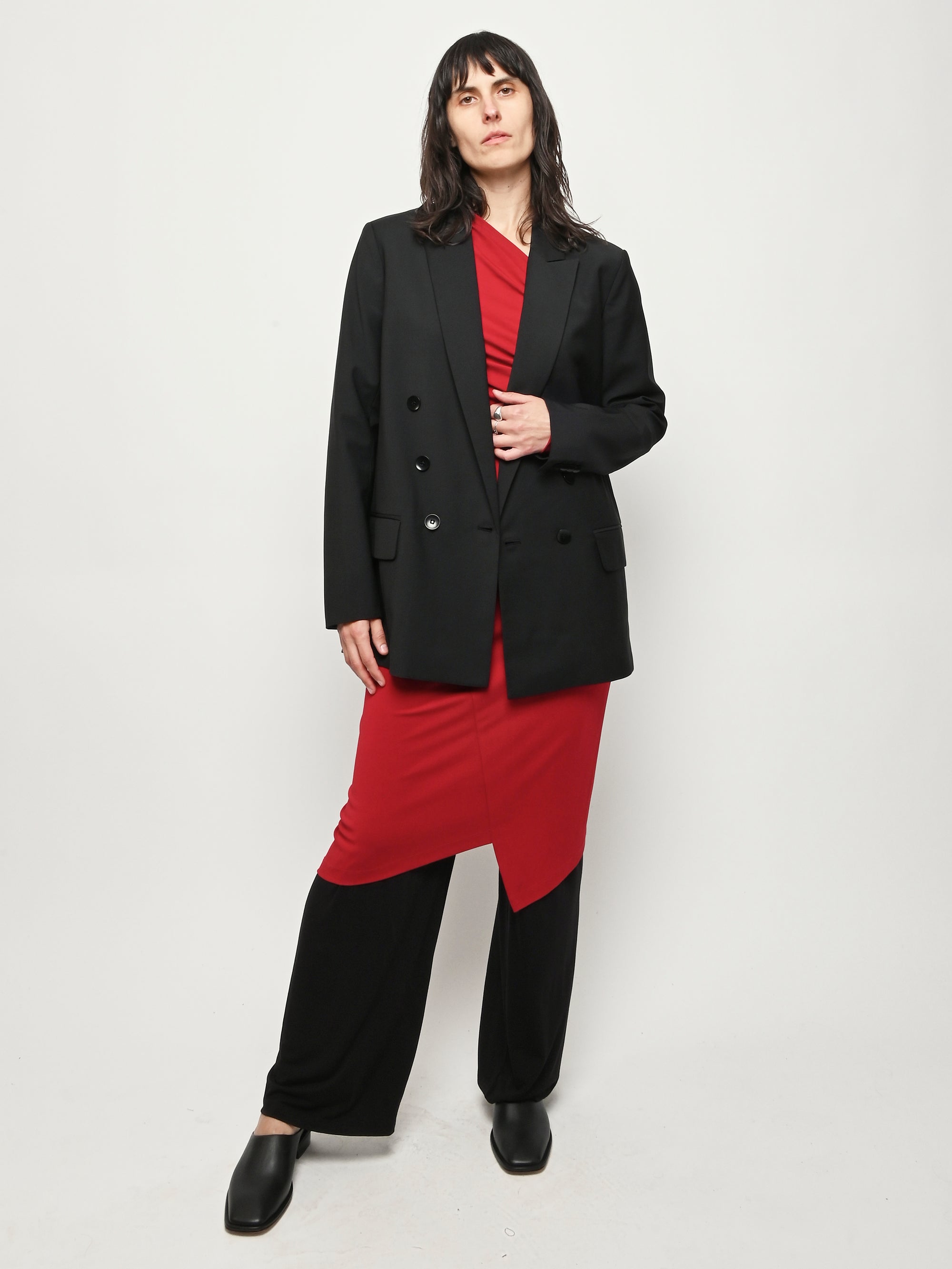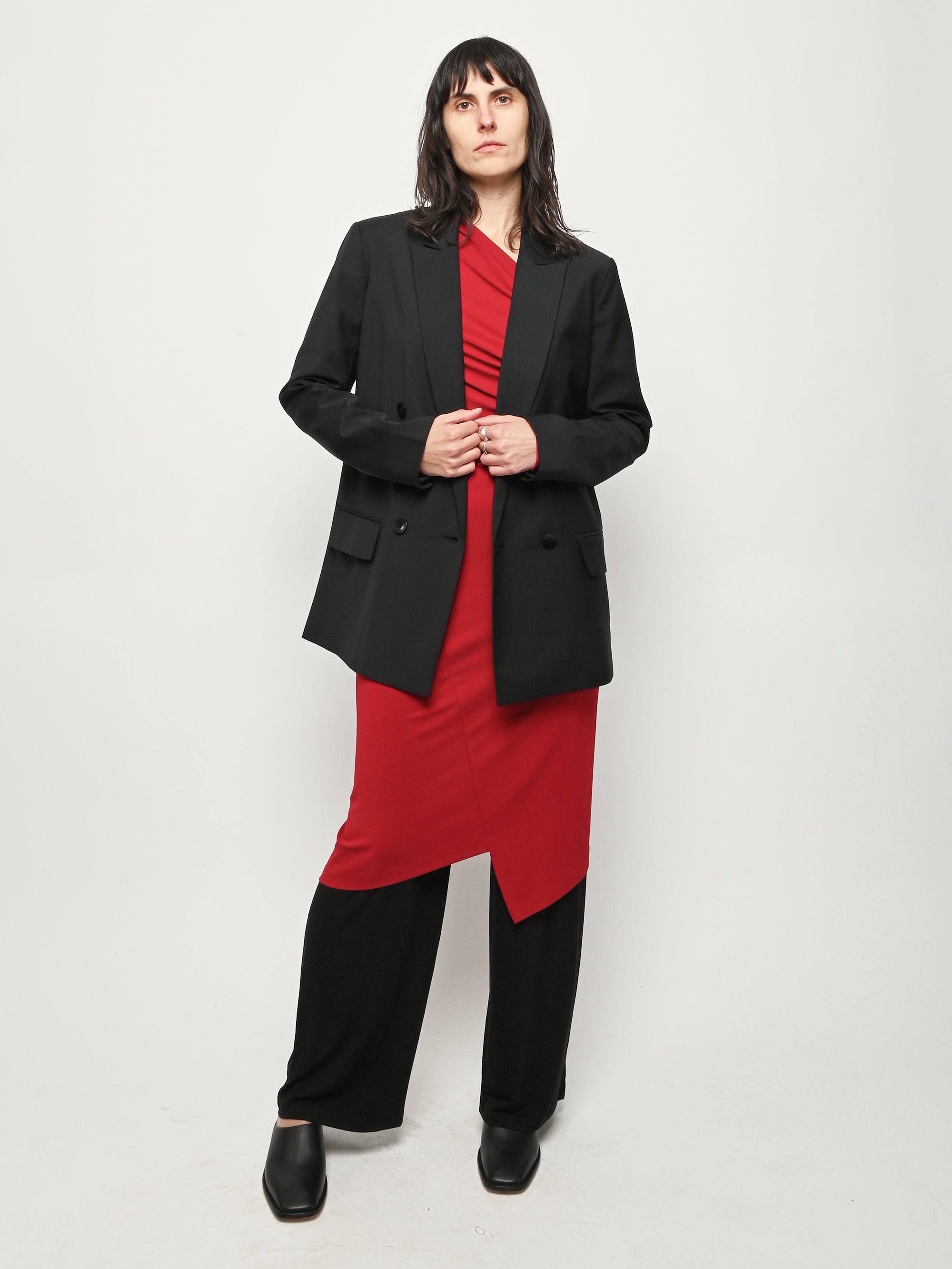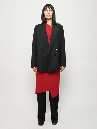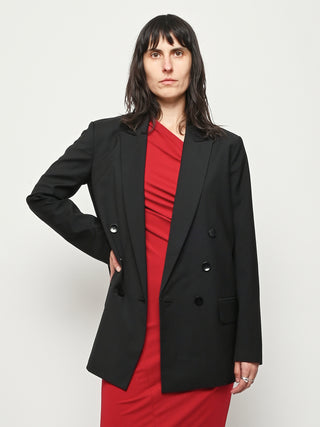 Crafted from recycled tropical wool, this Tibi blazer blends classic tailoring with modern detail. Featuring a defined silhouette enhanced by a back belt, it adds subtle structure and a flattering shape. Wear it with the coordinating trouser or skirt for a refined suiting set or layer over your favorite knits for an elevated everyday look.