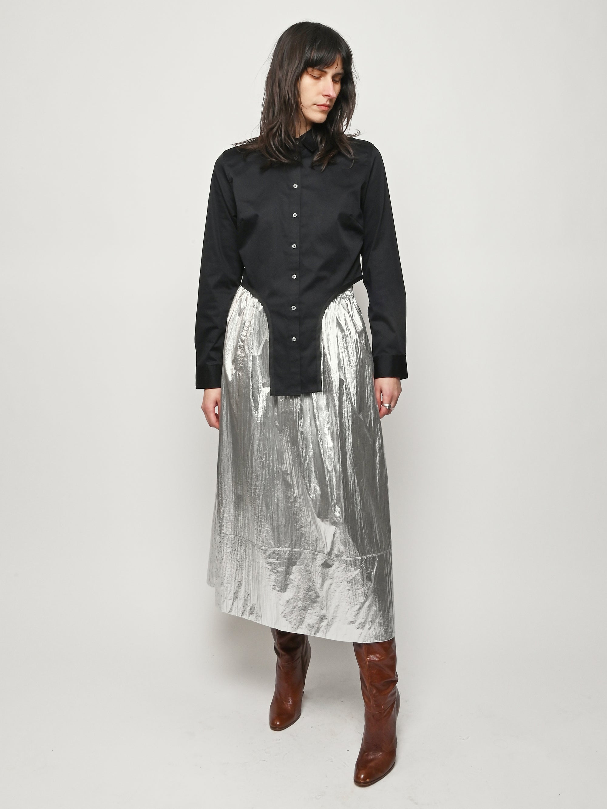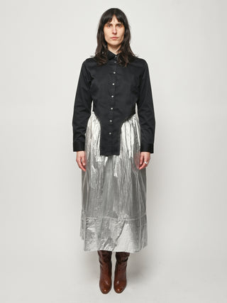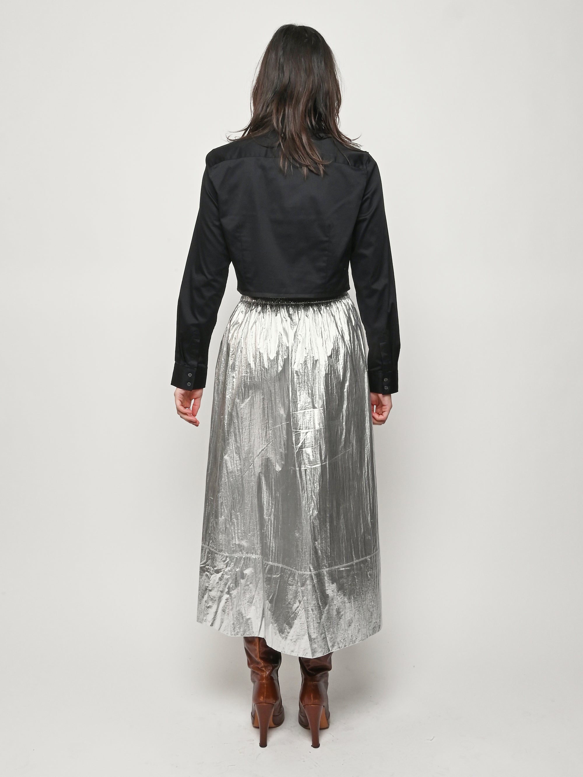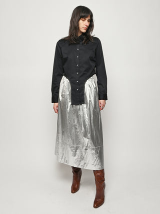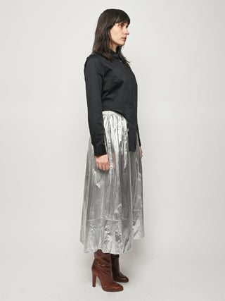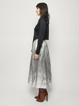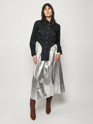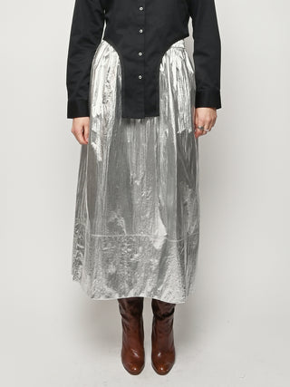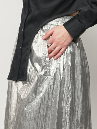 Surprisingly lightweight by design, the Silver Metallic Nylon Pull On Full Skirt by Tibi reimagines their best-selling silhouette in a premium metallic nylon with high-shine silver foil finish.